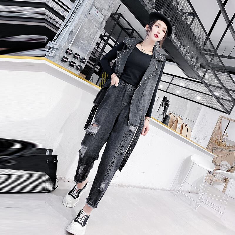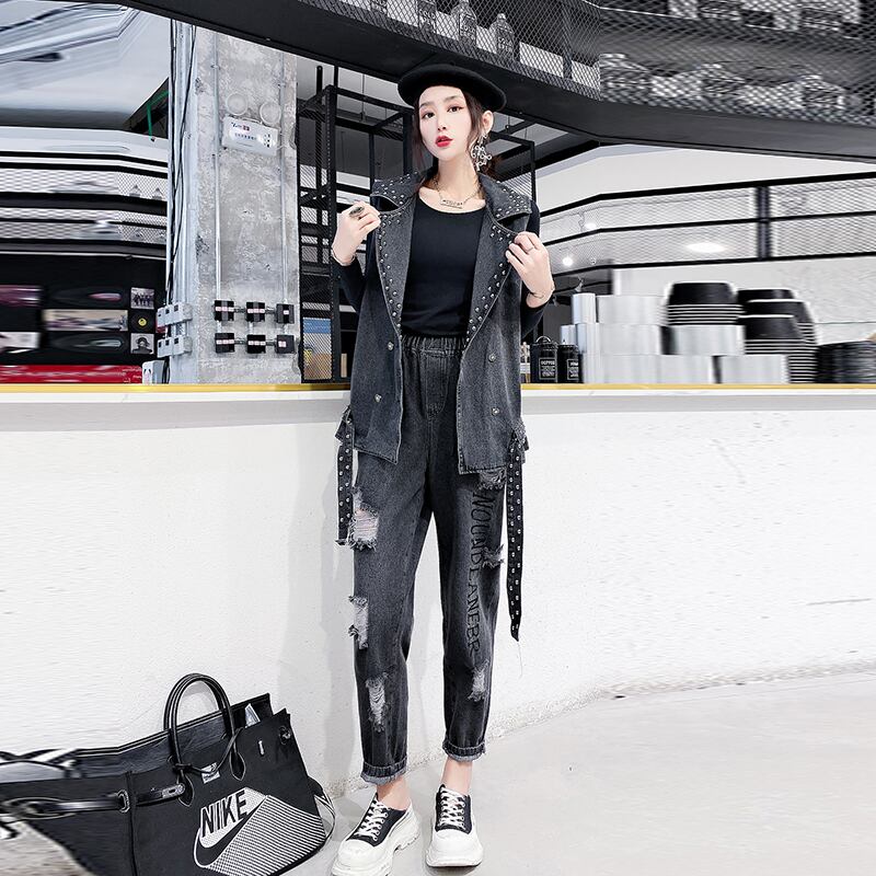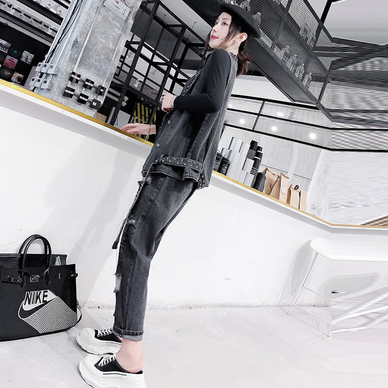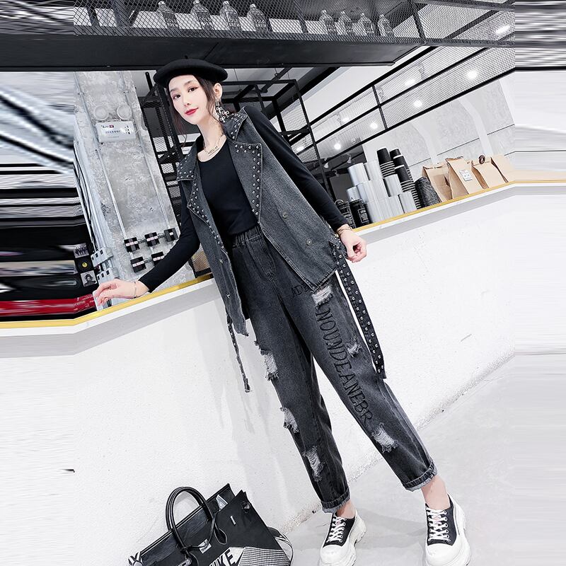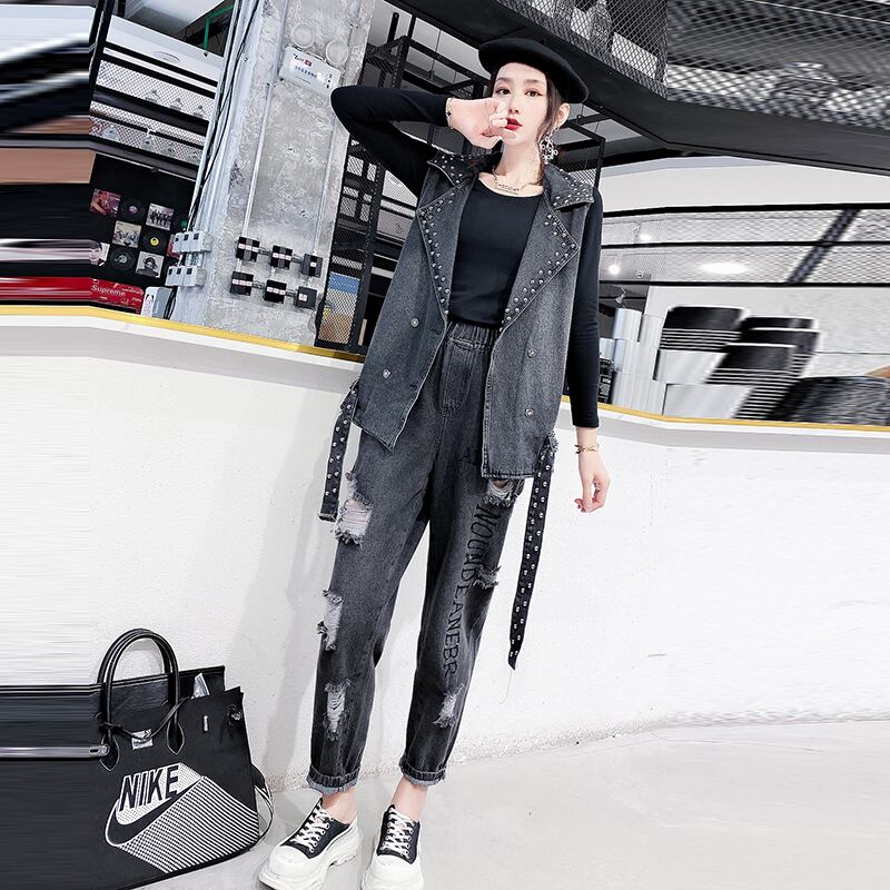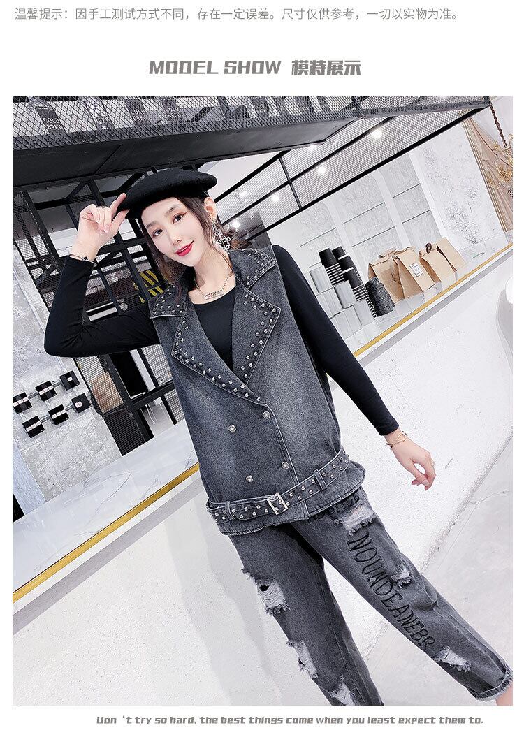 ファットmmデニムチョッキ2020年秋冬新作スリムツーピーススーツプラスサイズハイトップパンツ ミックスインファッション74156893146