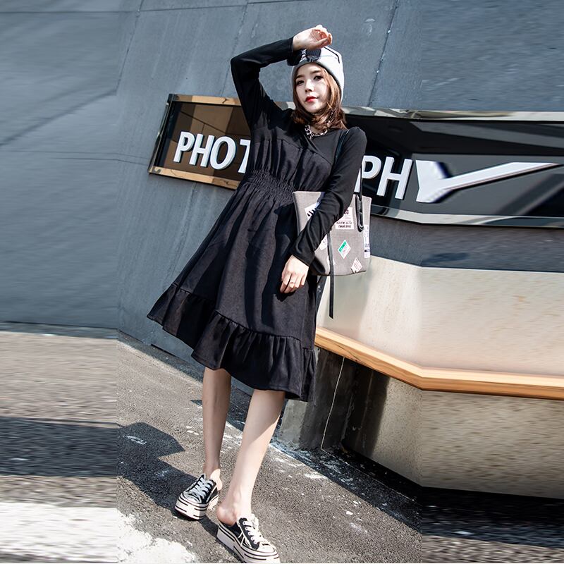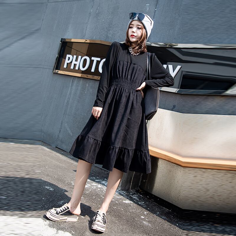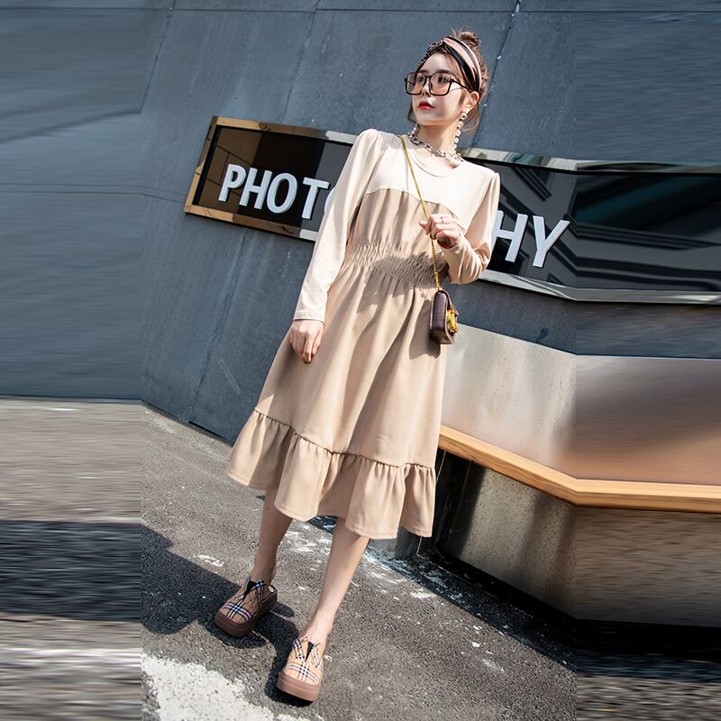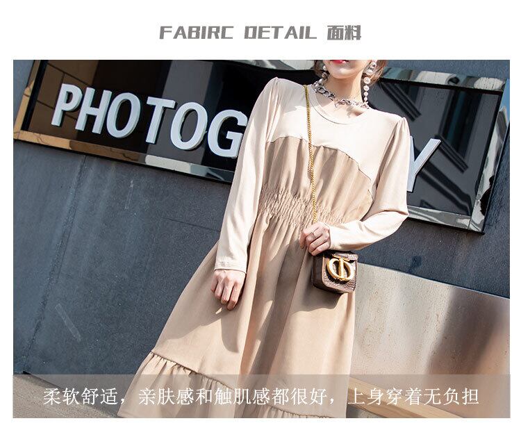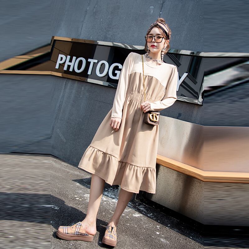 プラスサイズの女性の200キロ脂肪MM秋バージョンのカラーマッチングウエストラウンドネックミドル丈ドレスは、薄い脂肪のスカートでした ミックスインファッション72045658182