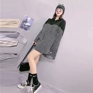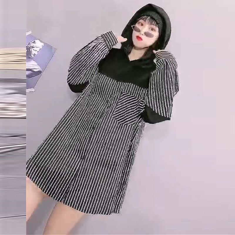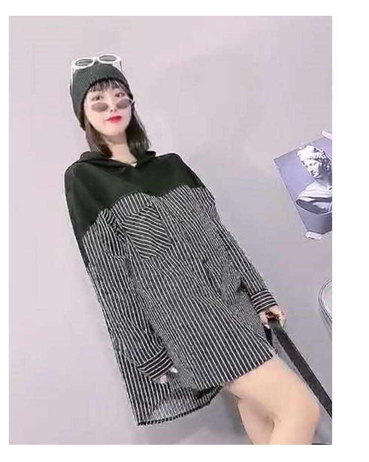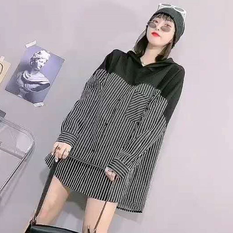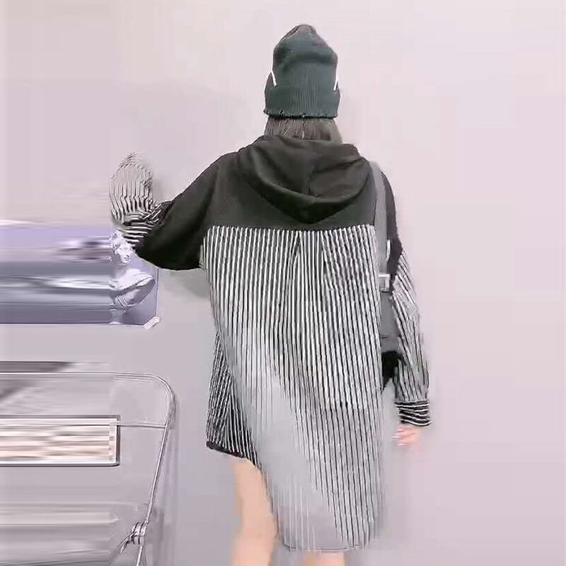 2020プラスサイズレディースストライプフード付き長袖トップファットシスターmmルーズスリムミッドレングスコート ミックスインファッション53816767065