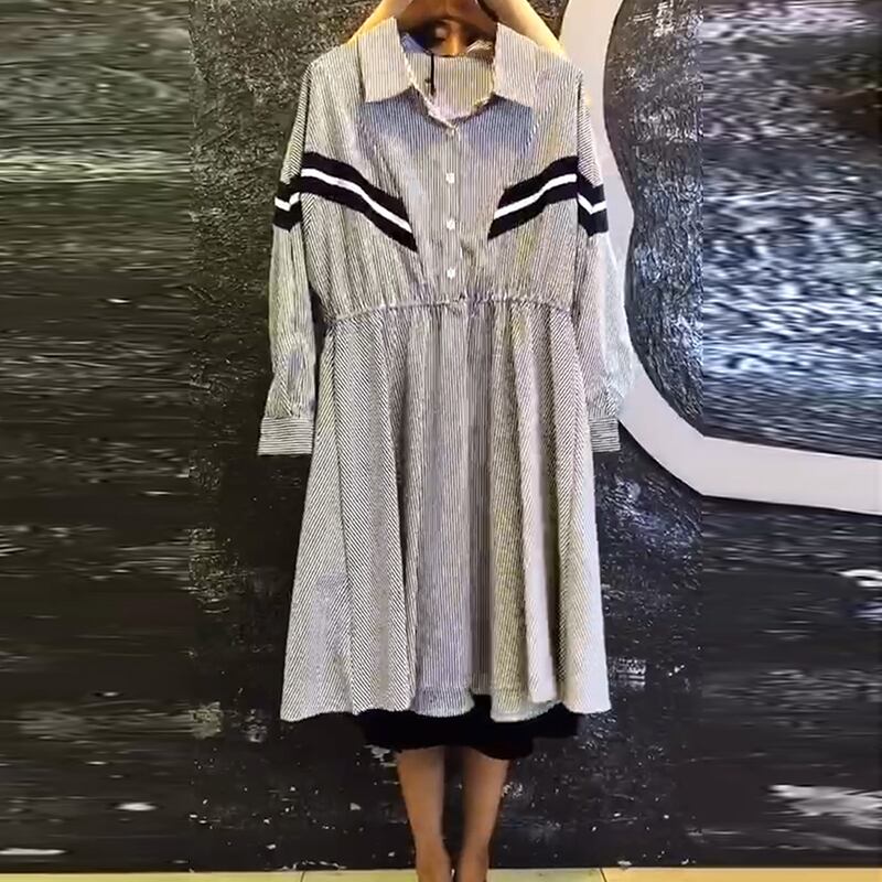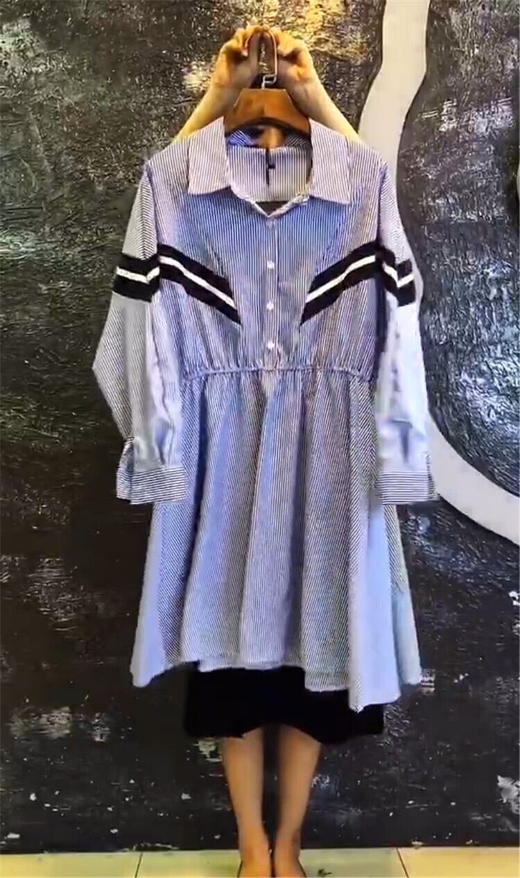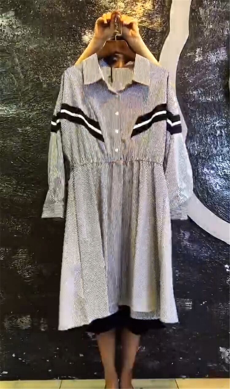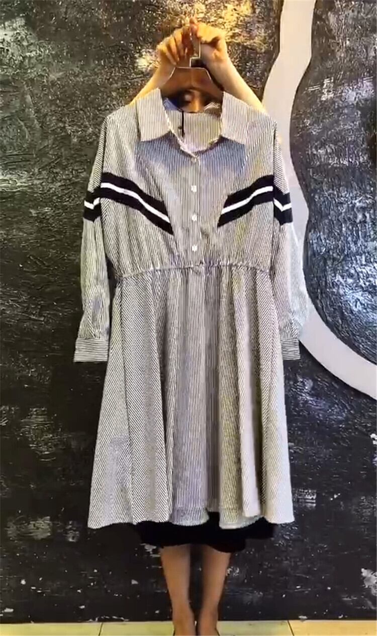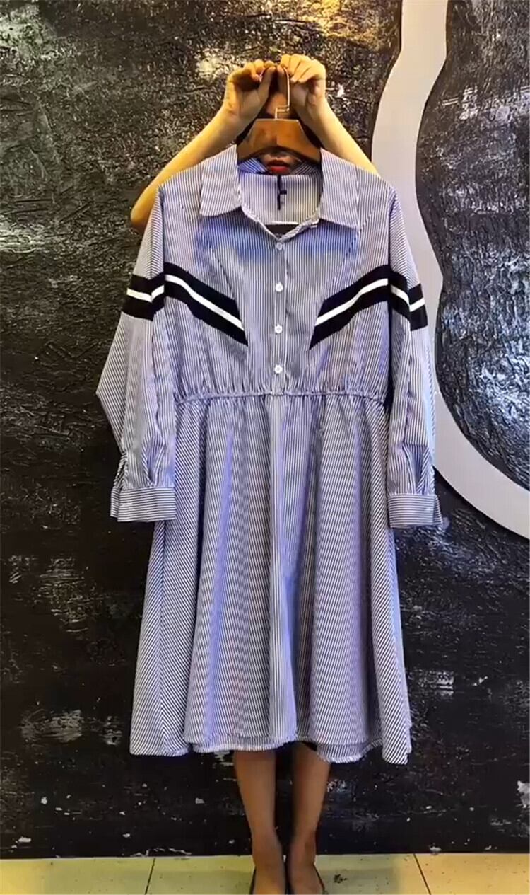 ストライプドレス、ラージサイズ、ウエスタン気質、年齢制限、2020年秋、新作ラージサイズレディースドレス、ラペル、スリムロングスカート ミックスインファッション87017320316