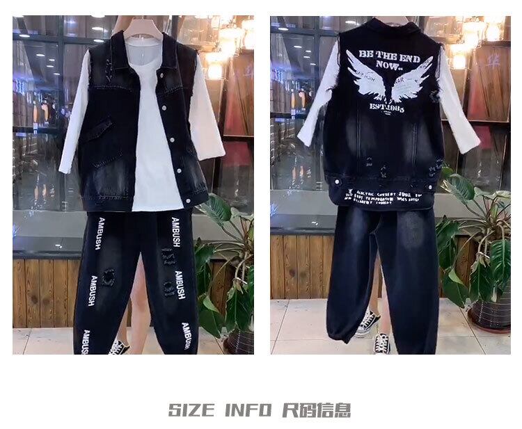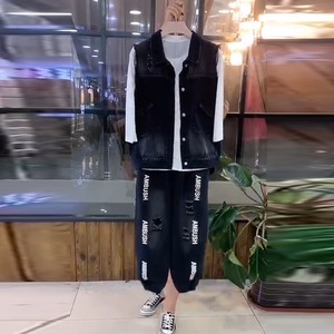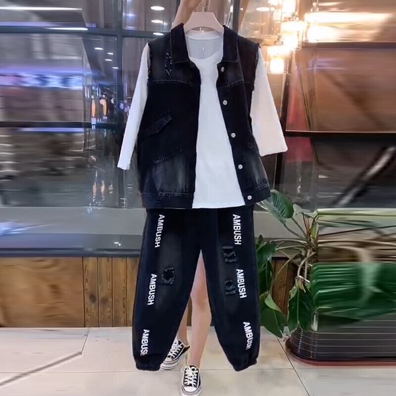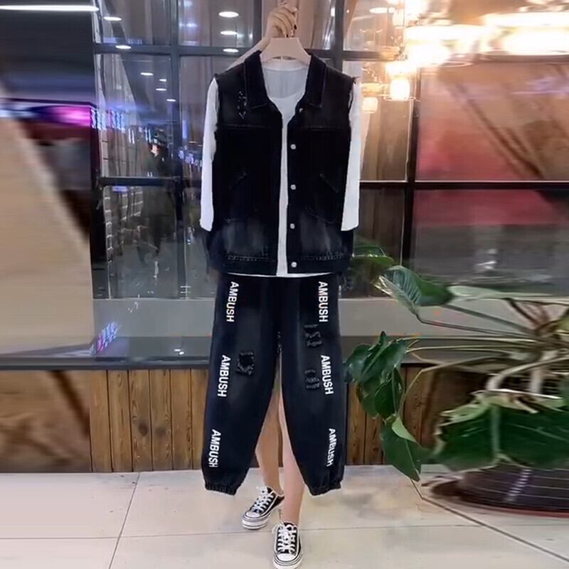 2020年秋新しいプラスサイズの女性の太った姉妹mm痩身デニムベスト破れたパンツツーピーススーツ ミックスインファッション65816289618