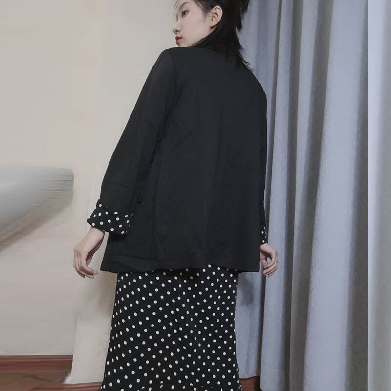 色:黒のコートと白のドットスカートのツーピーススーツ