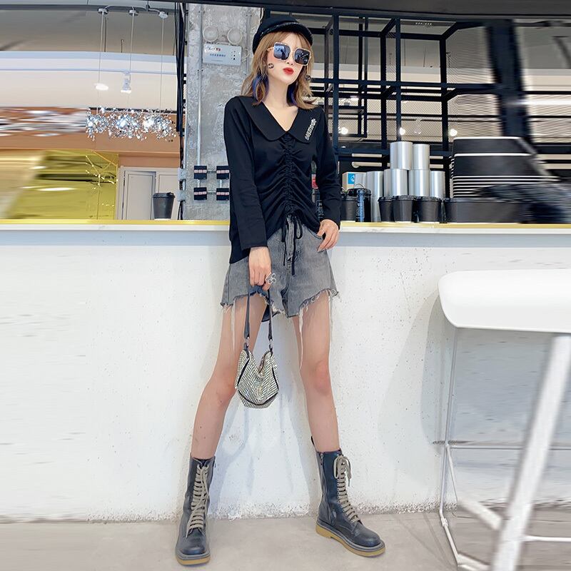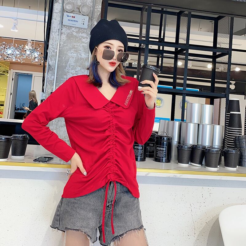 プラスサイズ長袖レディースファットmmウエスタンスタイル秋の服2020新しいルーズドローストリングデザインラペルトップTシャツ ミックスインファッション5613423761