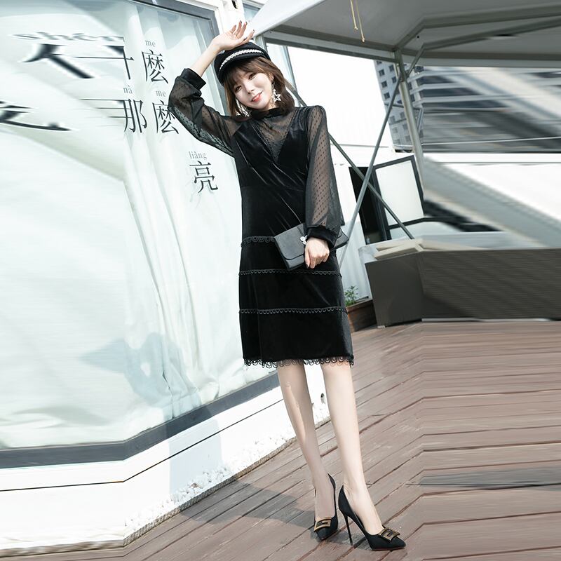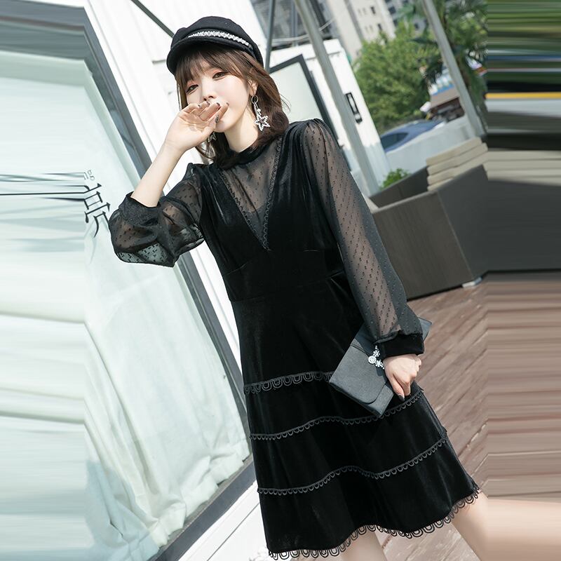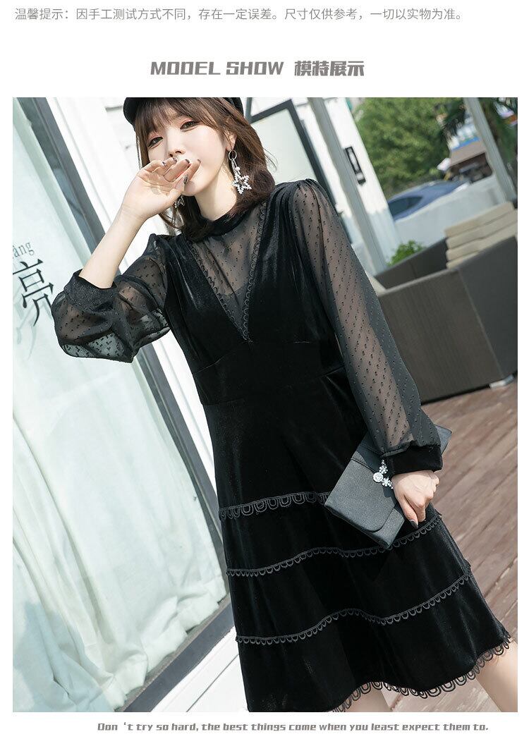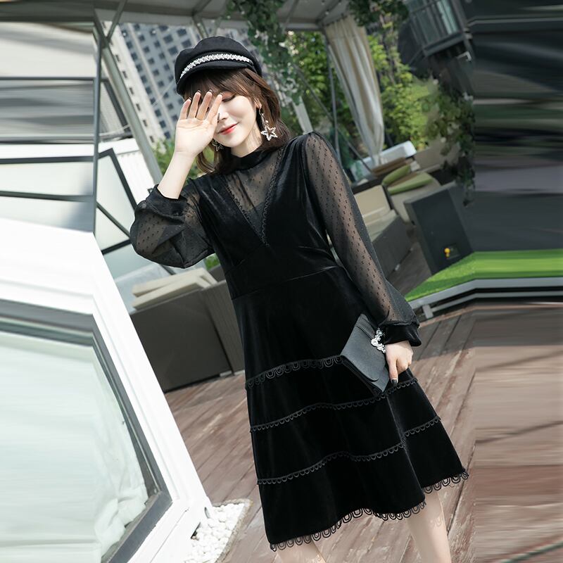 秋の新しいスタイルプラスサイズ脂肪mmマイクロ脂肪痩身腹メッシュスリーブベルベット脂肪姉妹女性スカート気質ドレストレンド ミックスインファッション45586426513