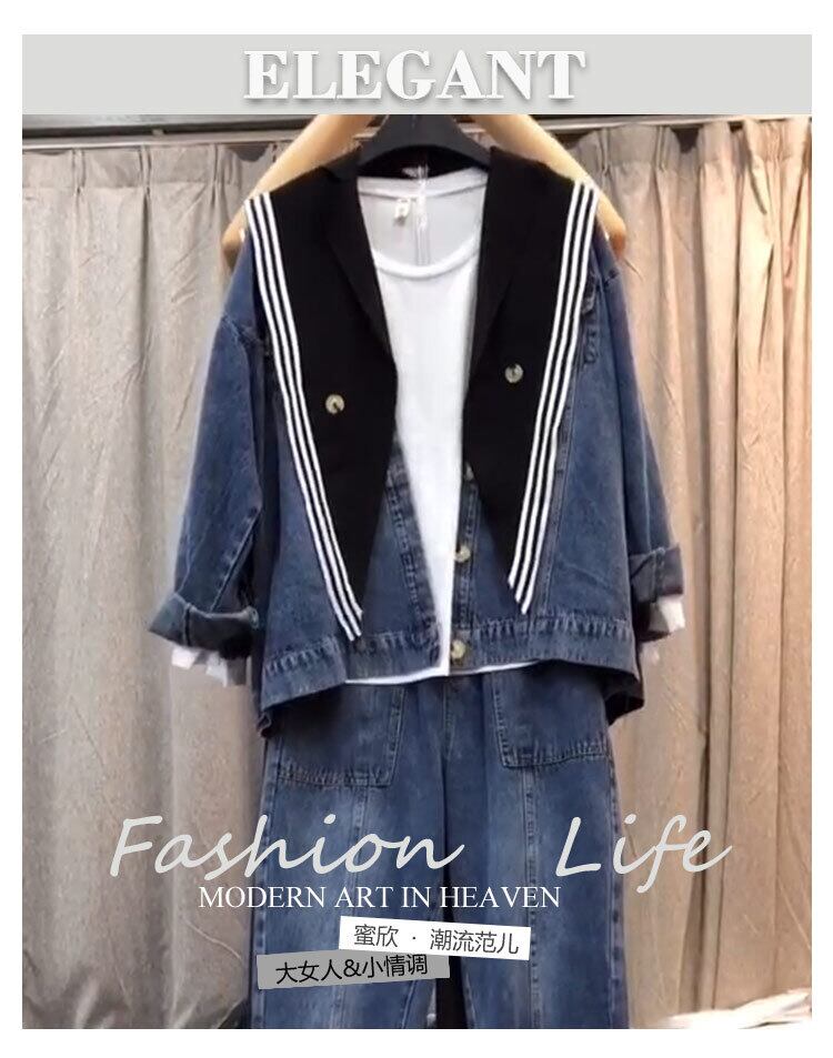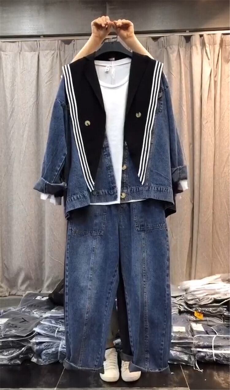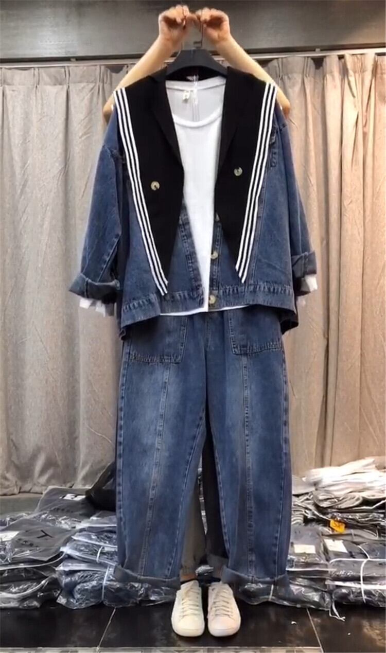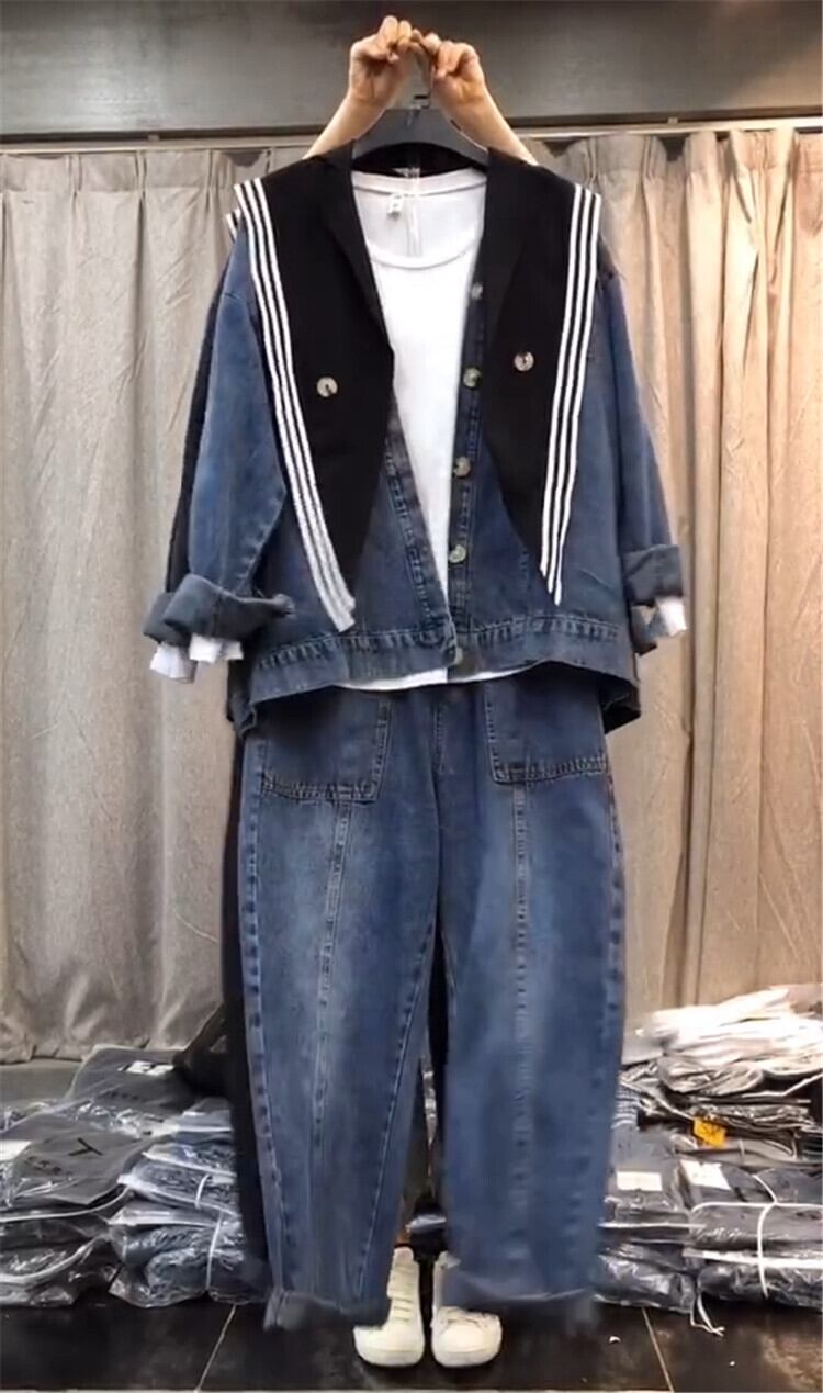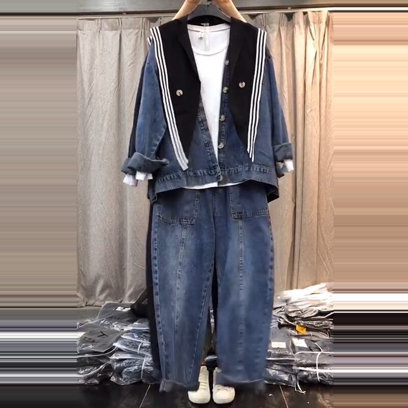 プラスサイズの女性の2020年秋新しいファットシスターmmスリムコートカーディガン年齢を減らしたウエスタンスタイルのデニムパンツ ミックスインファッション16603486833