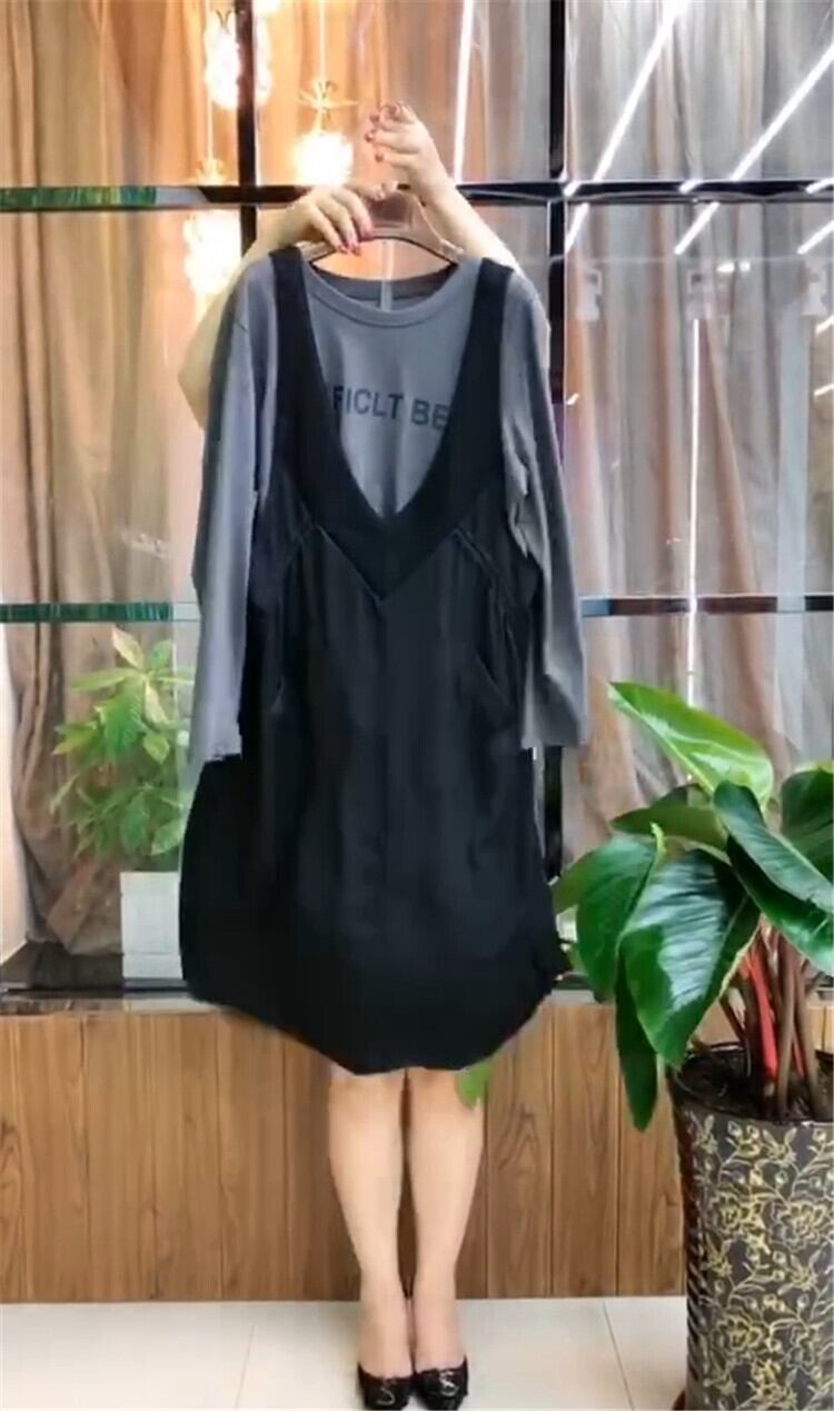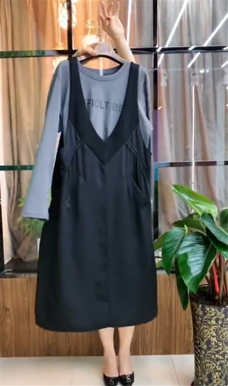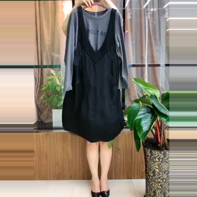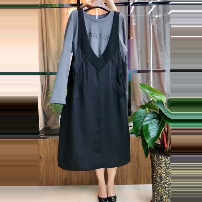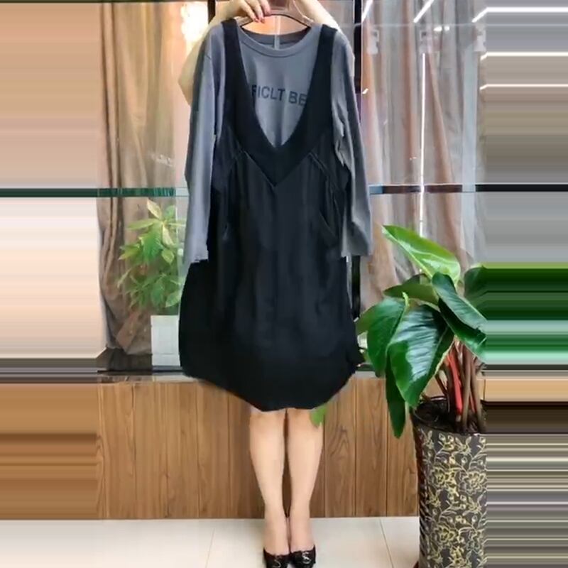 ファットシスターツーピースドレスプラスサイズレディース秋新バージョンTシャツルーズで薄いカバーベリーストラップスカート ミックスインファッション60816099767