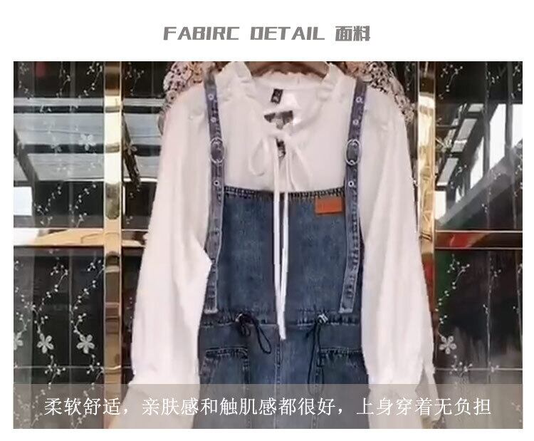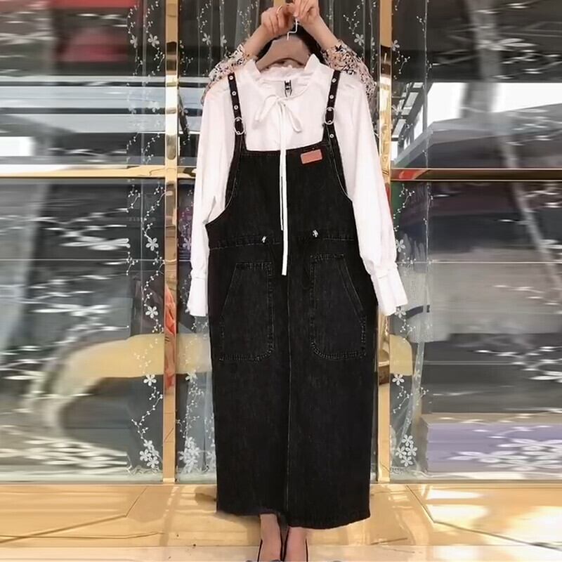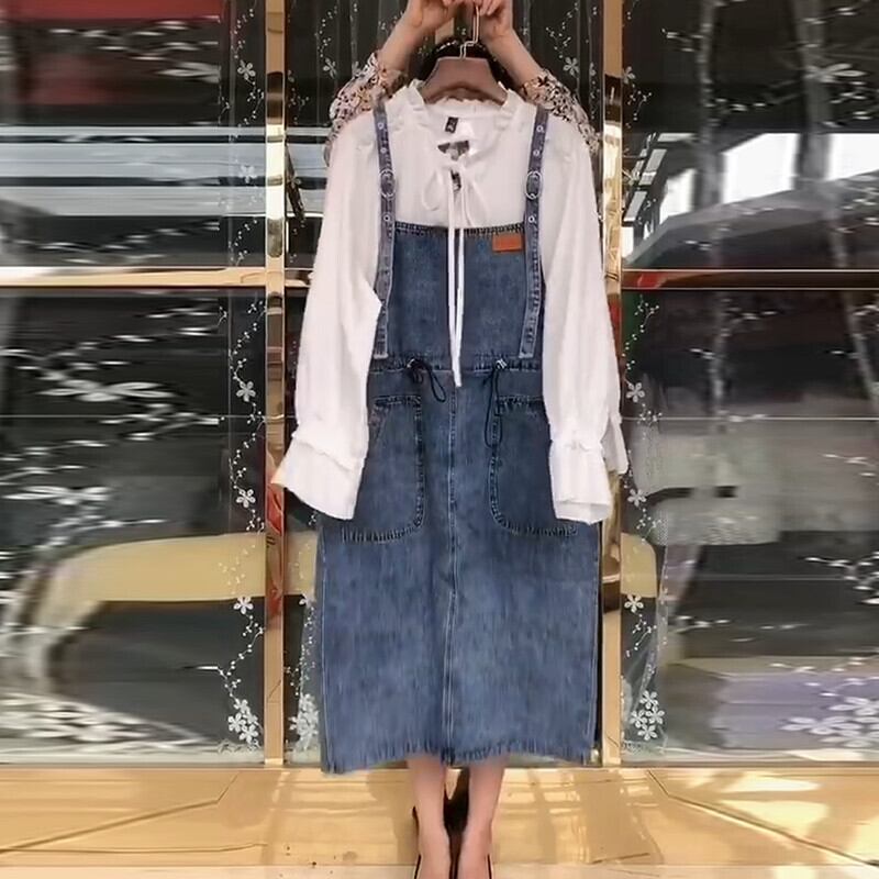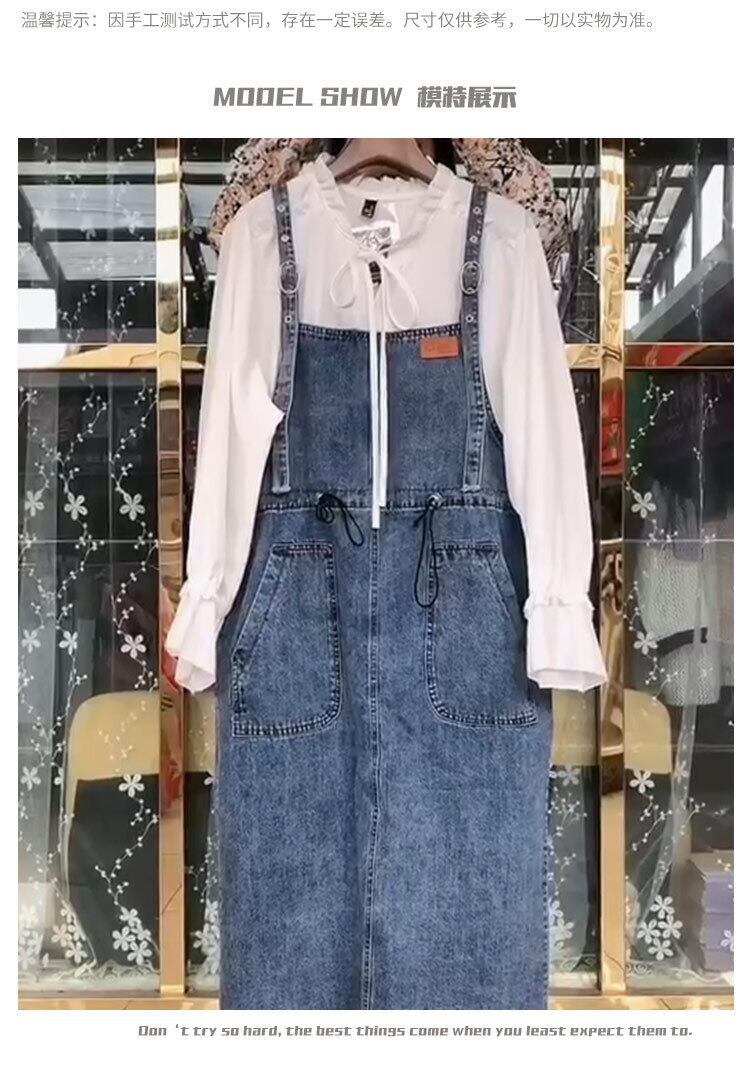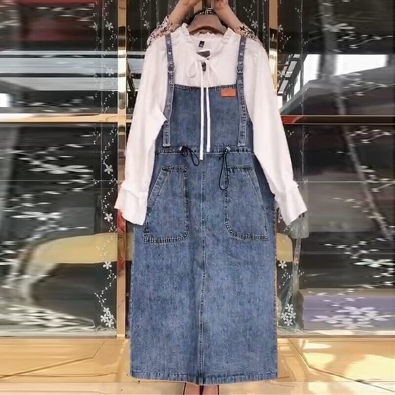 ミドル丈長袖シャツトップデニムストラップスカートルーズラージサイズレディースツーピースワンピースは薄くてウエスタン ミックスインファッション39454812984