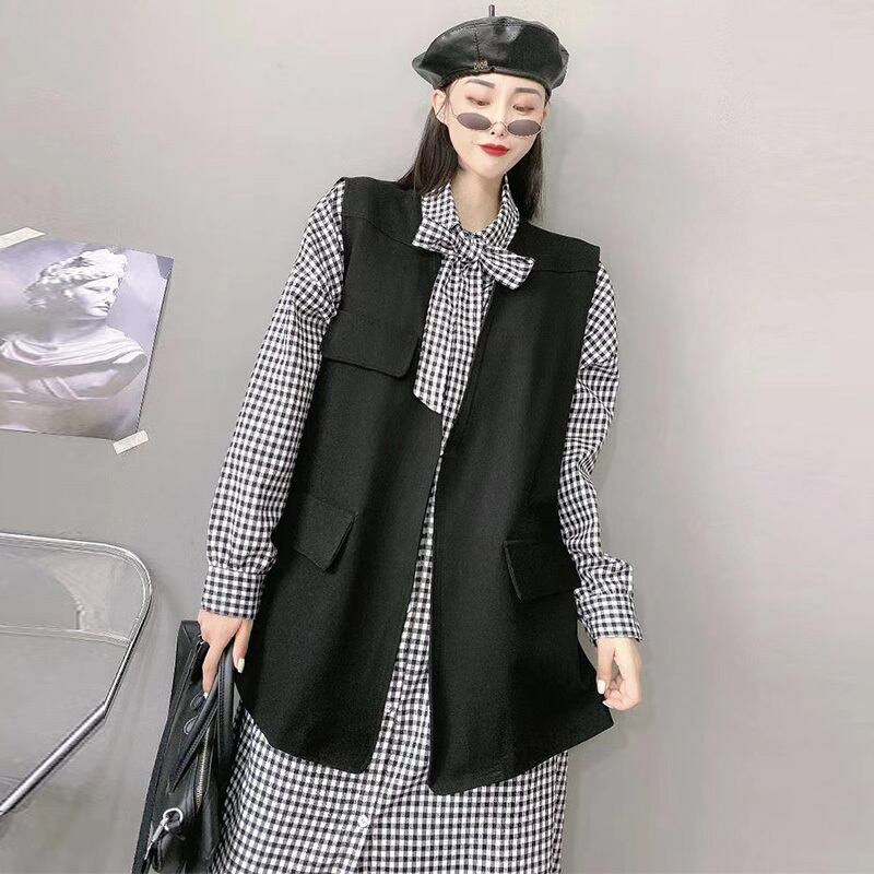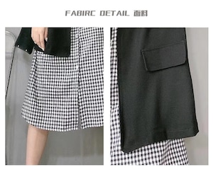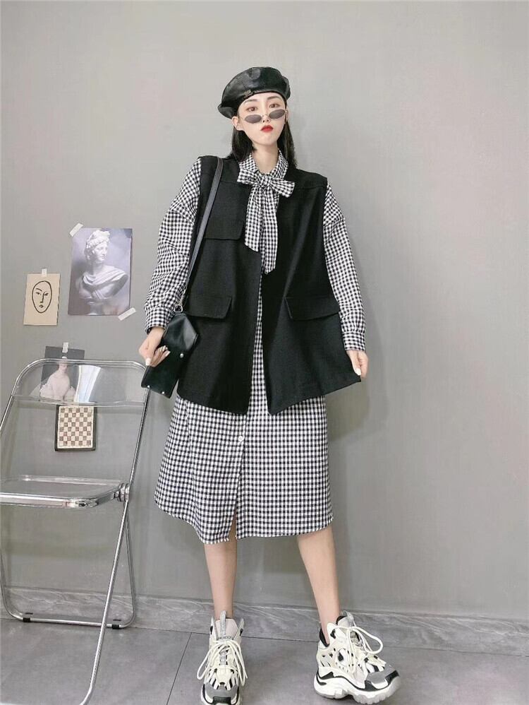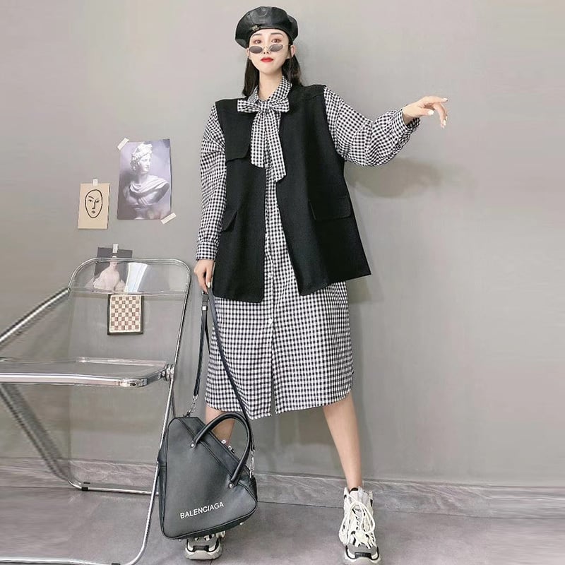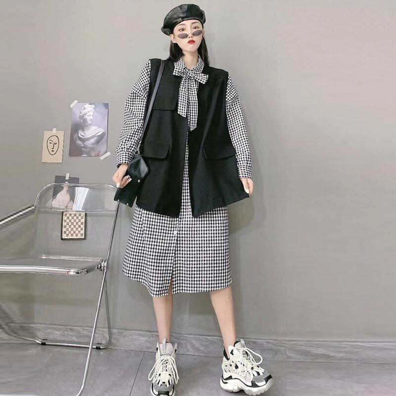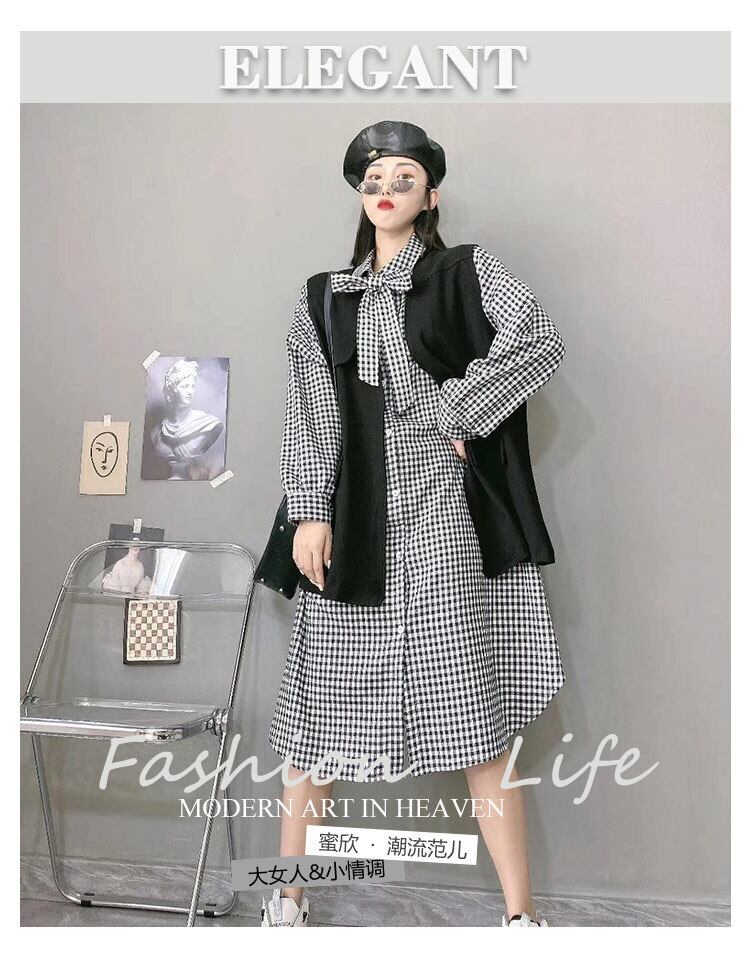大きいサイズは薄いチョッキトップチェック柄シャツドレス女性秋脂肪mm大きい腹スカートチョッキファッションでした ミックスインファッション48606817273