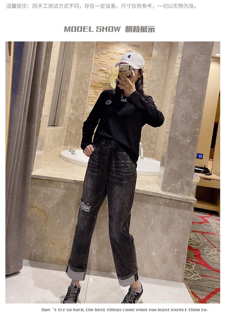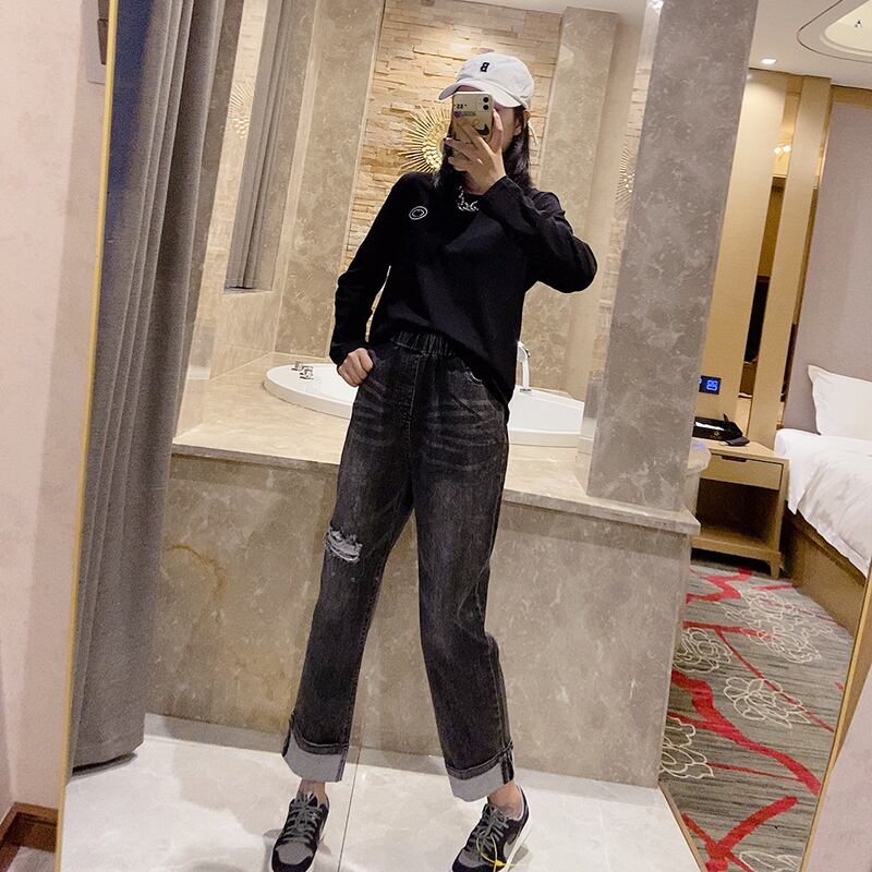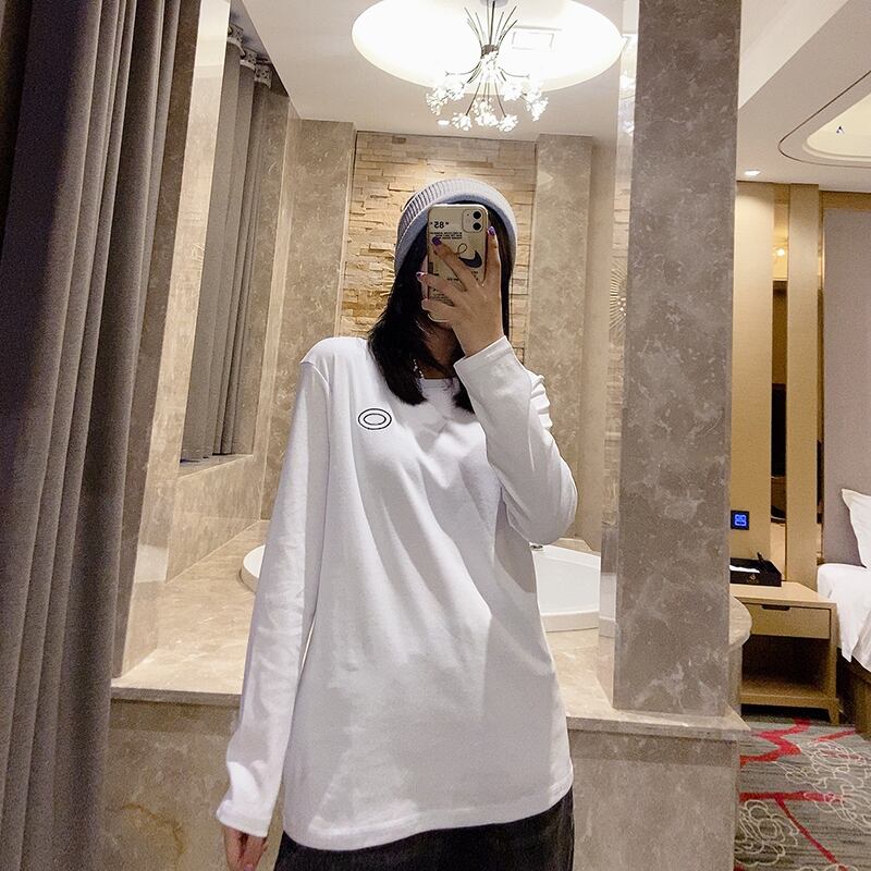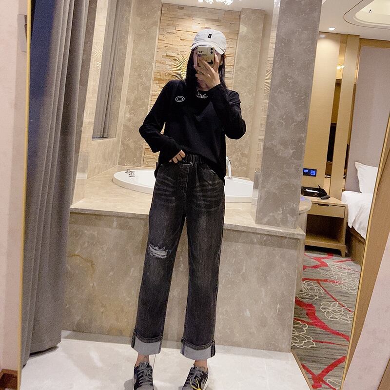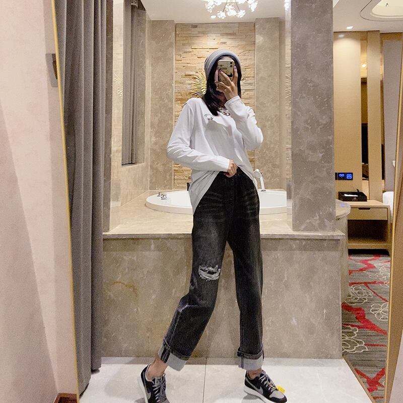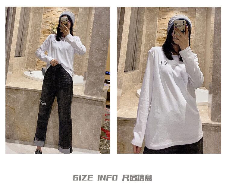 プラスサイズの女性用の新しい長袖Tシャツで、お腹を覆い、少し太った妹、薄いトップを着た洋ナシの形、ボトミングシャツとジーンズ ミックスインファッション57521106355