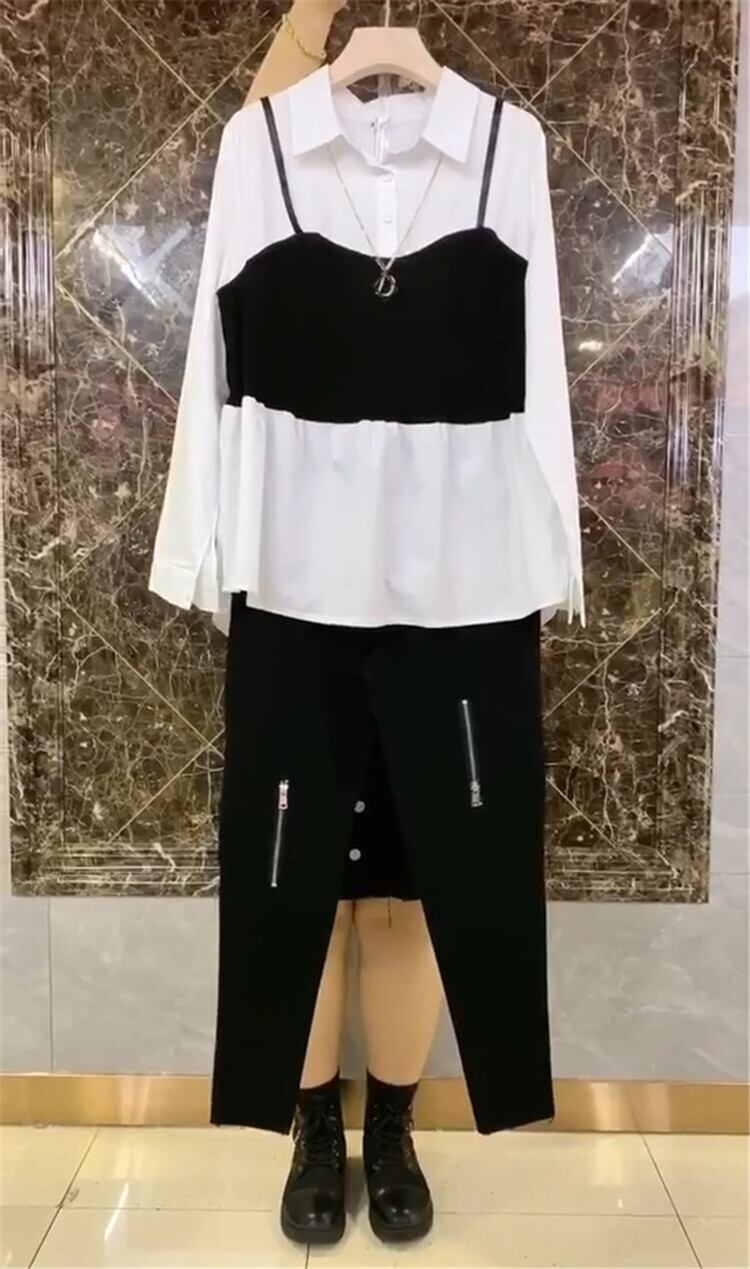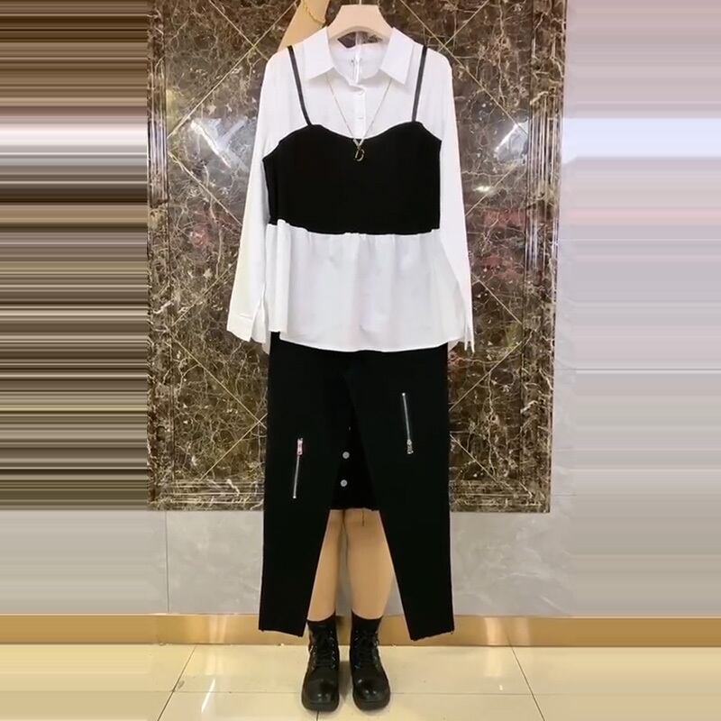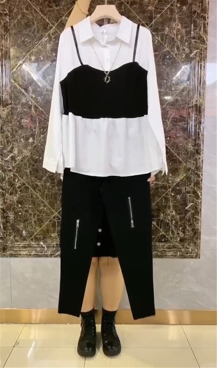 プラスサイズの女性の2020年の新しい秋の長袖の偽のツーピースシャツ、太った妹、薄い腹の隠された肉のトップ ミックスインファッション30850208317