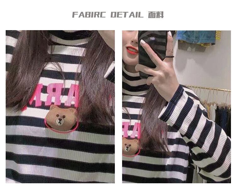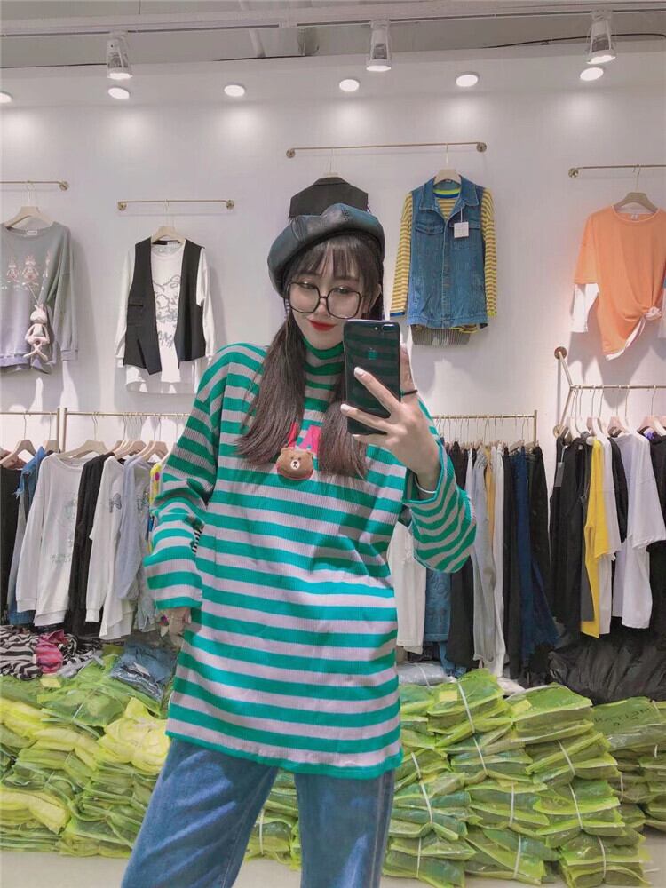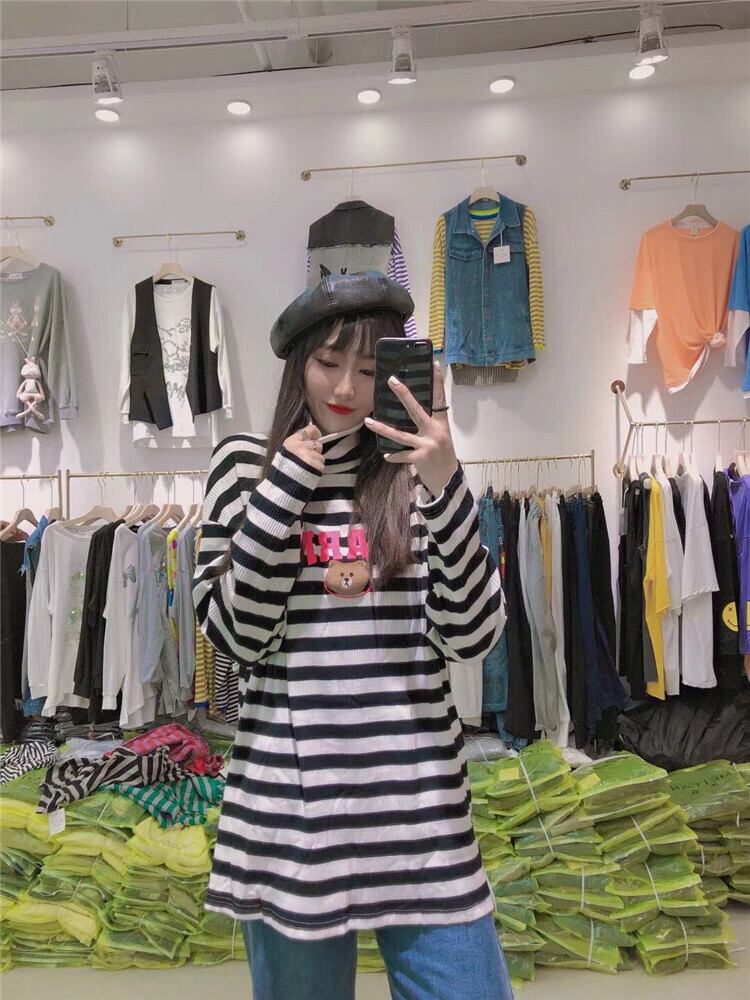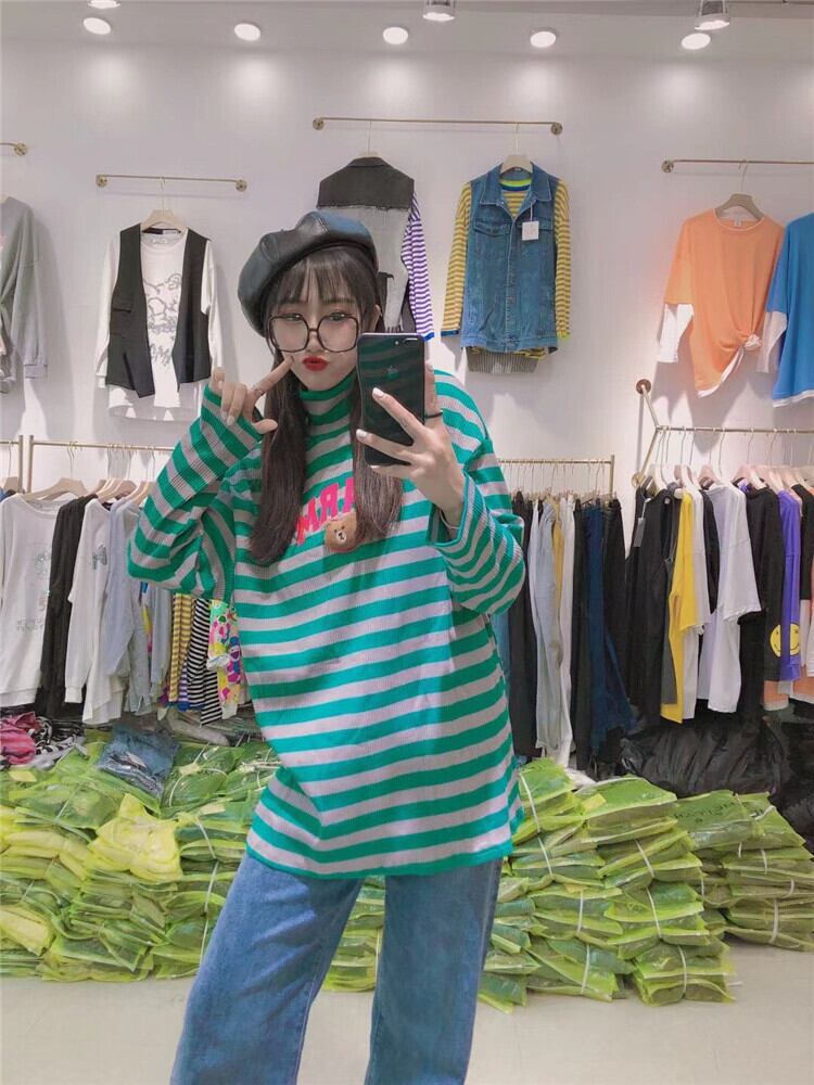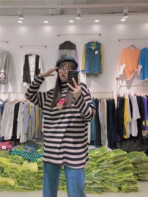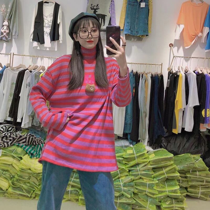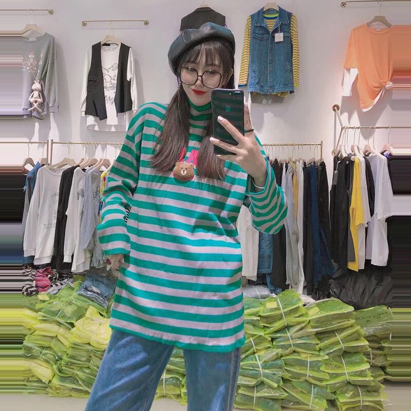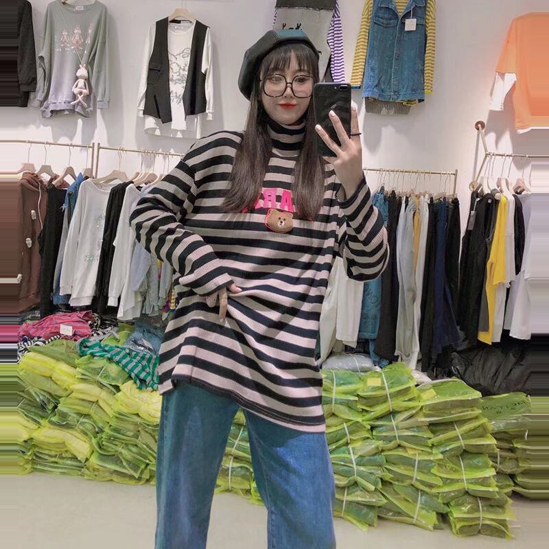 ファットシスターmmプラスサイズレディースベリーカバートップ2020新秋ハイネックストライプルーズ長袖Tシャツ ミックスインファッション99786208936