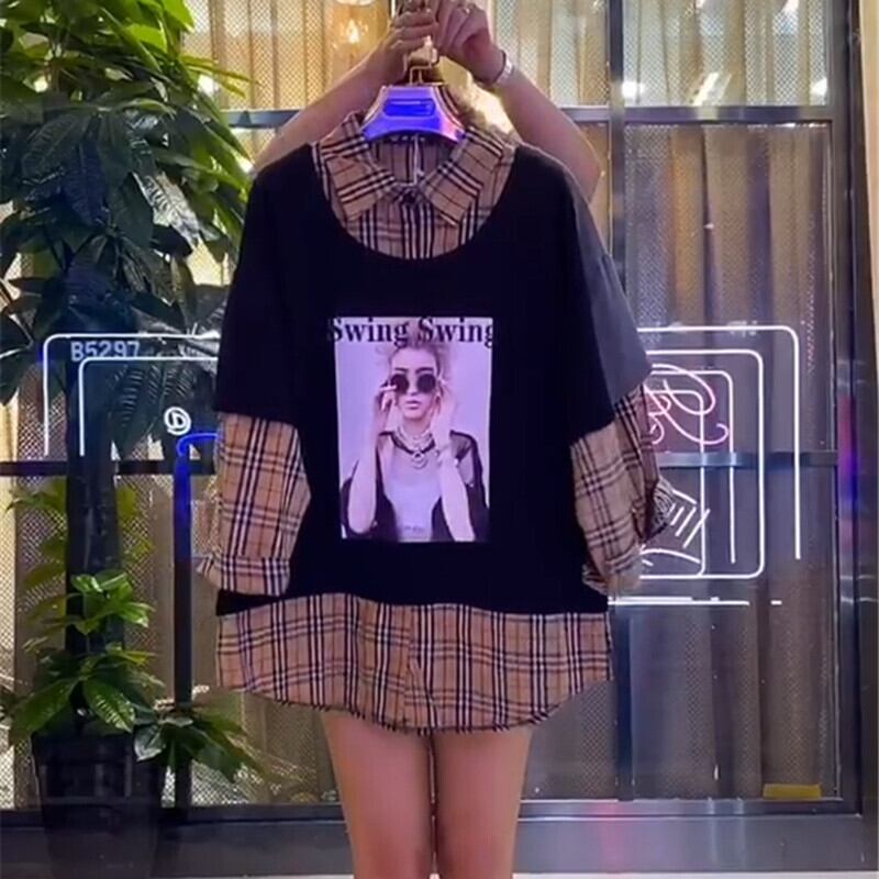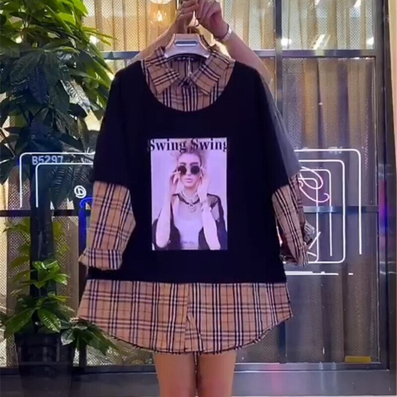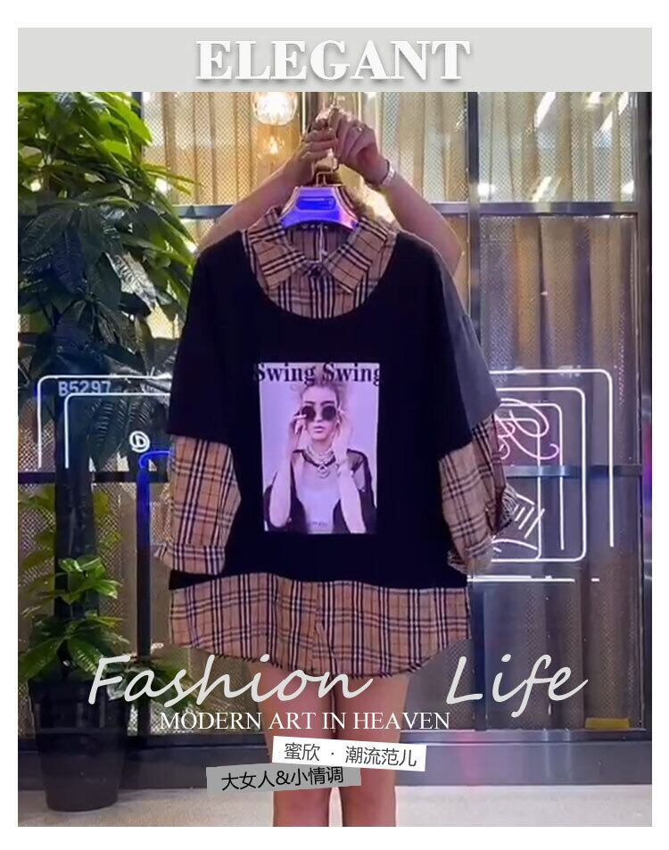 ラージサイズレディースTシャツスーツ200kgファットシスタールーズチェックシャツツーピースジャケットウエスタンスタイル ミックスインファッション18270263980