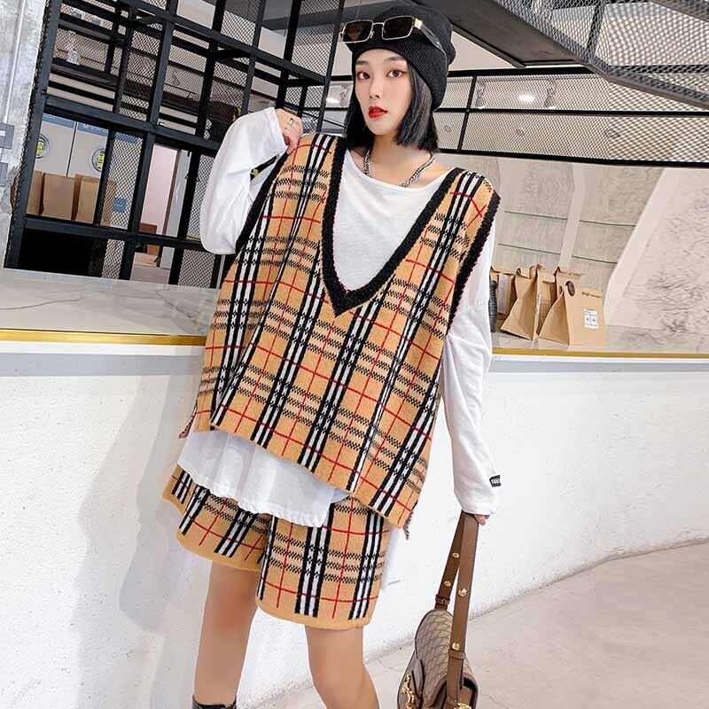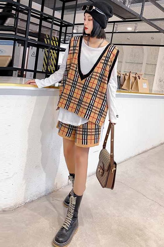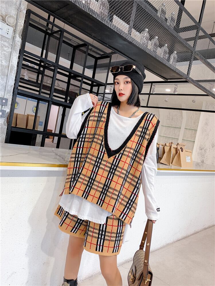 2020年新作気質シンナーツーピーススーツルーズウエスタンファットmmベストチェック柄ショーツプラスサイズレディース秋 ミックスインファッション52008859805