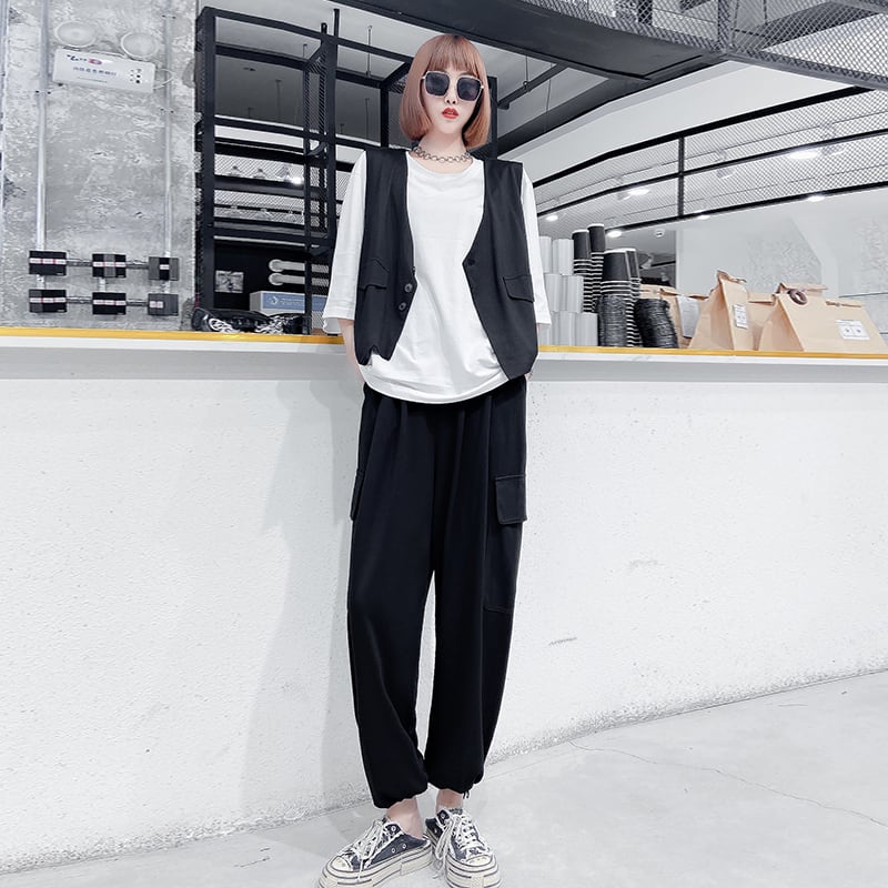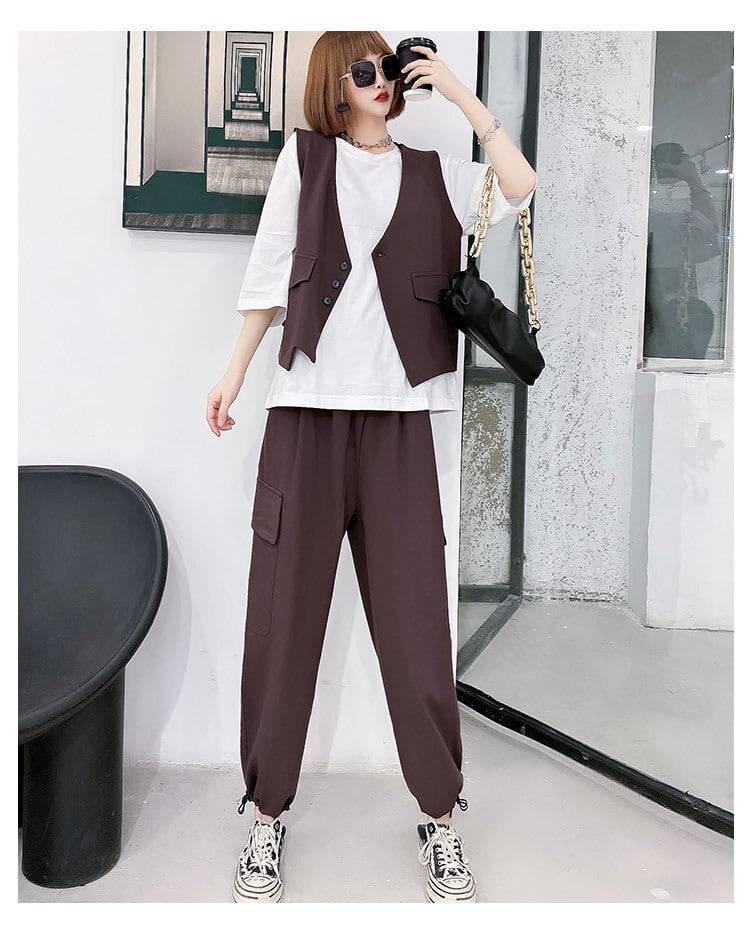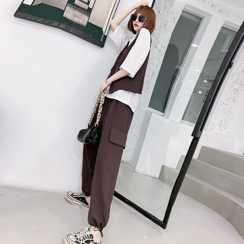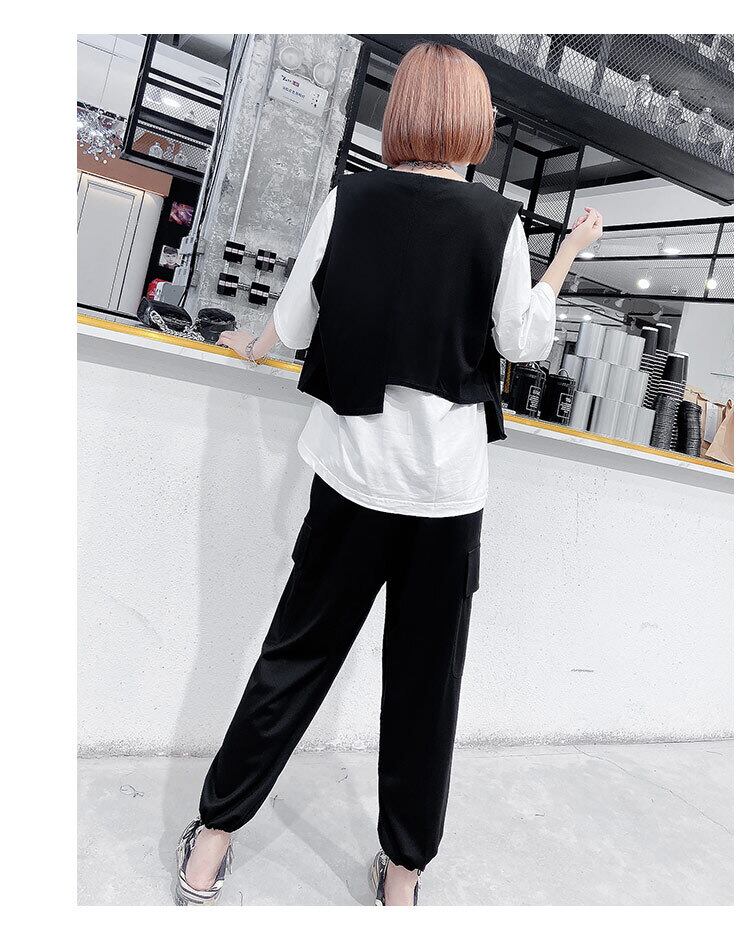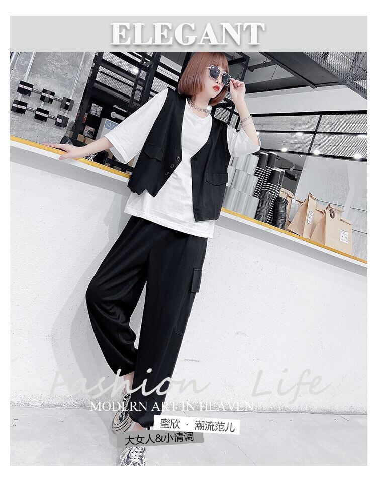 プラスサイズの女性の太った姉妹2020年秋の新しい西洋スタイル、年齢を減らす、間伐、チョッキ、Tシャツ、ズボンのスリーピーススーツ ミックスインファッション86649749485