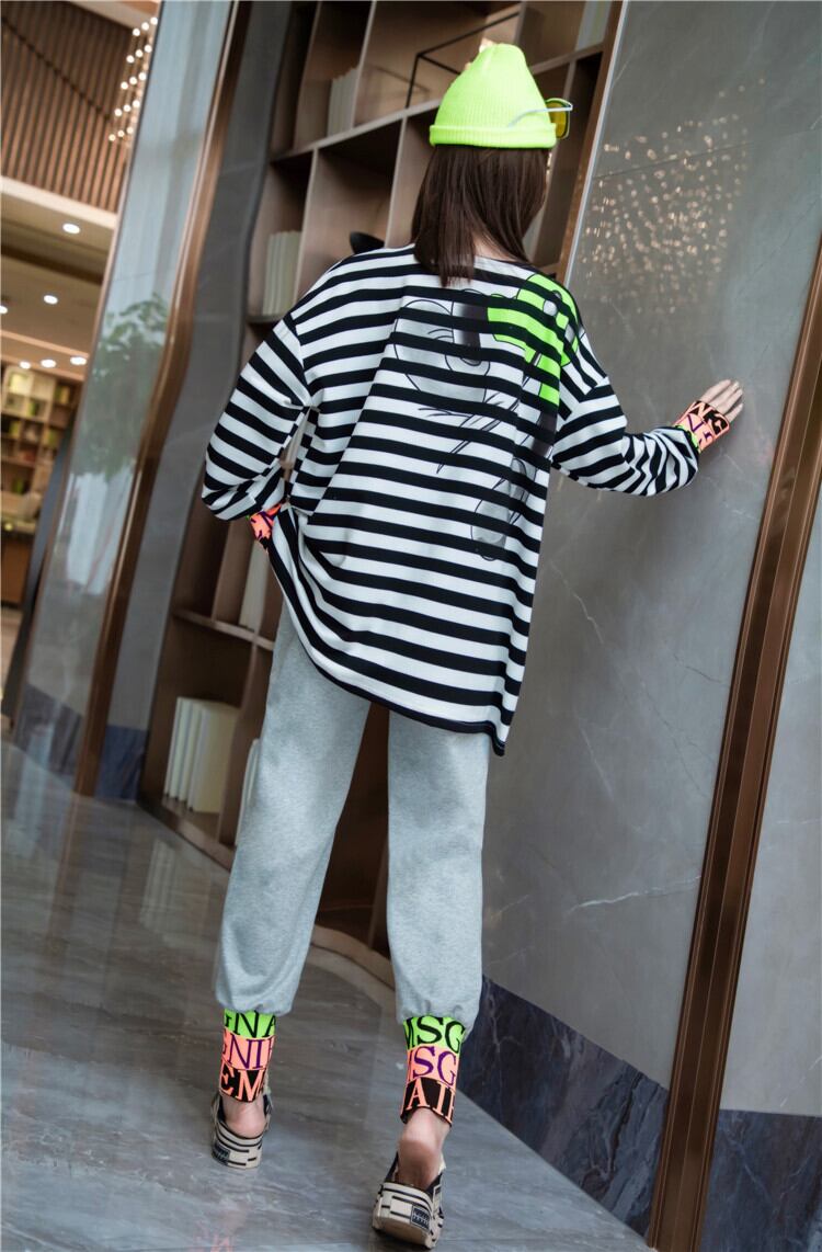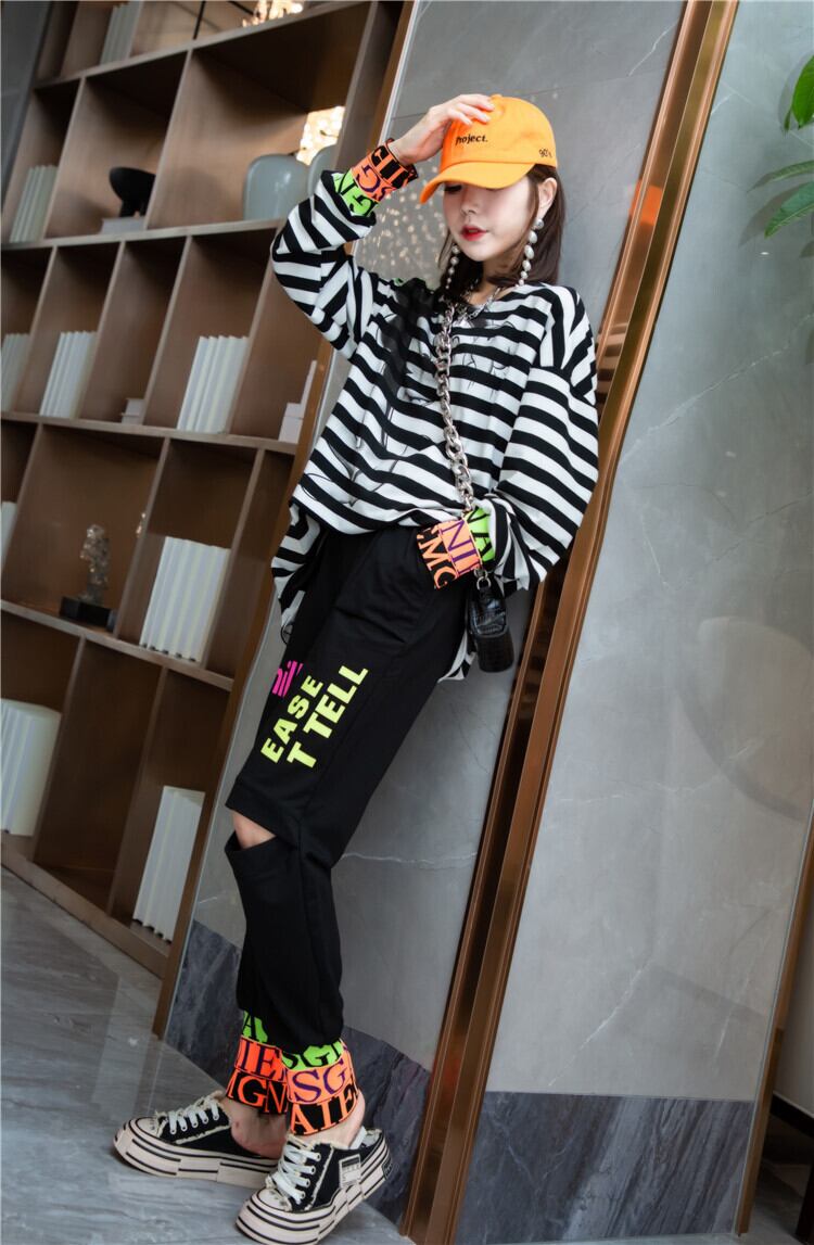 2020年秋新作レディースプラスサイズファットmm薄ストライプTシャツツーピーススーツレザーホールレディースパンツウエスタンスタイルダウンエイジ ミックスインファッション33312211493