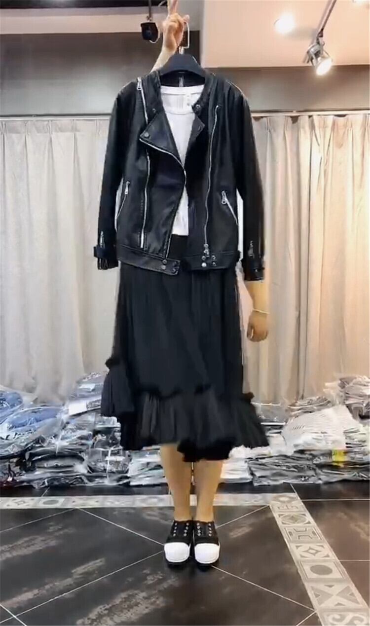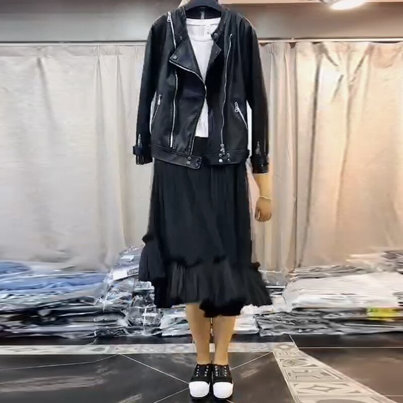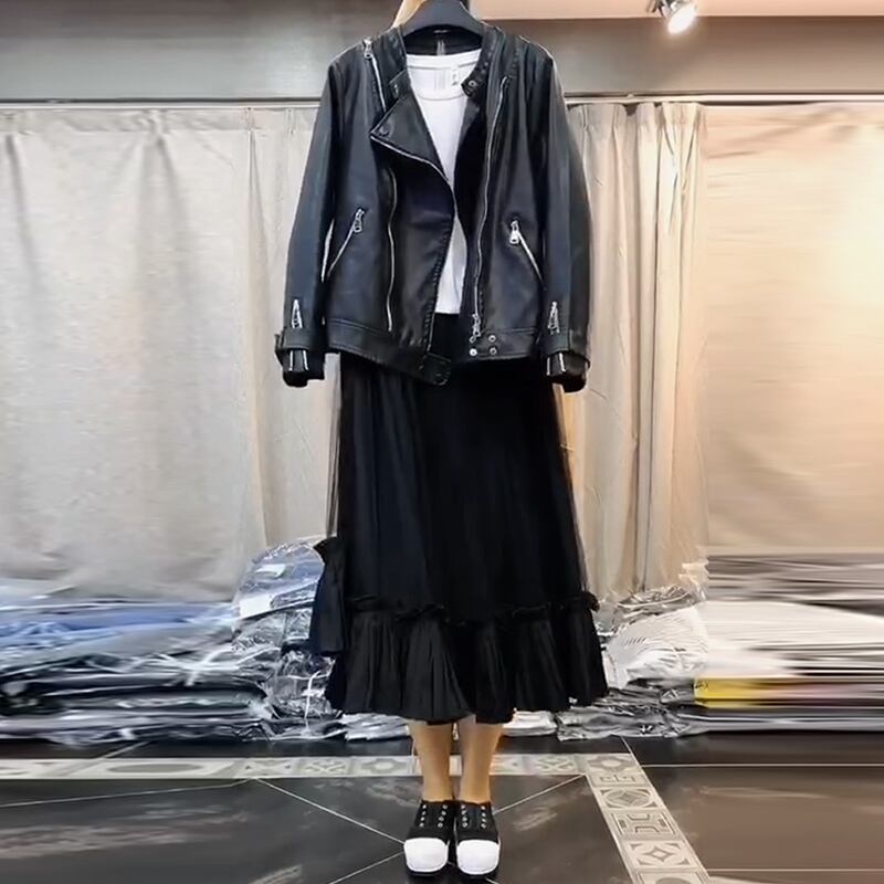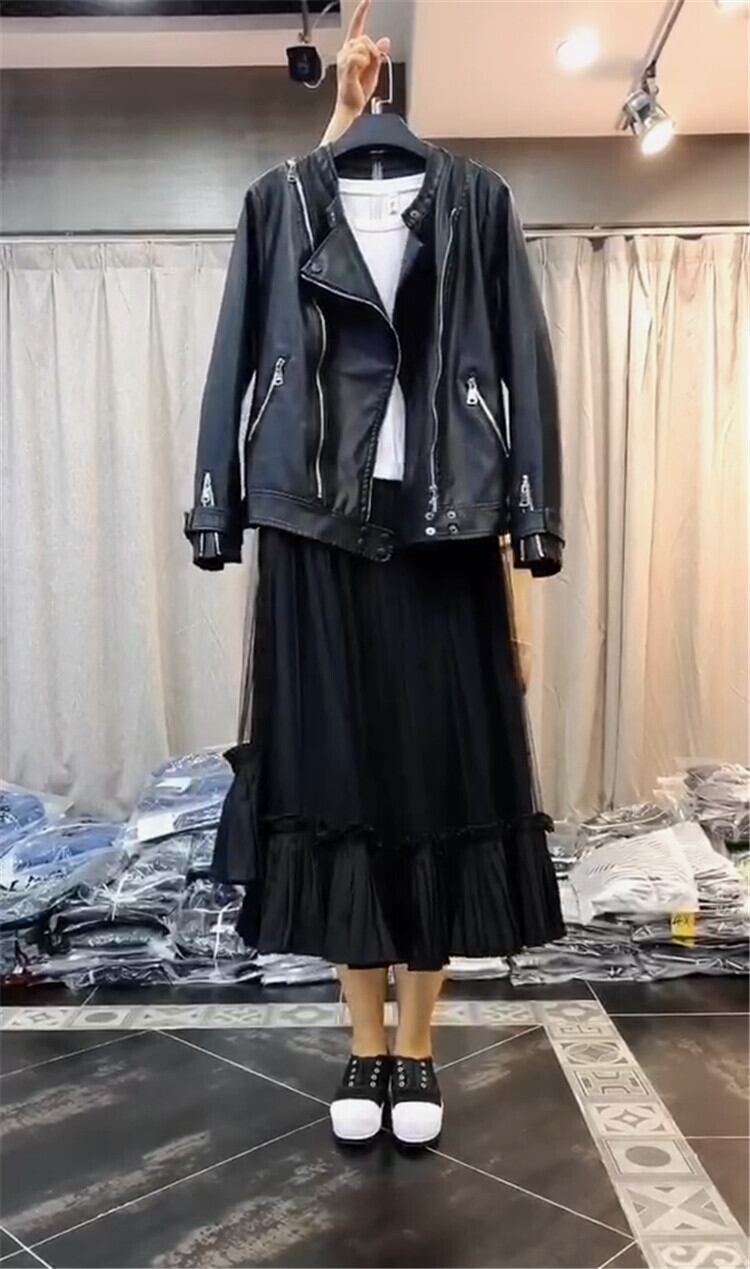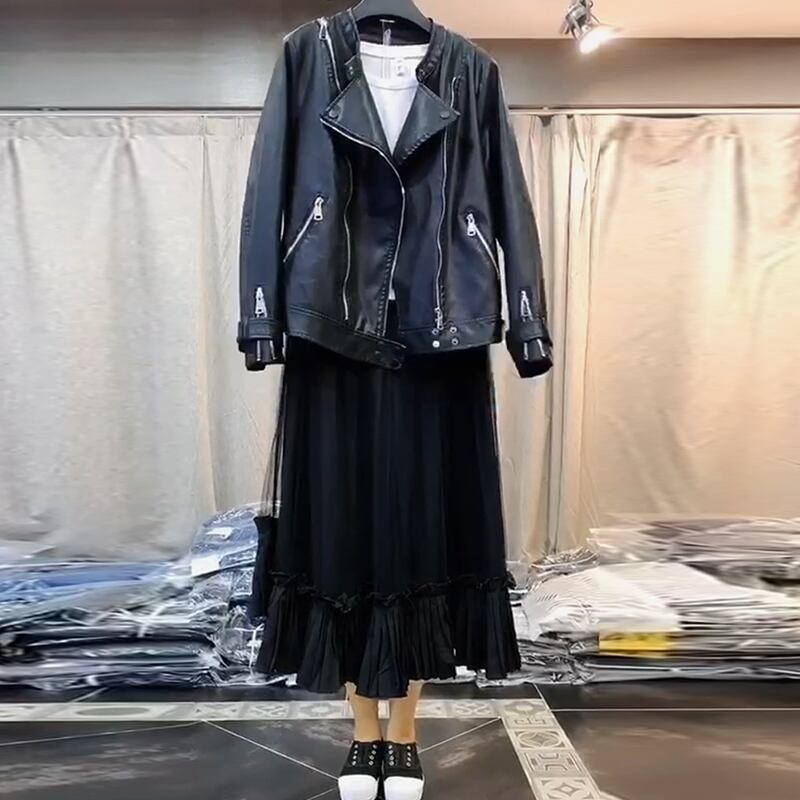 オータムメッシュスカート レザージャケット スタイル 大きめサイズ 秋物 ミックスインファッション92953352896