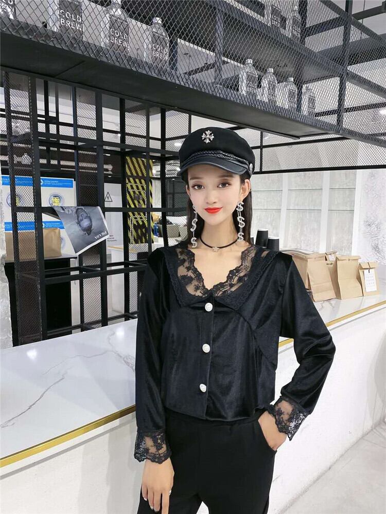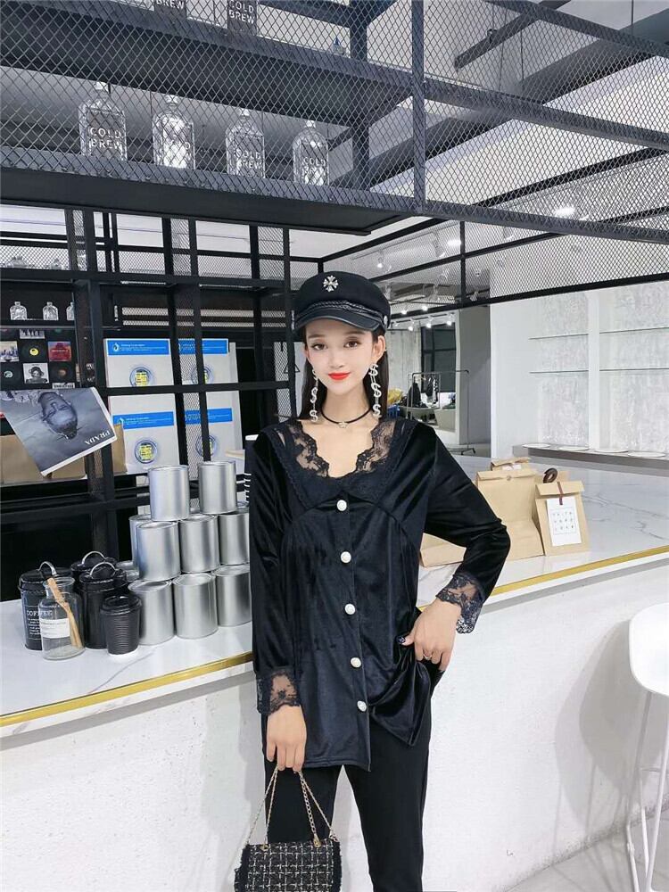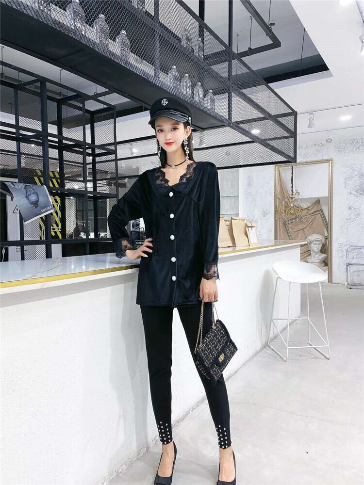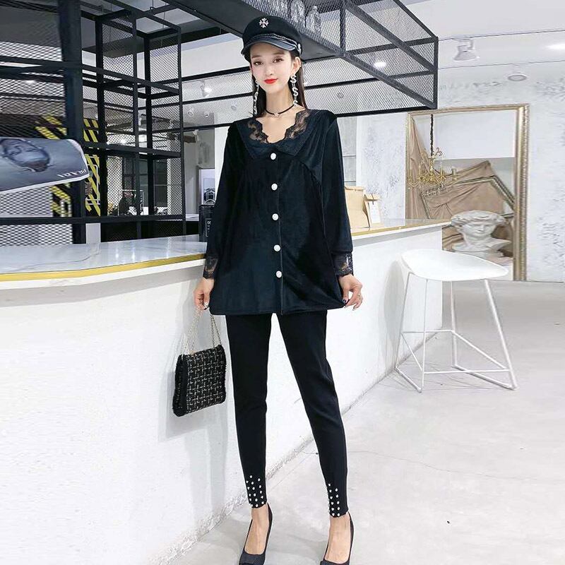 オータムスタイルレースVネックシャツ ルーズトップス パンツ 大きめサイズ 秋物 ミックスインファッション86431832193