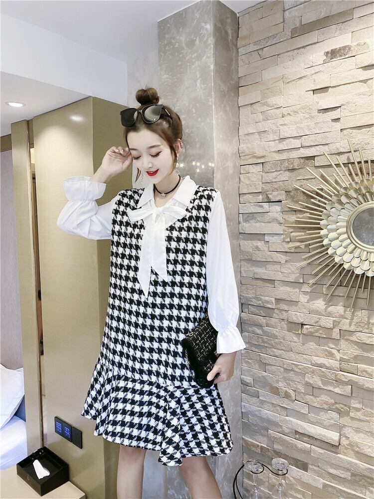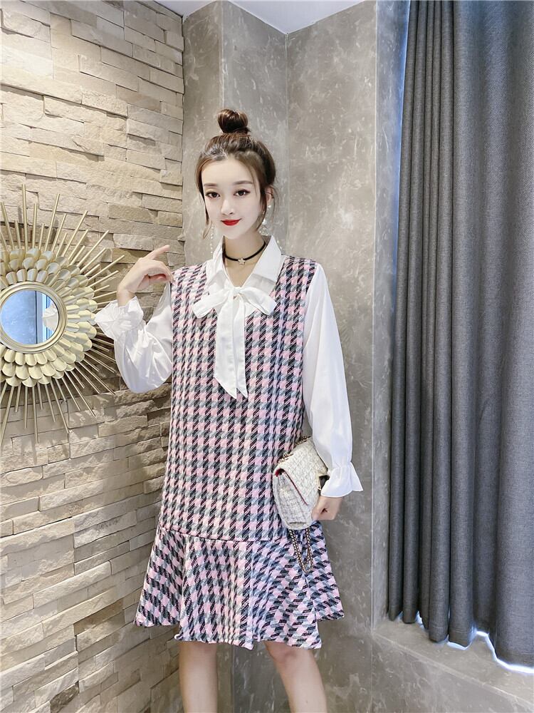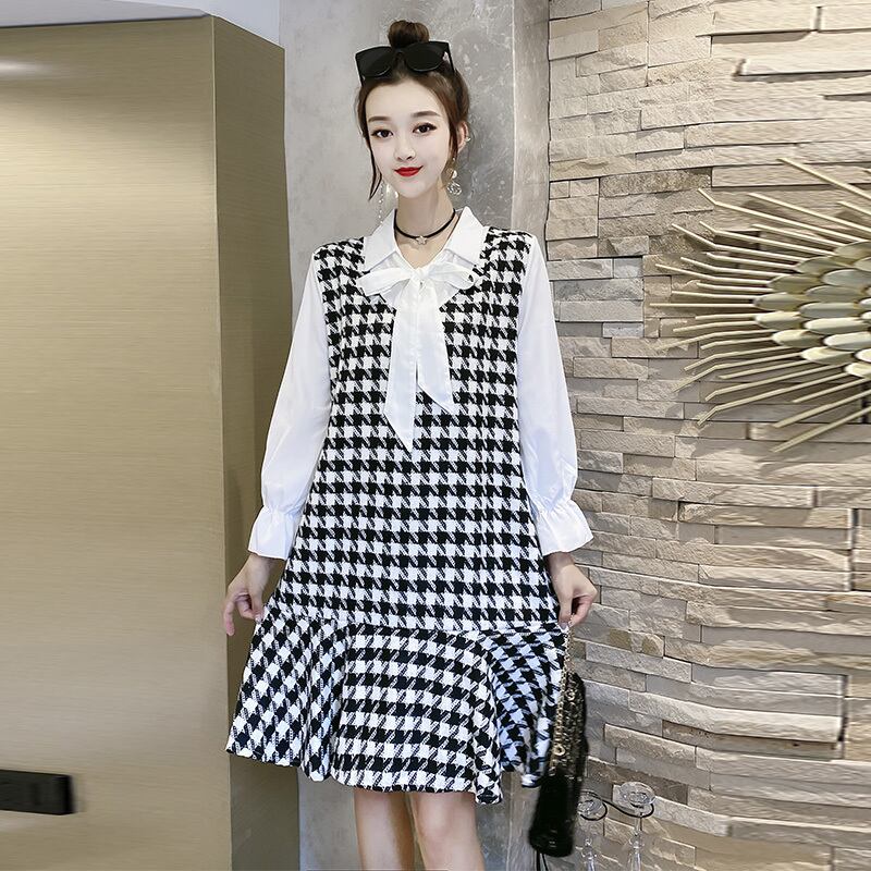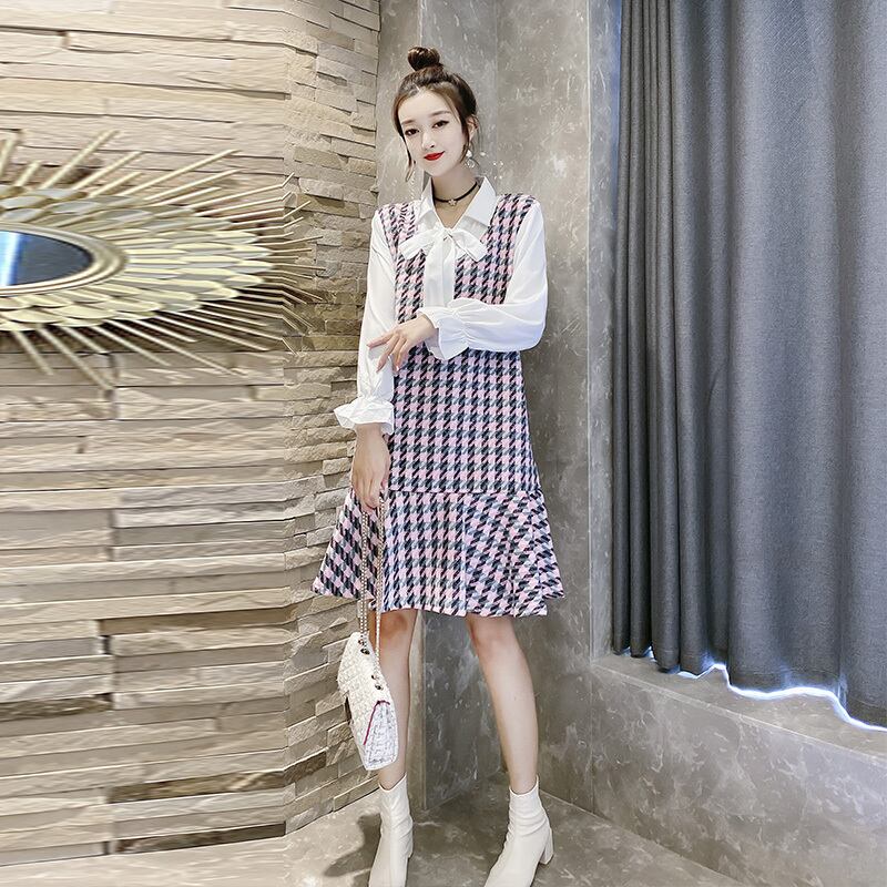 オータムルーズ薄手格子柄ドレス 大きめサイズ 秋物 ミックスインファッション55354491401