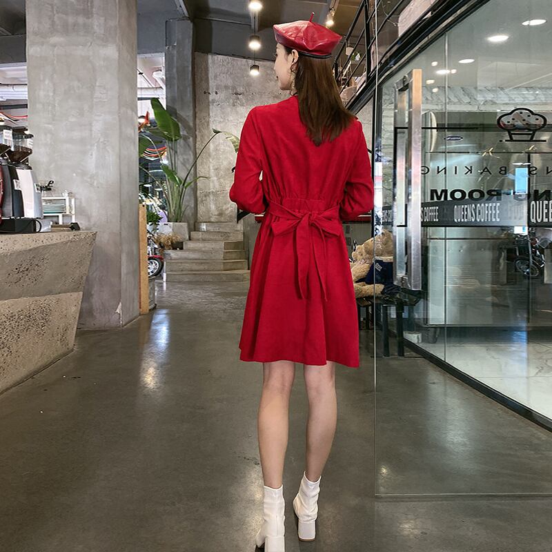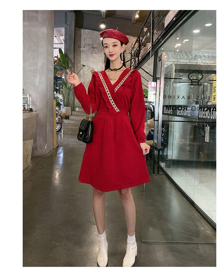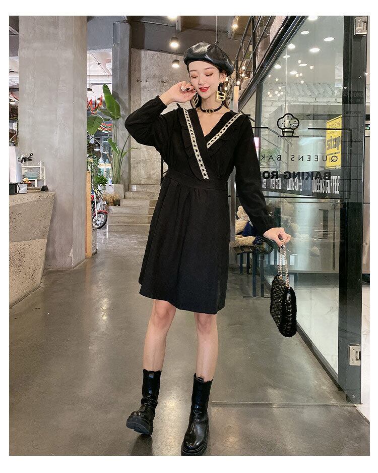 レディースオータムウィンターVネックウェストドレス スカート 大きめサイズ 秋物 冬物 ミックスインファッション26133473540