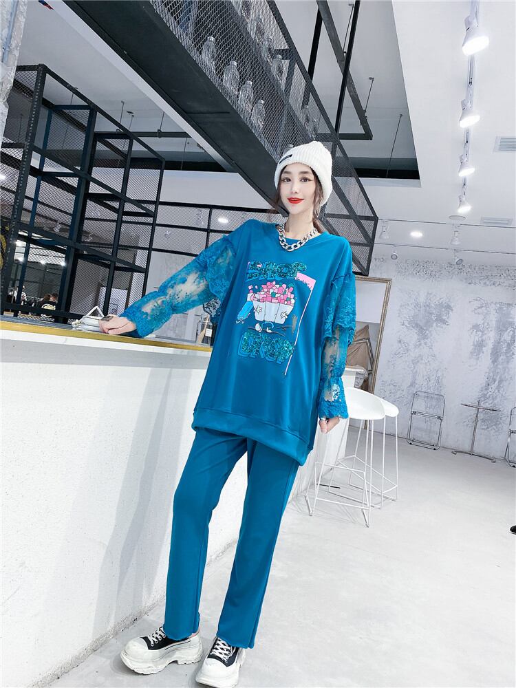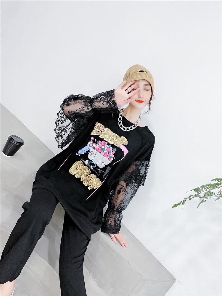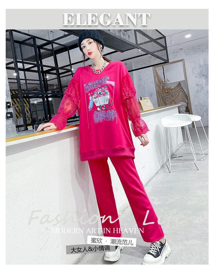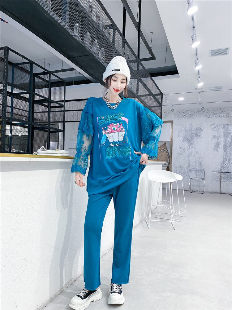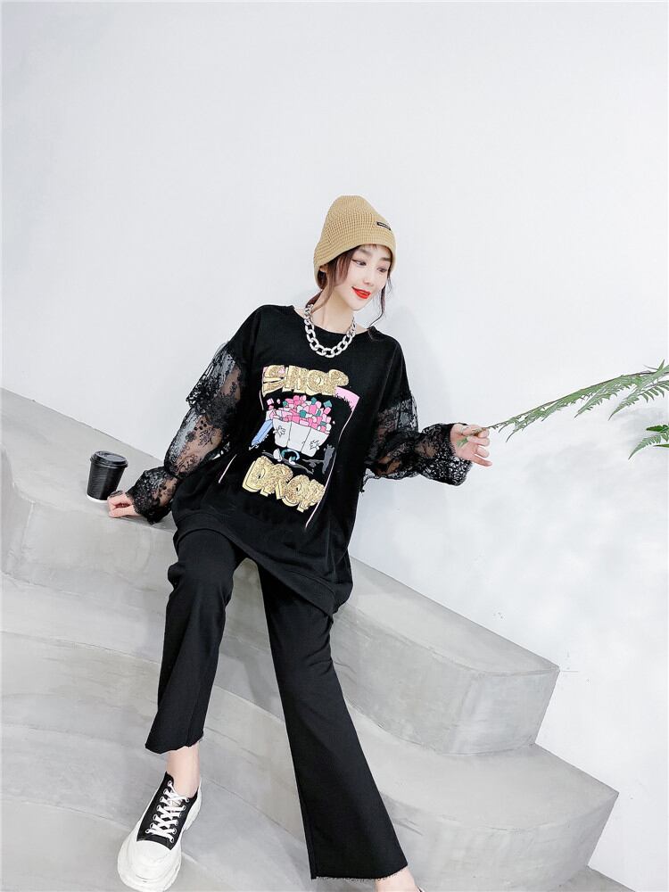 薄手レースラウンドネックTシャツ カジュアルパンツ ロング 大きめサイズ Oネック ミックスインファッション2022837006