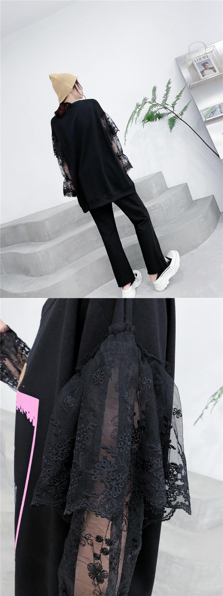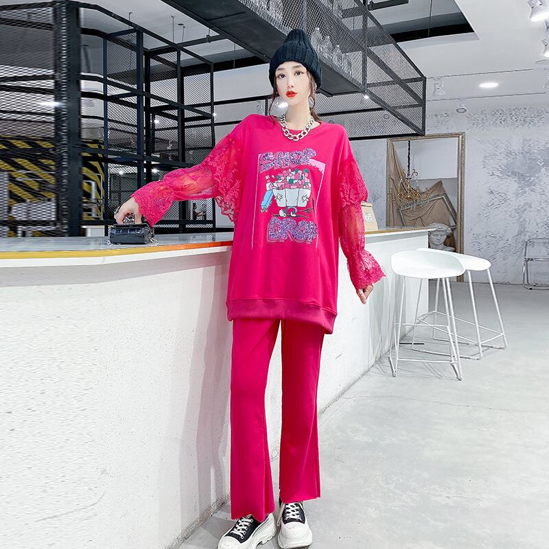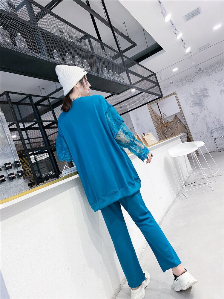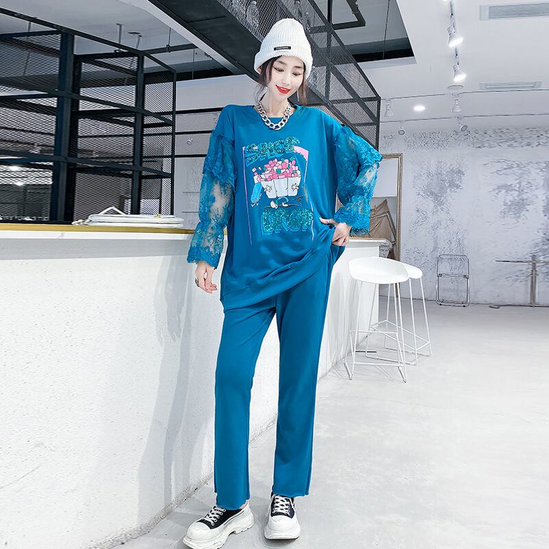 薄手レースラウンドネックTシャツ カジュアルパンツ ロング 大きめサイズ Oネック ミックスインファッション2022837006