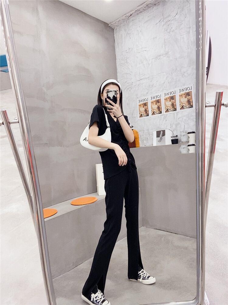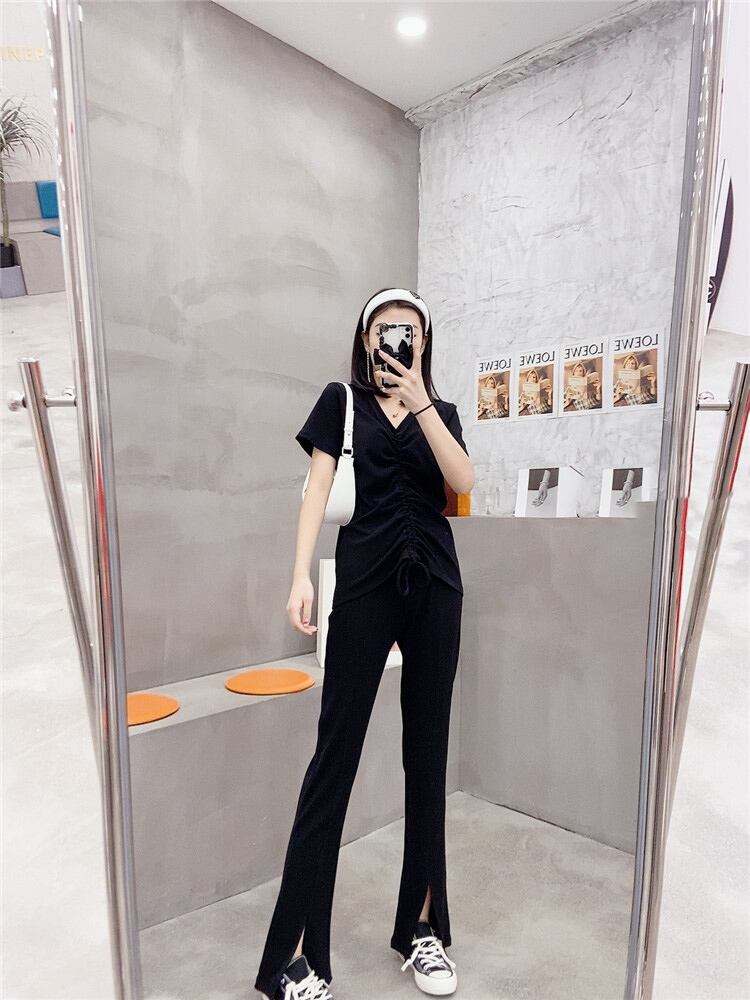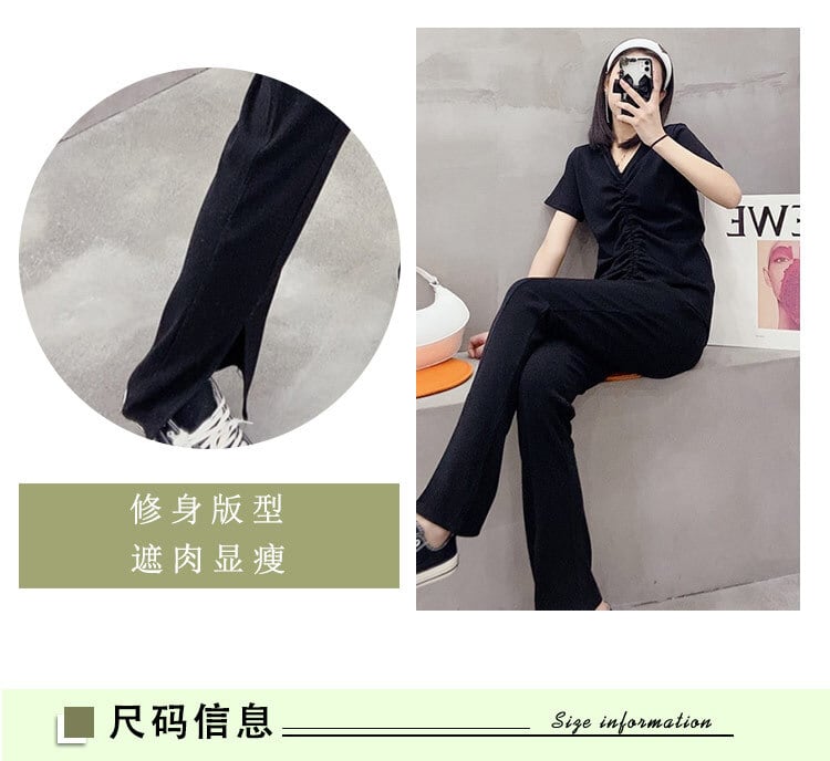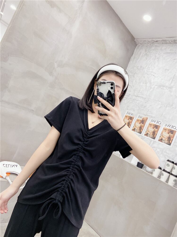 サマーVネックギャザーTシャツ ハイウェストルーズ 大きめサイズ 夏物 ミックスインファッション12235548712