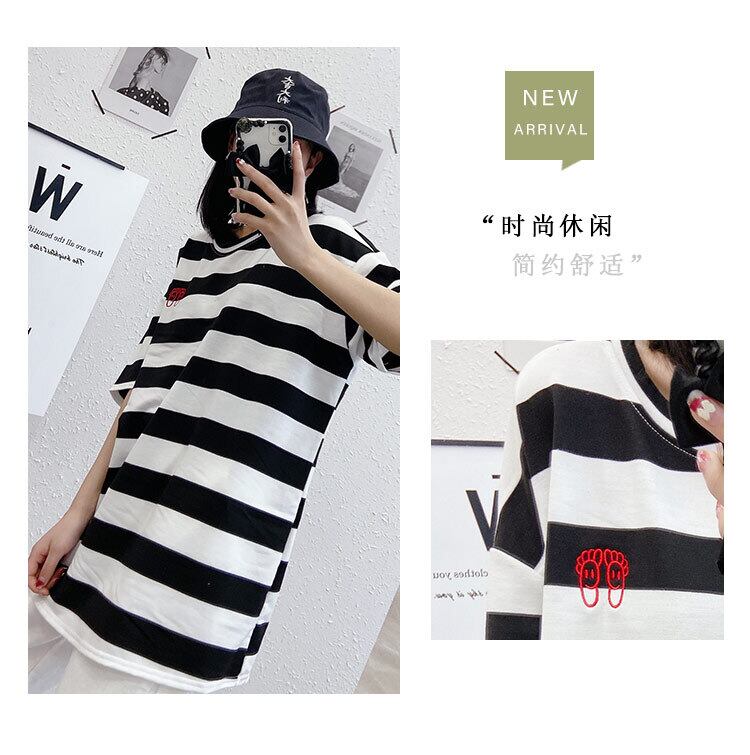 ストライプTシャツ ラウンドネックルーズロングトップス 大きめサイズ Oネック ミックスインファッション8422924496