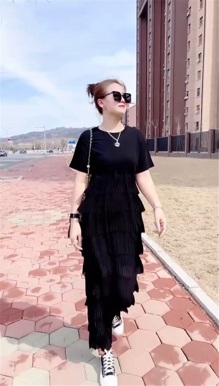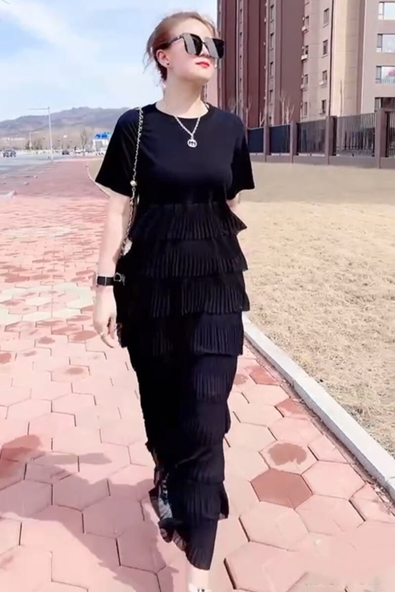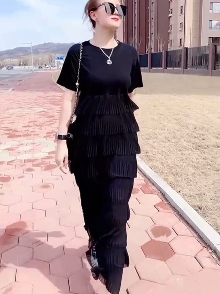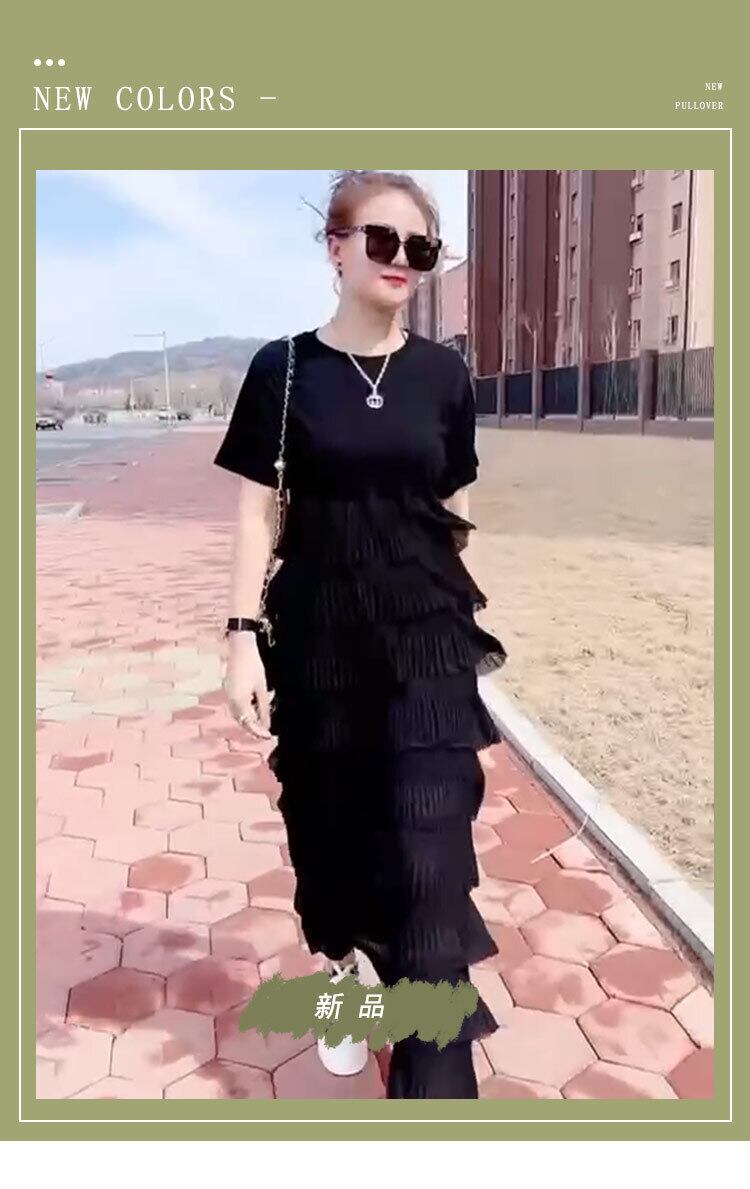 サマードレス ラウンドネック半袖スリーブメッシュスカート ハーフスリーブ 大きめサイズ 夏物 Oネック マルチレイヤー ステッチ ミックスインファッション95955447975