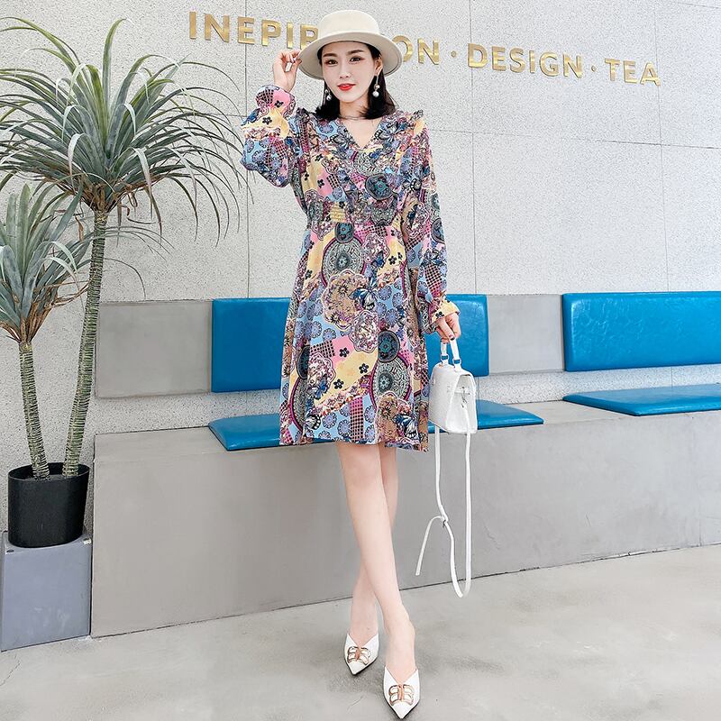 フローラルVネックプリーツAラインスカート ストレッチ ロング エラスティック 伸縮 大きめサイズ 花柄 ミックスインファッション53122172051