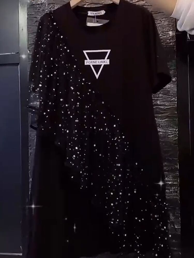 トライアングルパターンスパンコールメッシュ半袖スリーブドレス ハーフスリーブ 大きめサイズ ステッチ ミックスインファッション6719911898