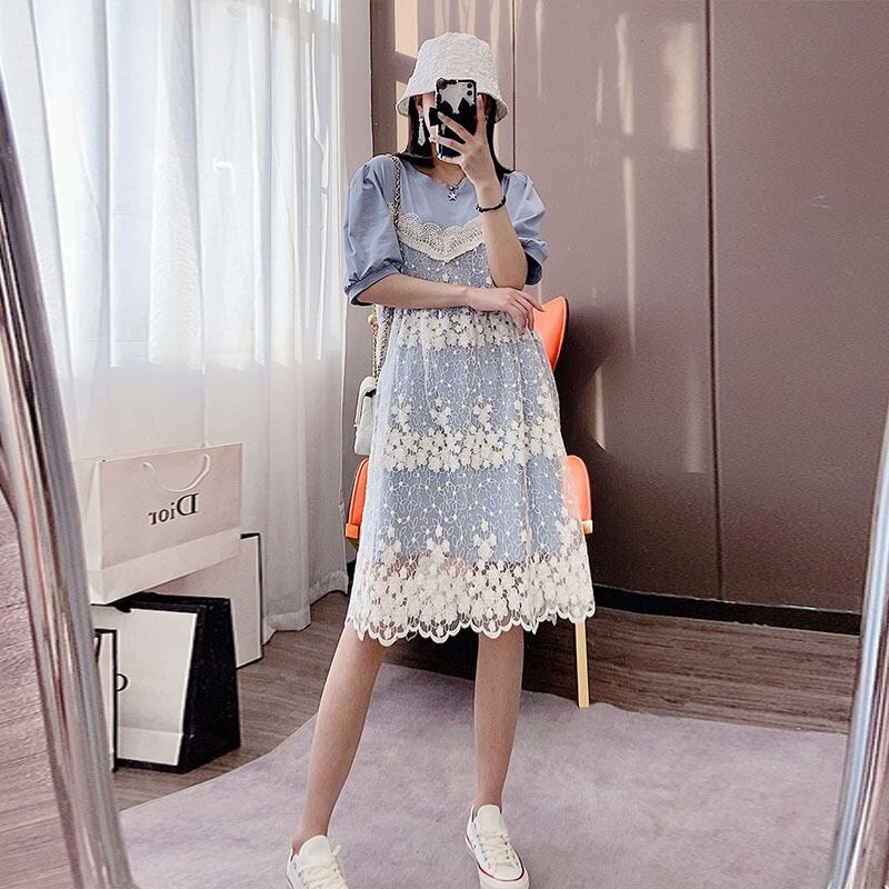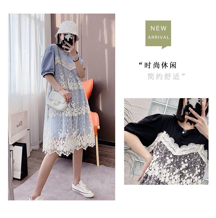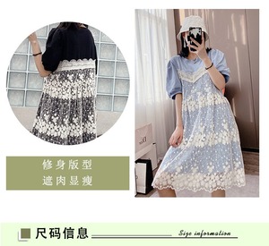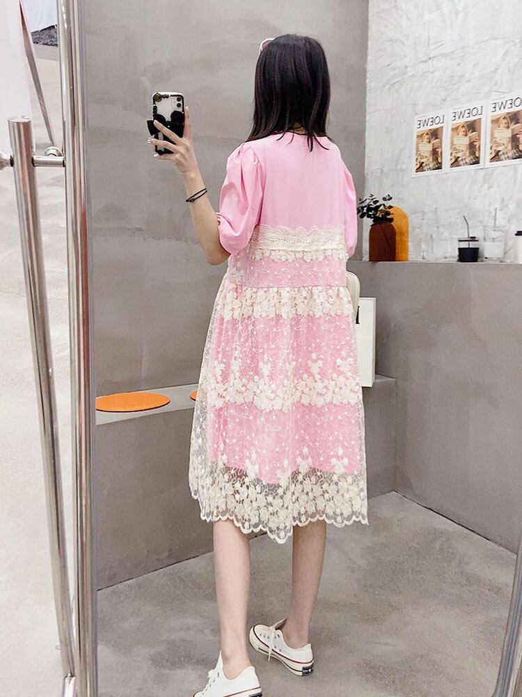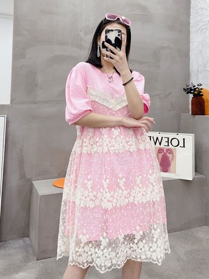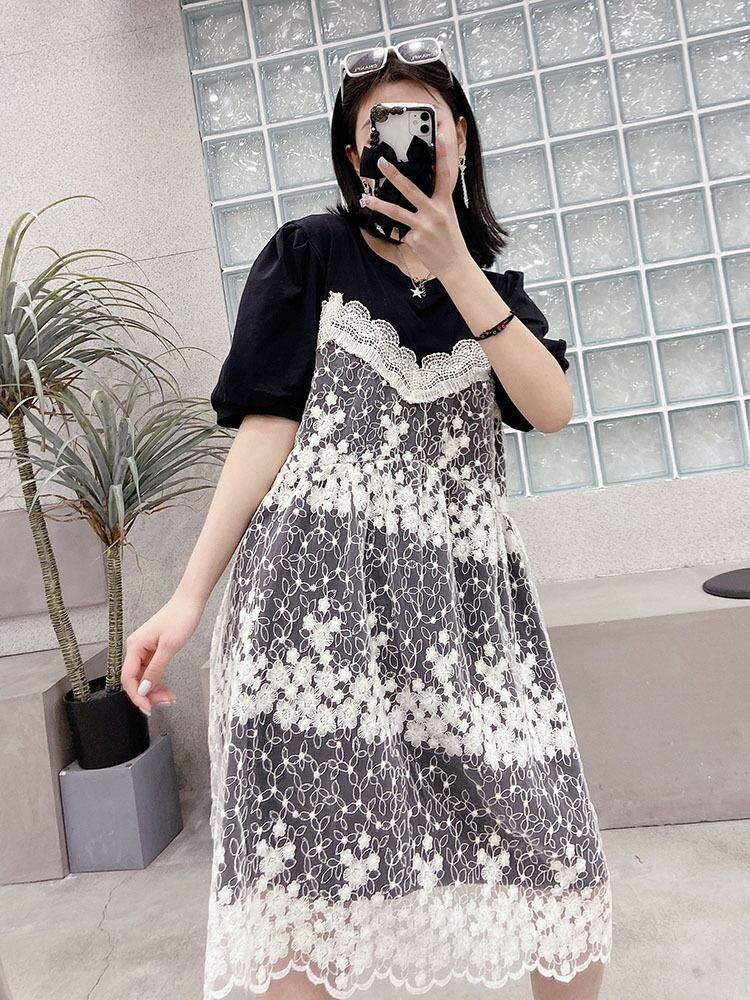 スカート ラウンドネックレース半袖スリーブドレス ハーフスリーブ 大きめサイズ 大人ガーリー スウィート キュート カジュアル Oネック ステッチ ミックスインファッション71715071288