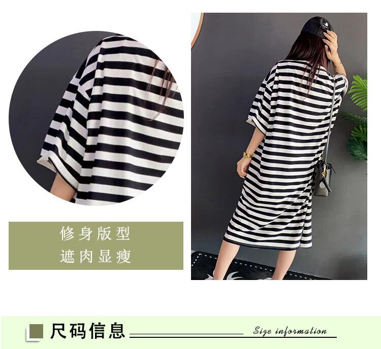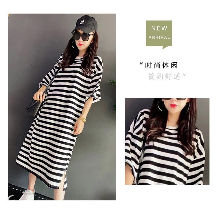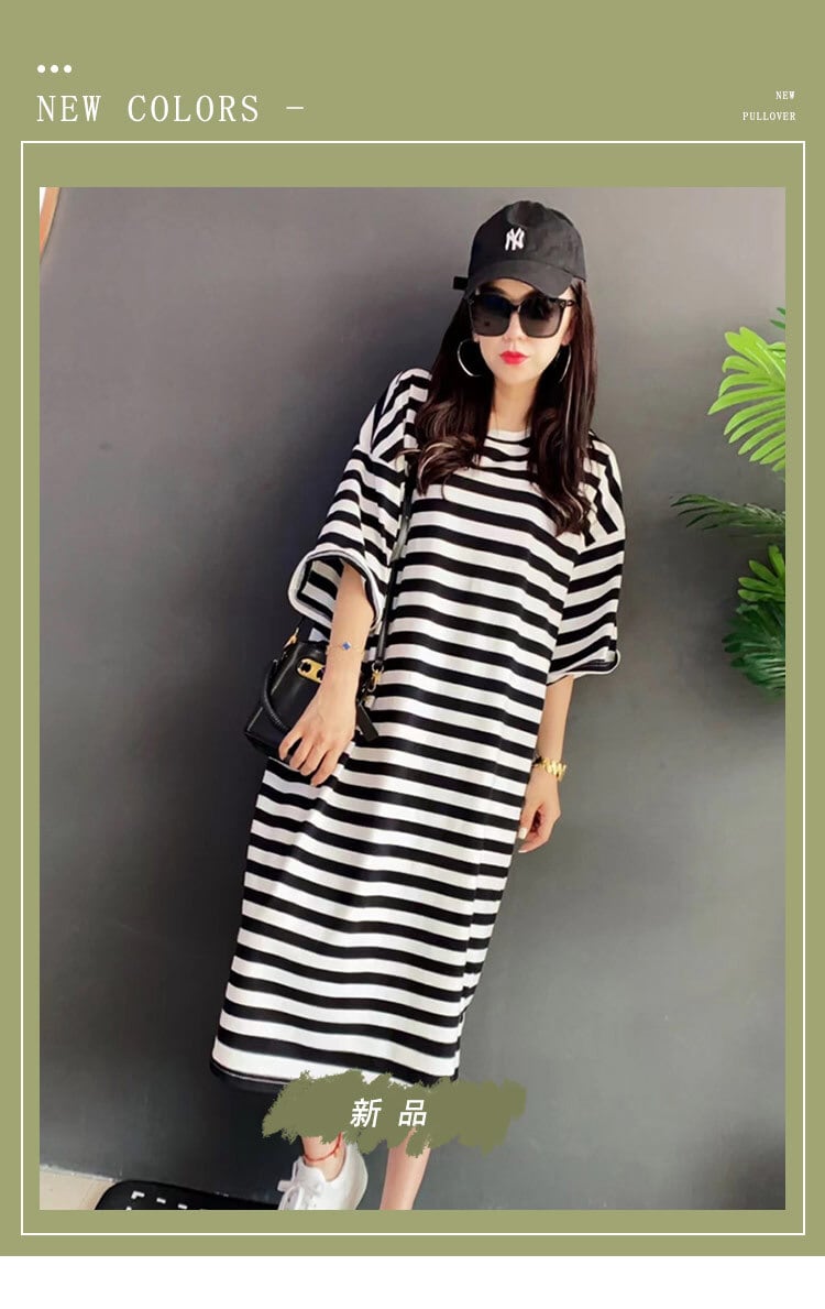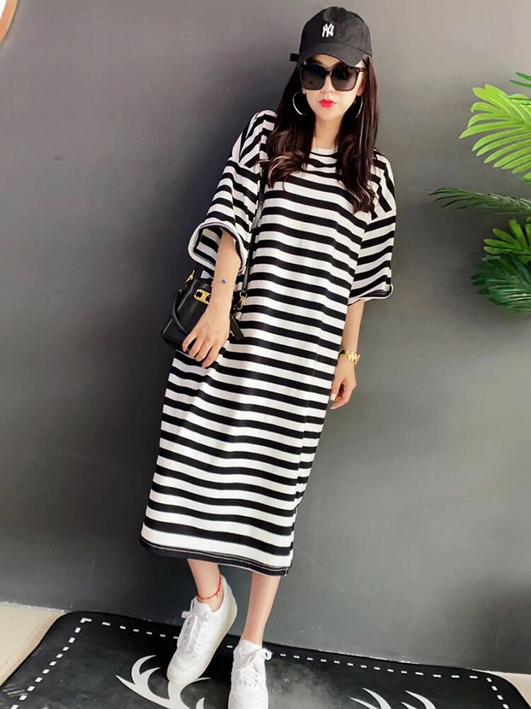 ラウンドネックストライプルーズロングドレス ストリート 大きめサイズ Oネック ミックスインファッション24997756498