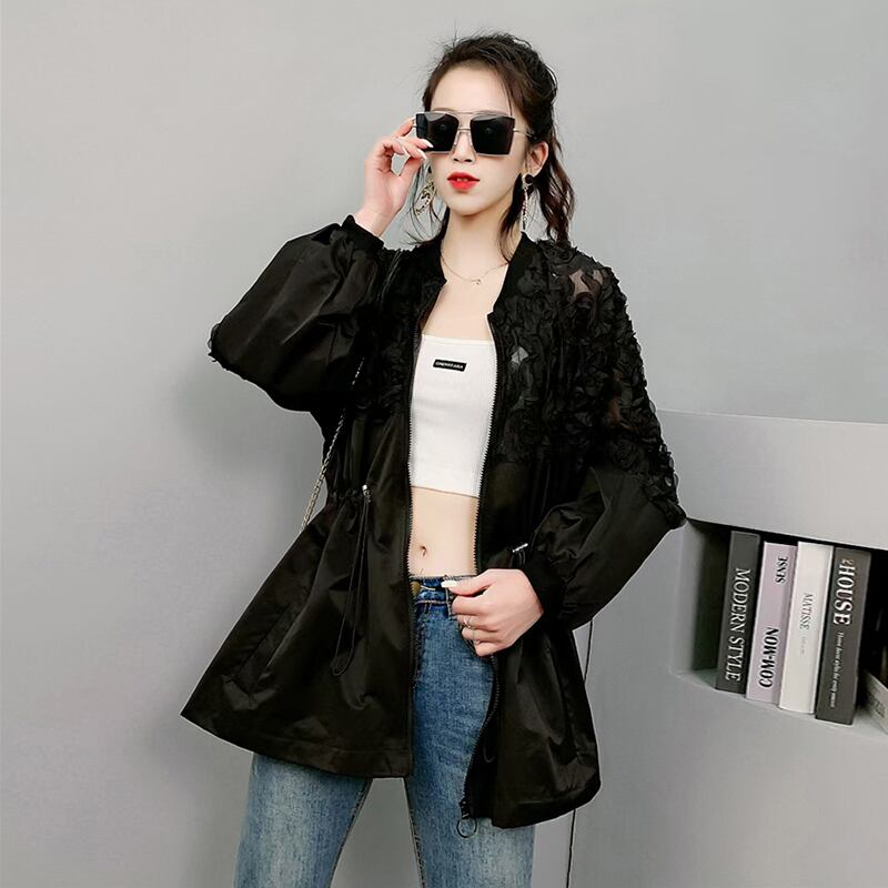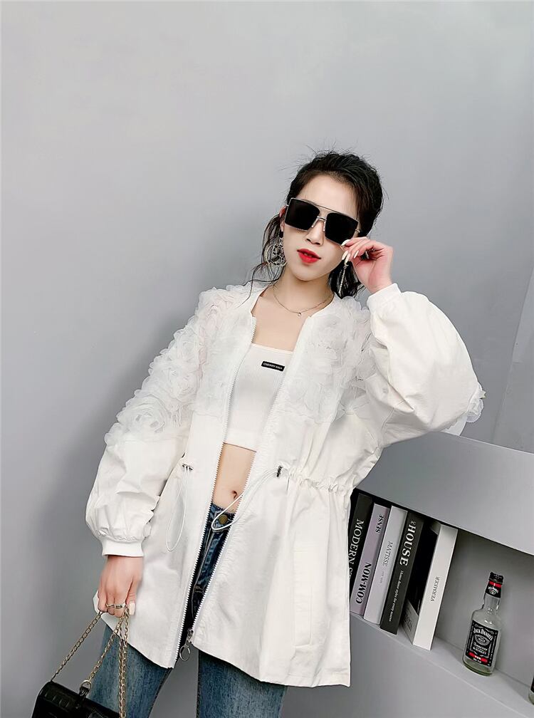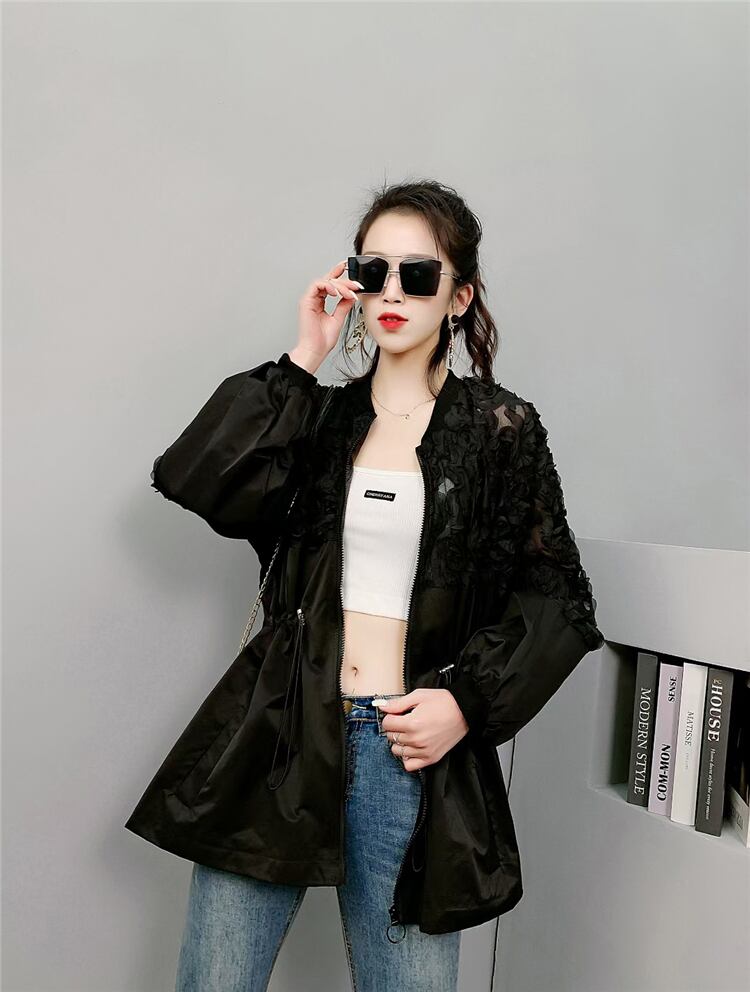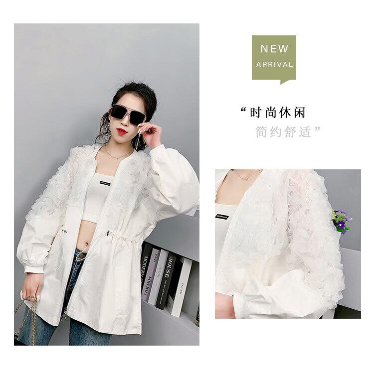 薄手レースウェストギャザージッパージャケット 大きめサイズ 大人ガーリー スウィート キュート カジュアル フラワーデザイン ミックスインファッション89780865945