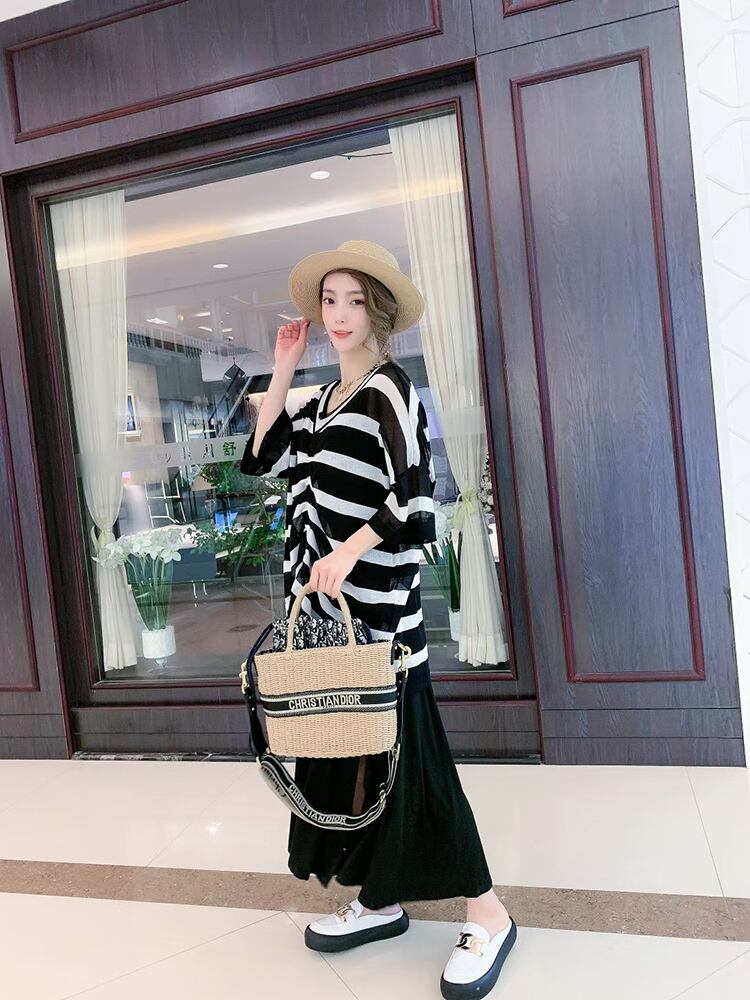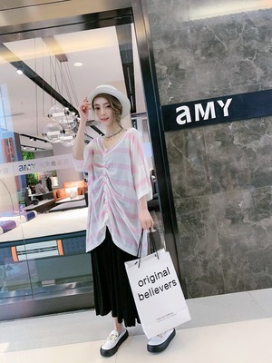 サマーストライプTシャツ レディースルーズ薄手Vネックギャザースタイルトップス 大きめサイズ 夏物 ミックスインファッション99254334198