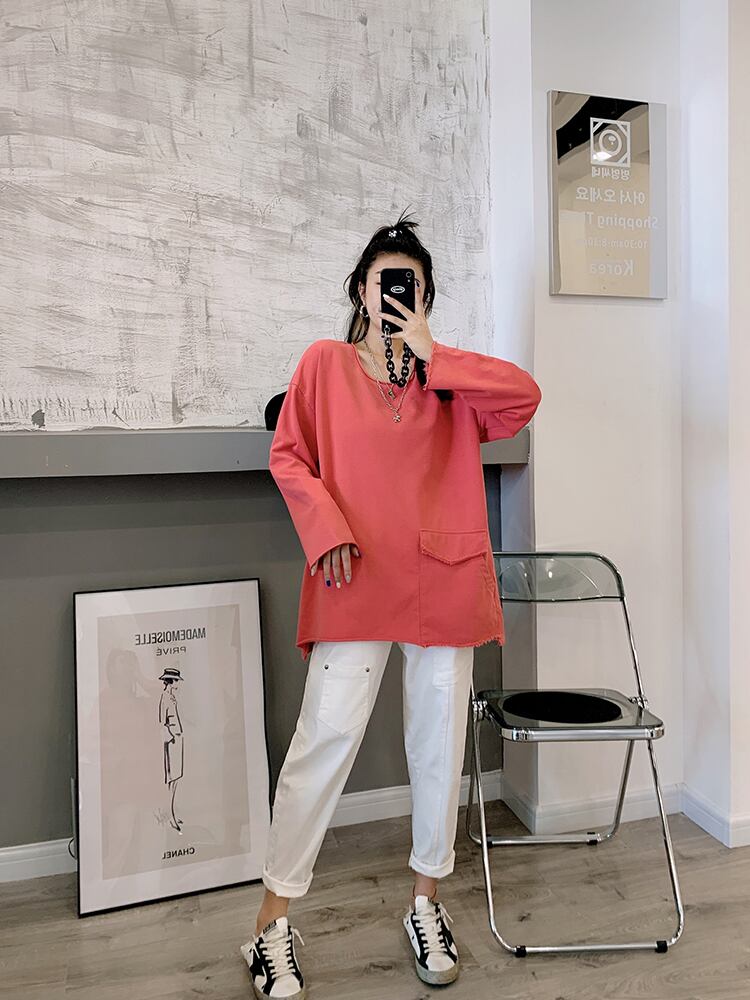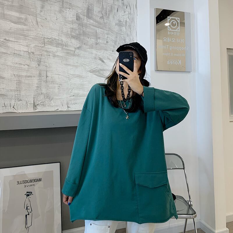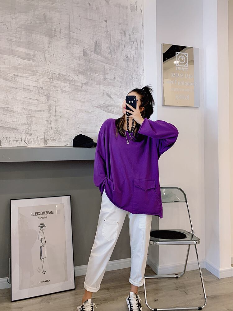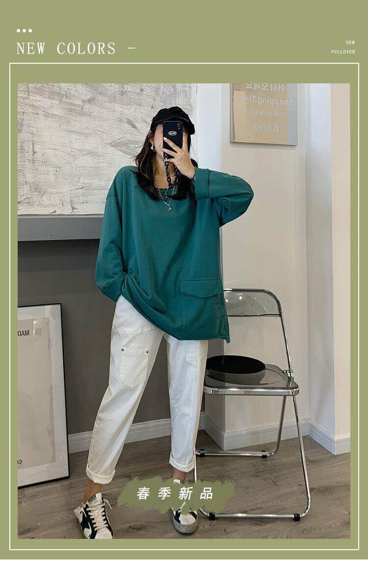 スタイルルーズセーター ラウンドネックプルオーバー ソリッド カラーシングルサイドポケットカジュアル 大きめサイズ Oネック ソリッドカラー ミックスインファッション10815085161