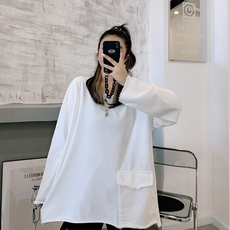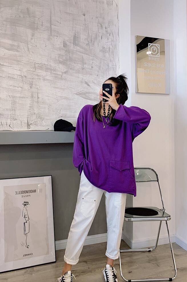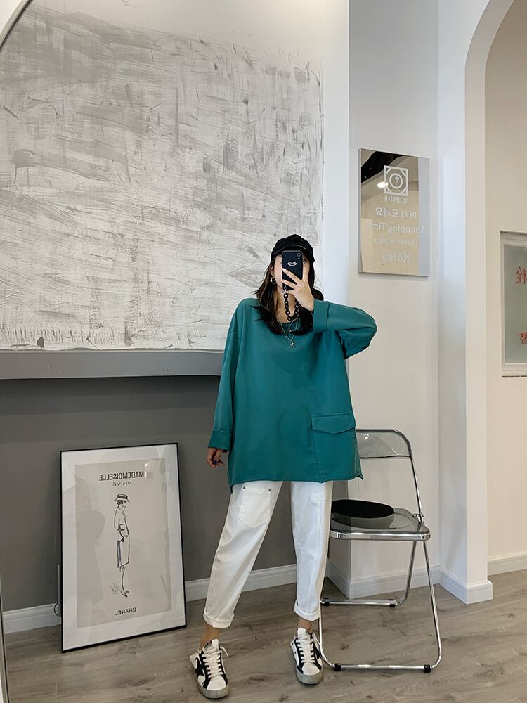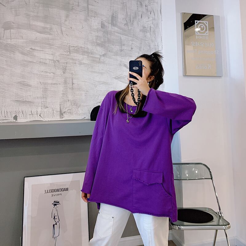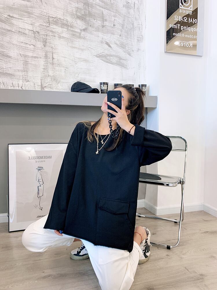 スタイルルーズセーター ラウンドネックプルオーバー ソリッド カラーシングルサイドポケットカジュアル 大きめサイズ Oネック ソリッドカラー ミックスインファッション10815085161
