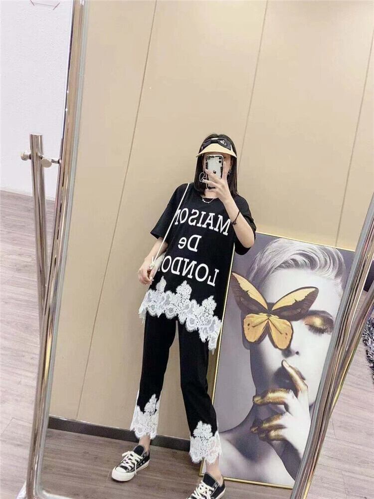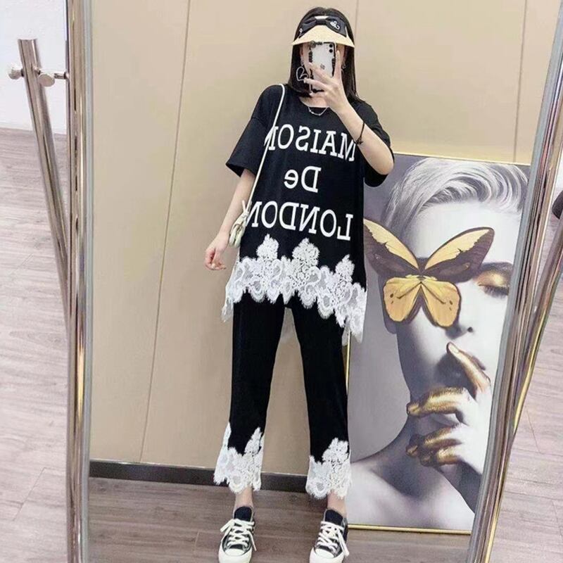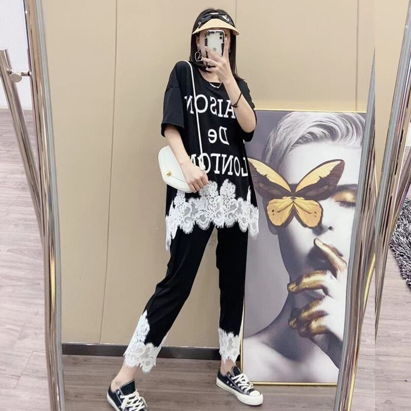 ラウンドネックレースブラウス パンツ 大きめサイズ Oネック ステッチ ミックスインファッション25981304815