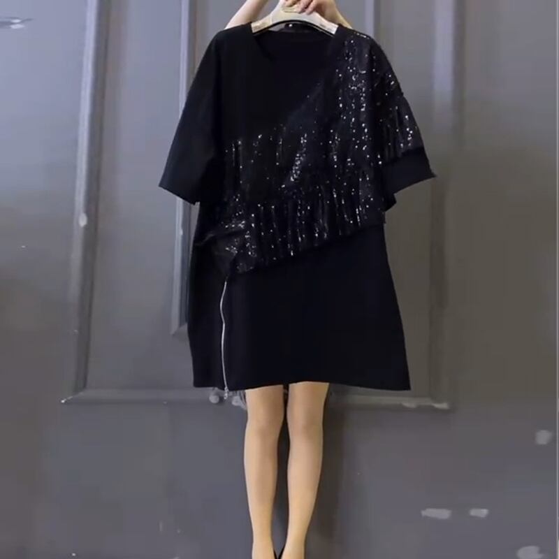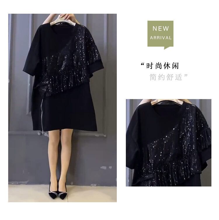 ラウンドネック半袖スリーブメッシュサイドジッパードレス サマースタイルルーズスカート ハーフスリーブ 夏物 Oネック ステッチ ミックスインファッション69467559499