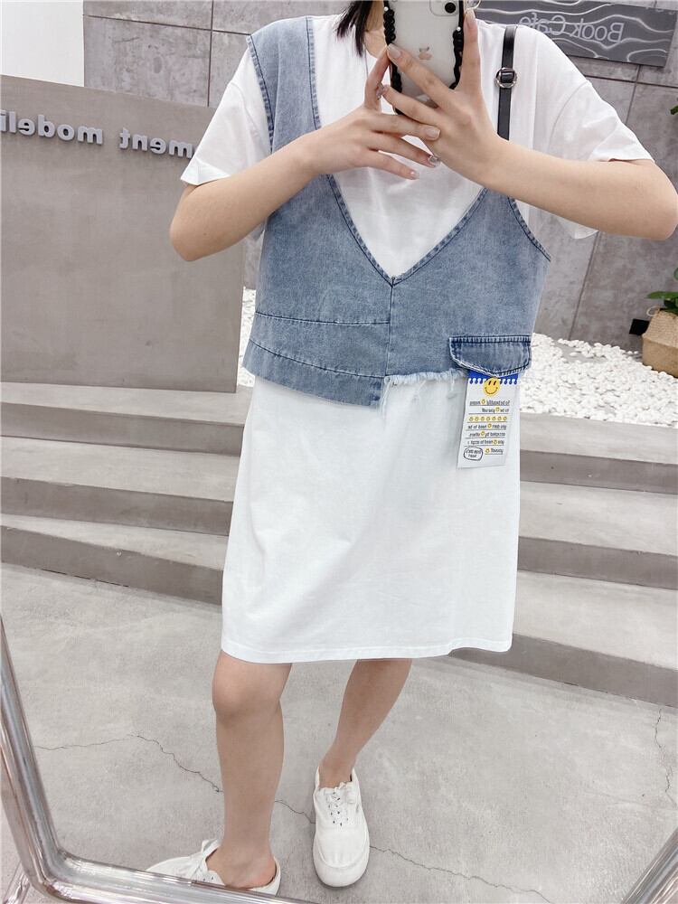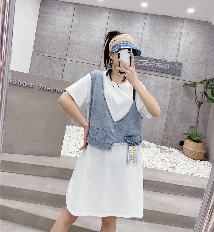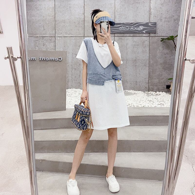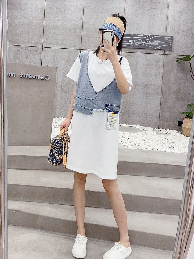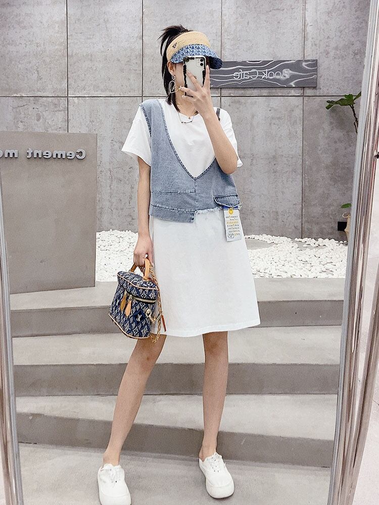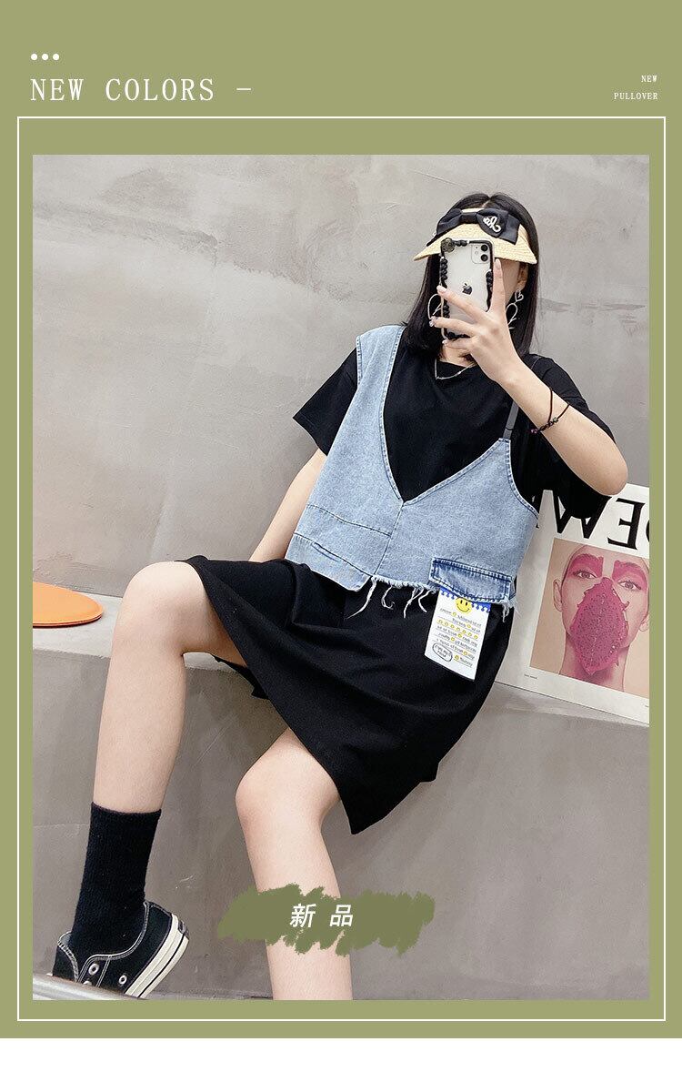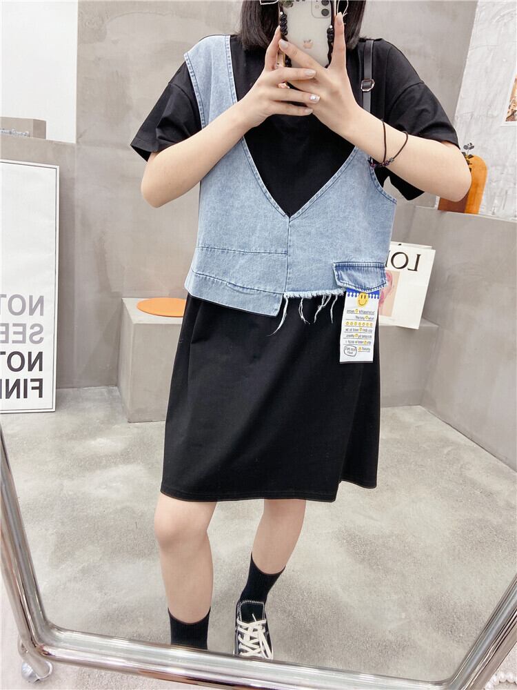 サマーラウンドネックドレス 大きめサイズ 夏物 Oネック ステッチ ミックスインファッション26226909549