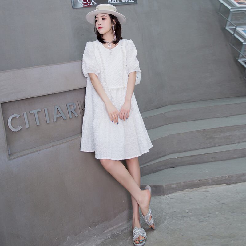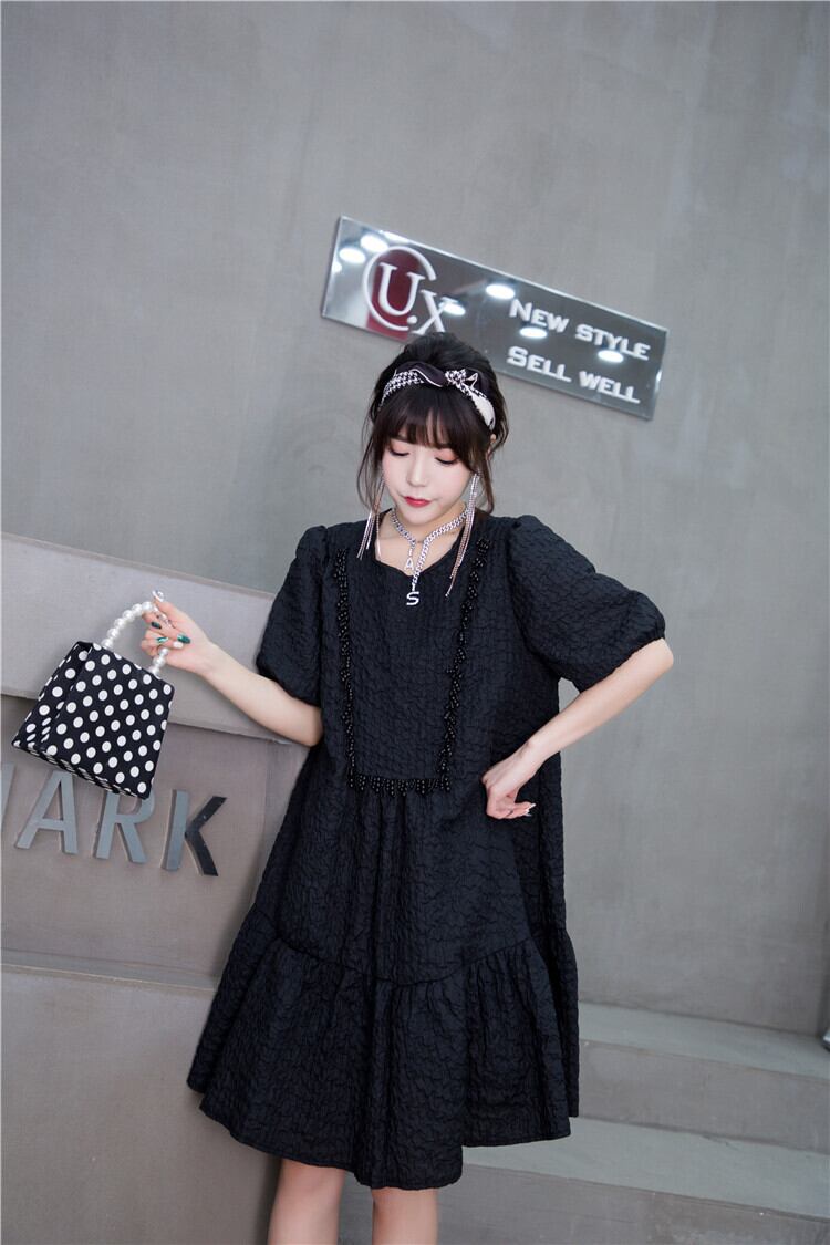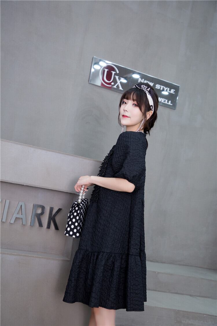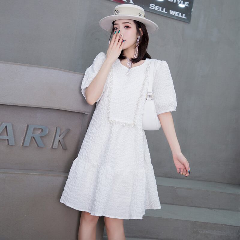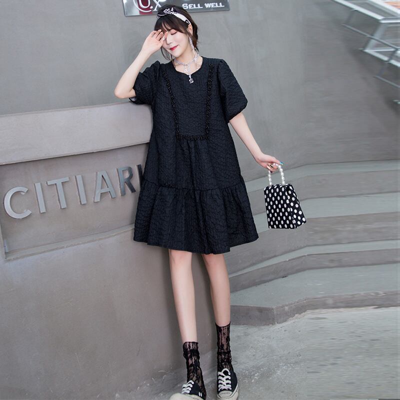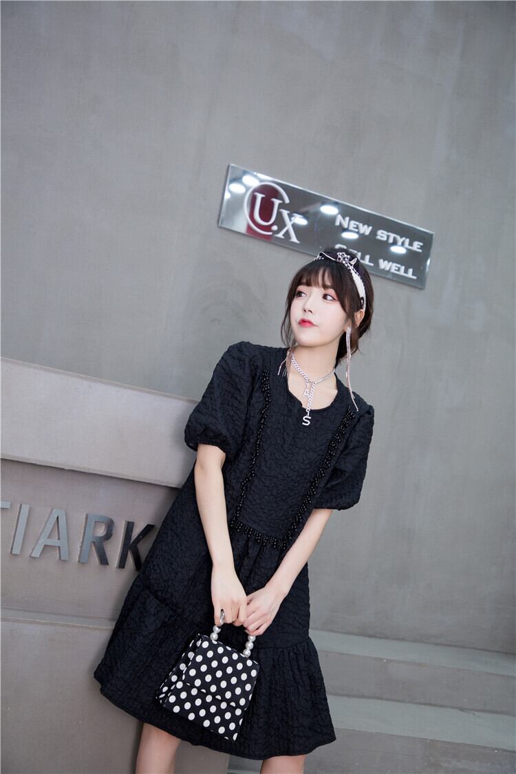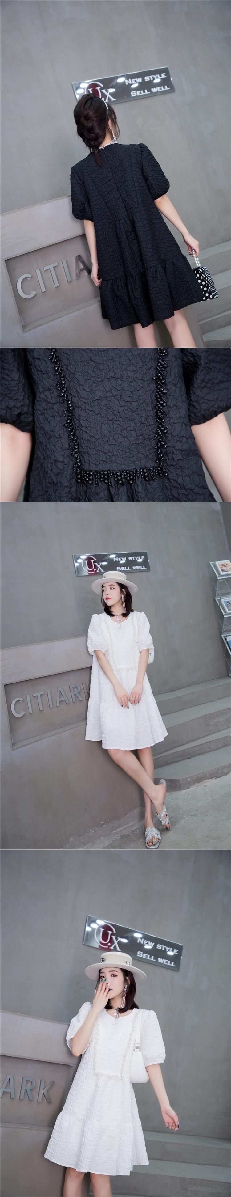 サマージャカードラウンドネックウェスト半袖スリーブドレス ハーフスリーブ 大きめサイズ 大人ガーリー スウィート キュート カジュアル 夏物 Oネック ミックスインファッション73543238355