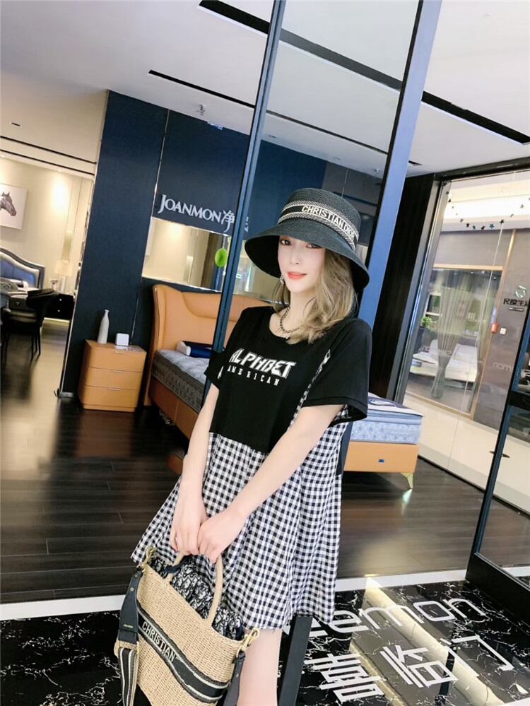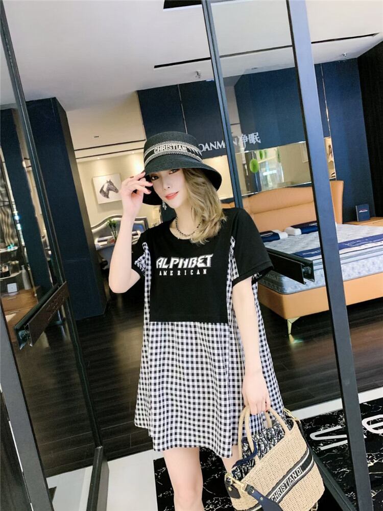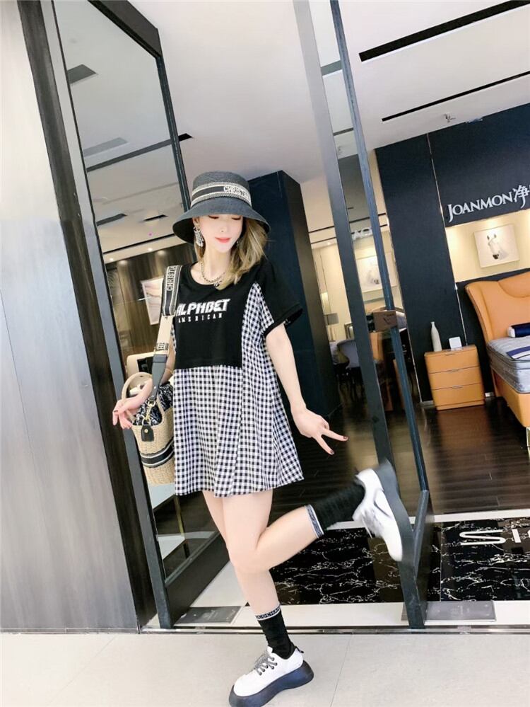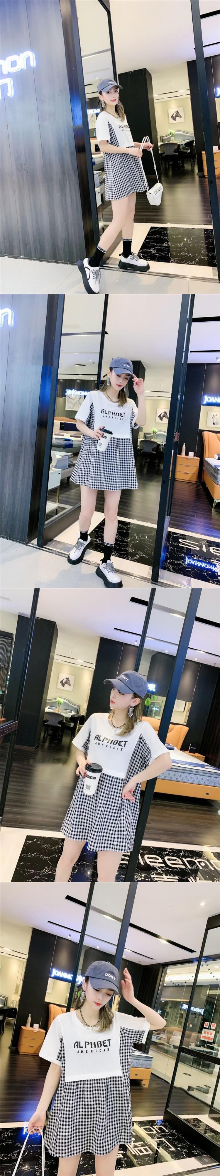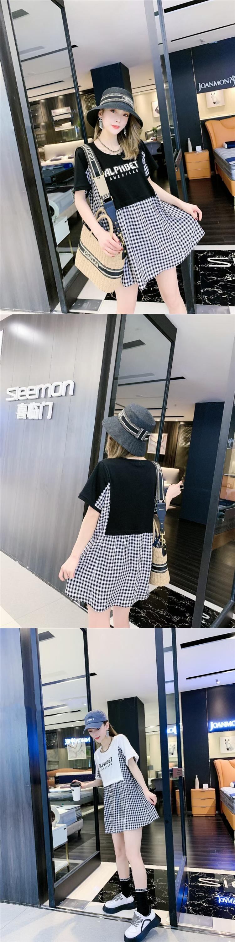 サマーラウンドネック半袖スリーブブラックホワイト格子柄ドレス ロング薄手 ショート ハーフスリーブ 大きめサイズ 夏物 Oネック ステッチ ミックスインファッション83758983971