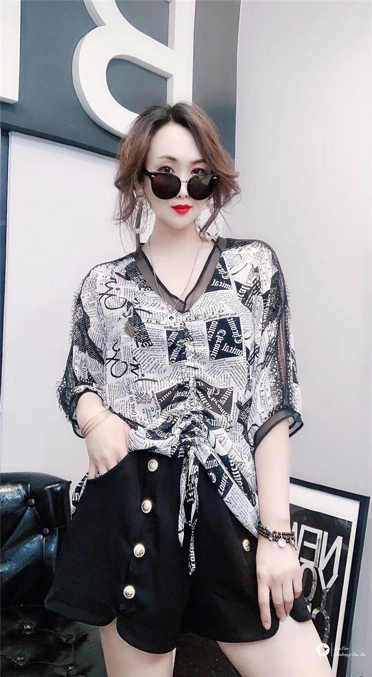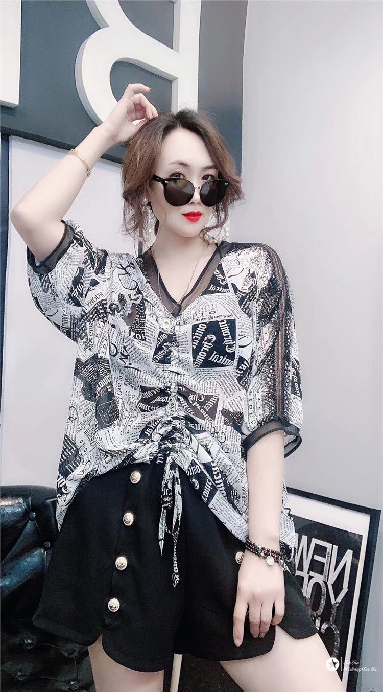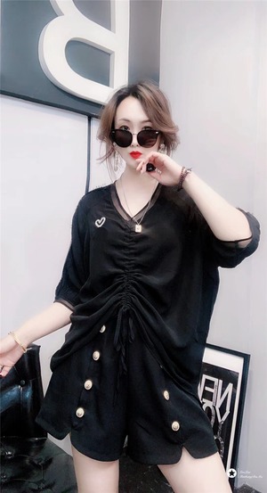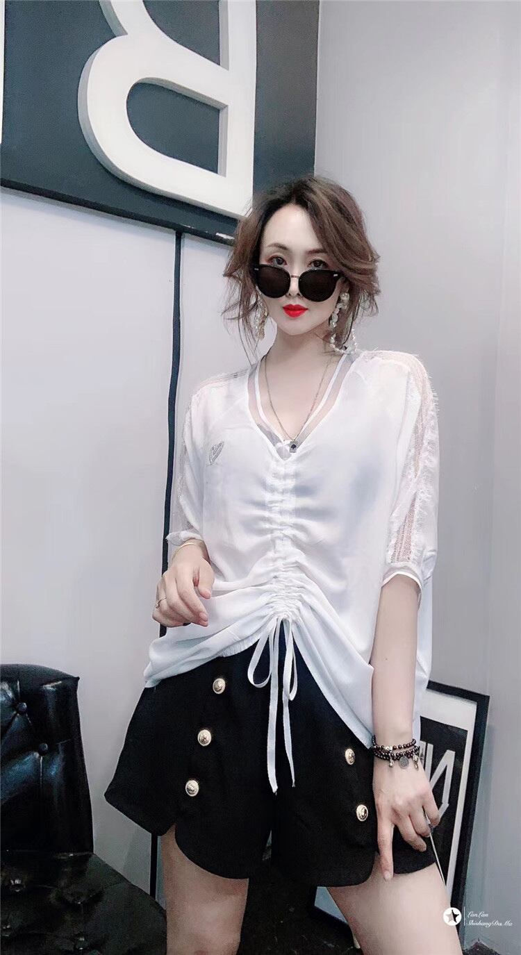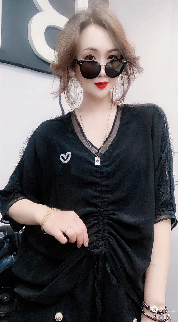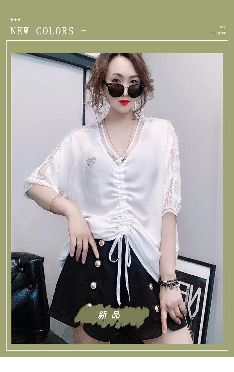 サマーVネックギャザーシャツ ルーズ薄手スタイルトップス Tシャツ ショーツ 大きめサイズ 夏物 ブルマー ミックスインファッション30297409843
