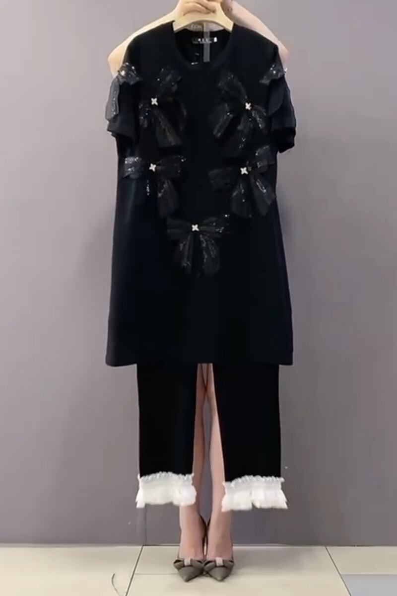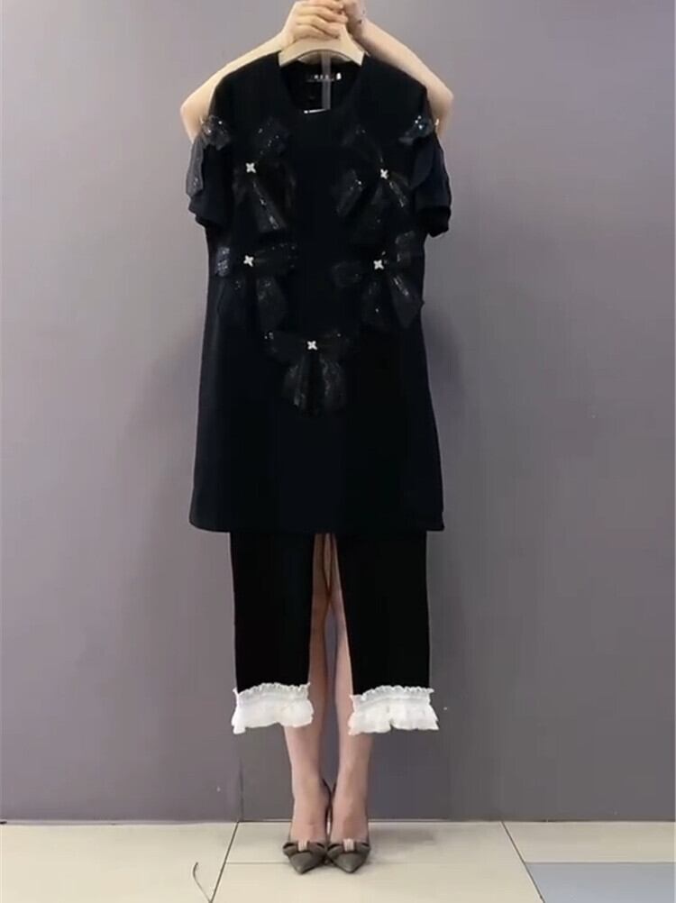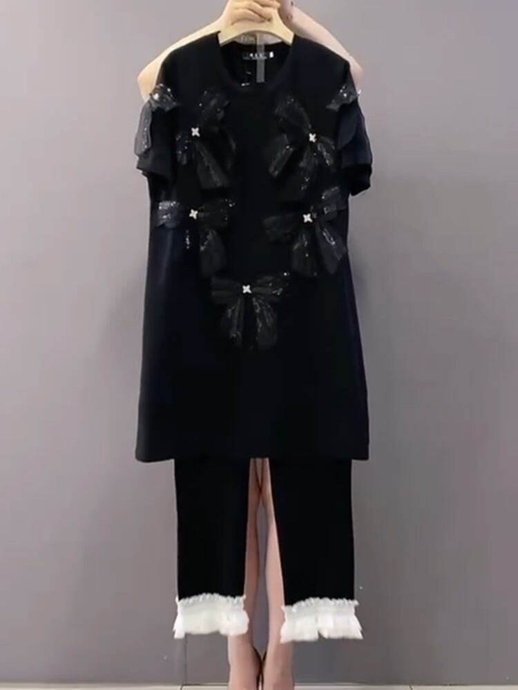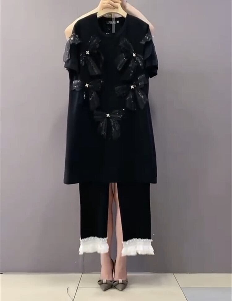 スプリングサマーラウンドネックリボンTシャツ カジュアルレース 大きめサイズ 春物 夏物 Oネック ステッチ ミックスインファッション51313197041