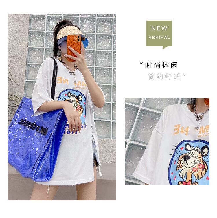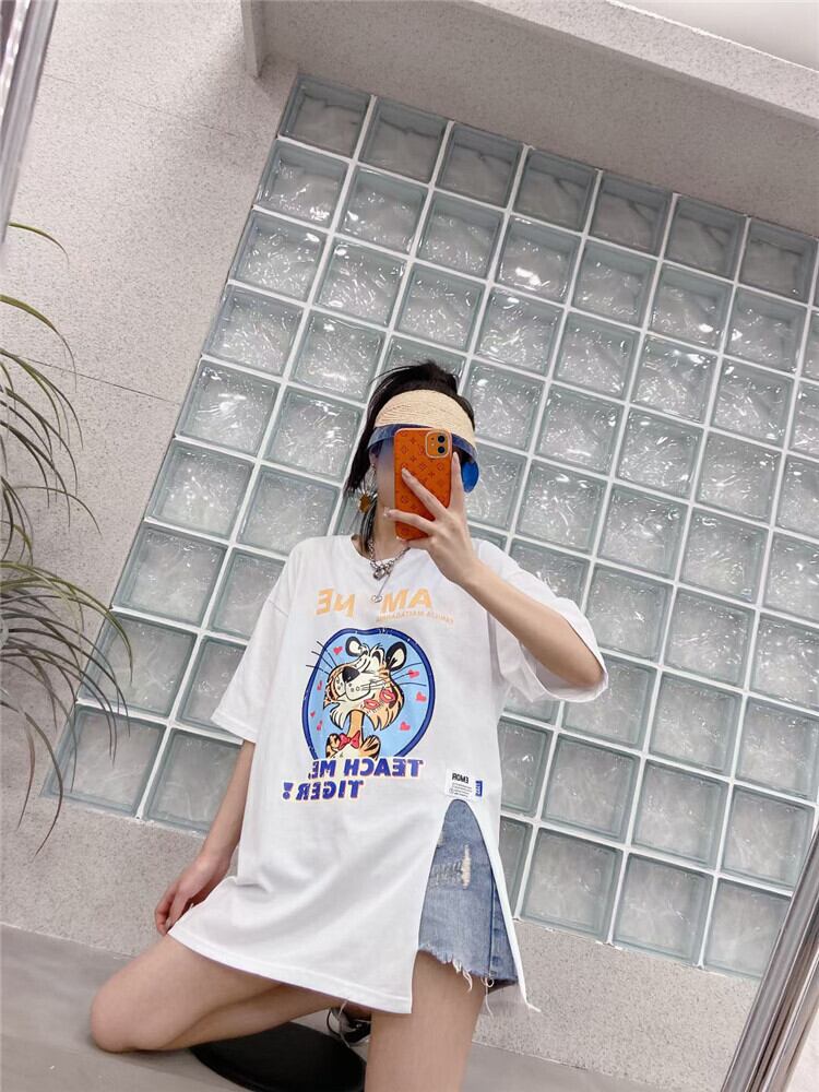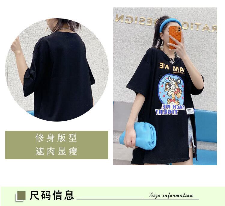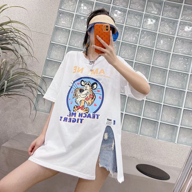 サマープリント柄サイドスリット薄手ルーズラウンドネック半袖スリーブTシャツ ショート ハーフスリーブ 大きめサイズ 夏物 Oネック ミックスインファッション26950655568