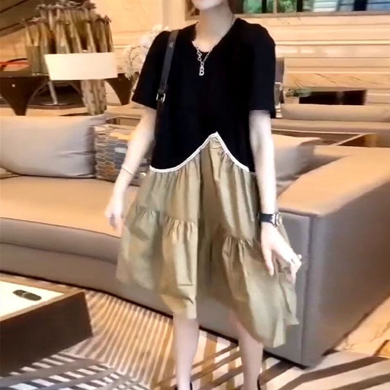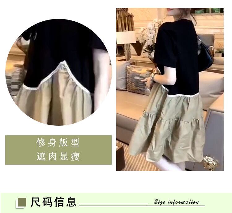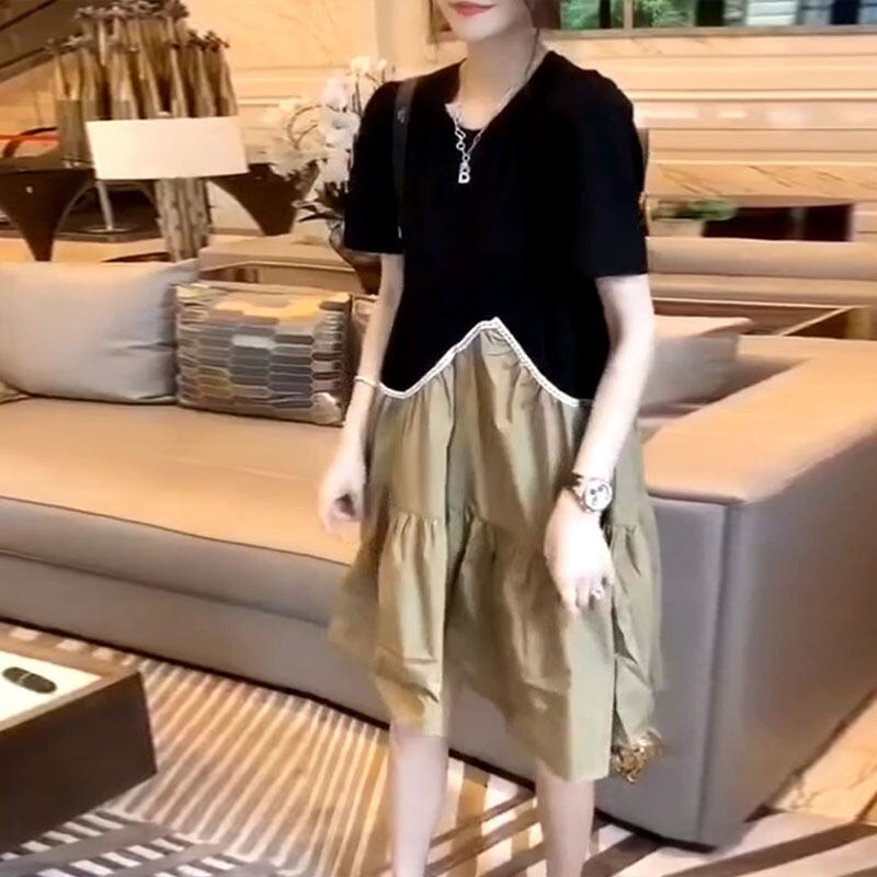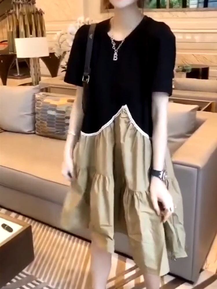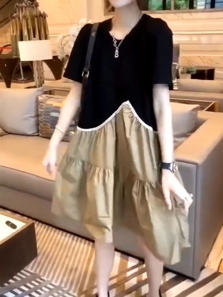 サマーラウンドネック半袖スリーブプリーツドレス ショート ハーフスリーブ 夏物 Oネック ステッチ ミックスインファッション81565453189