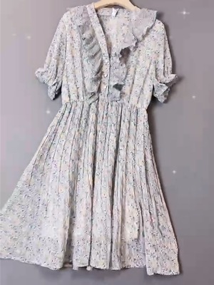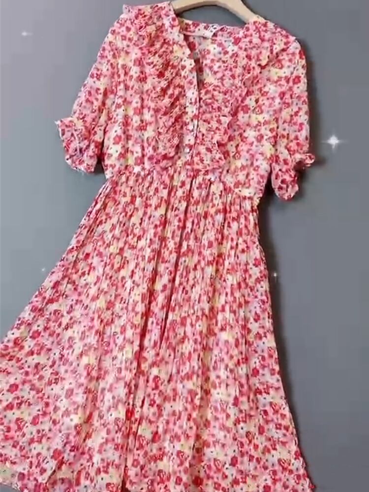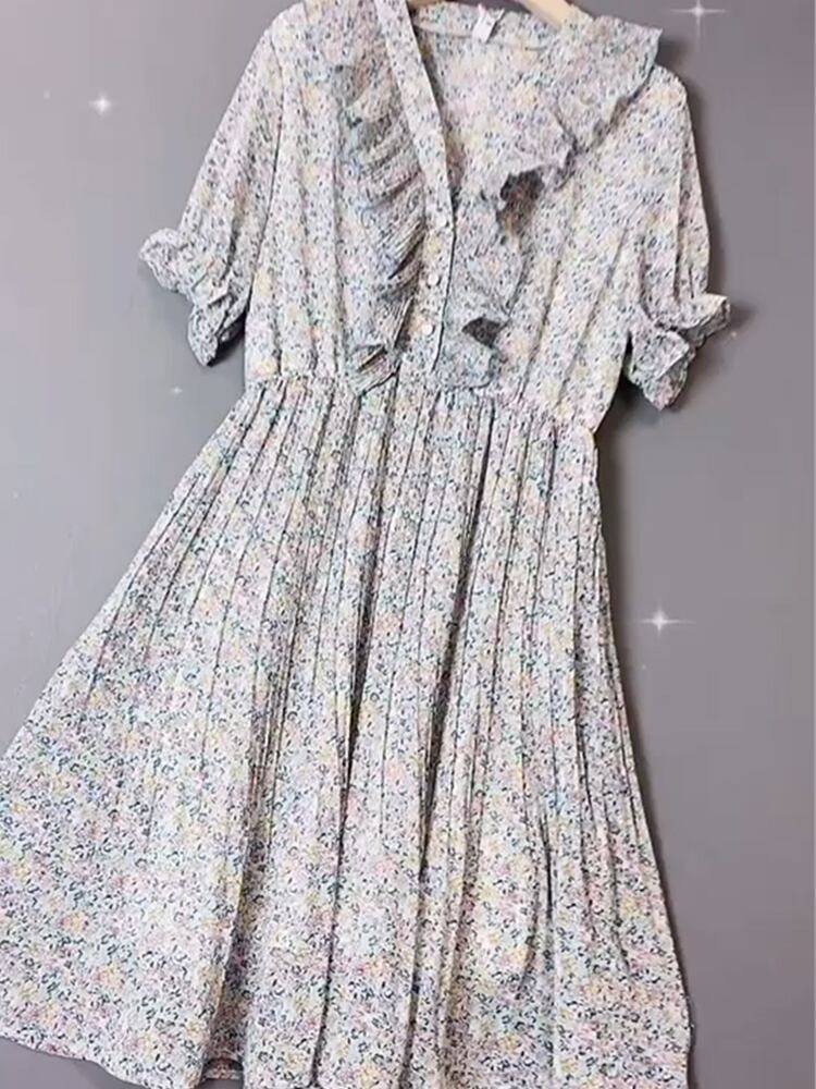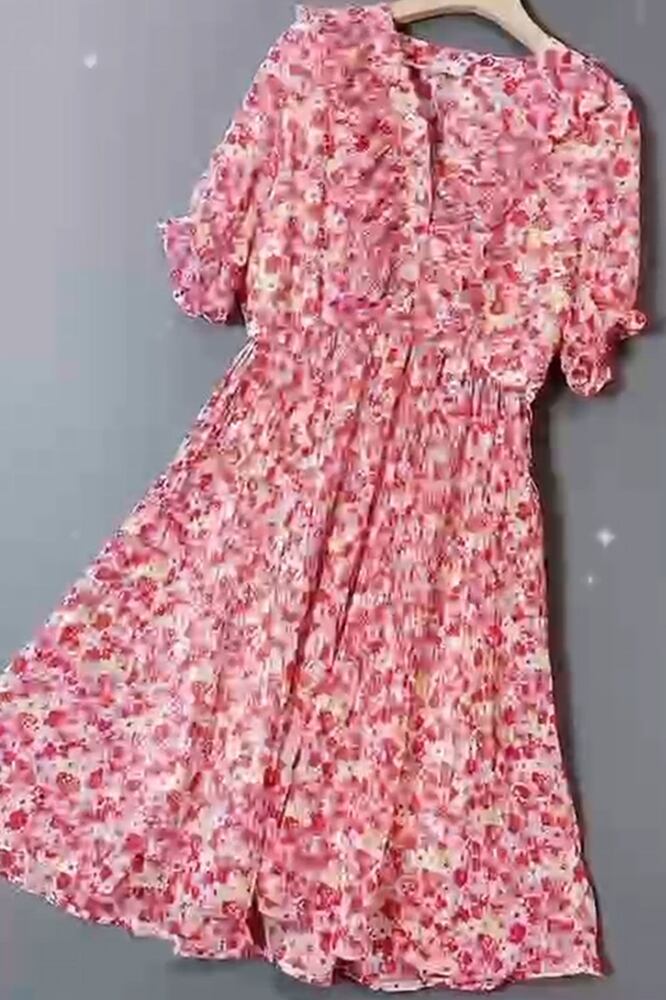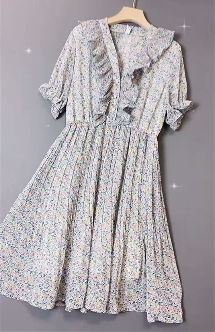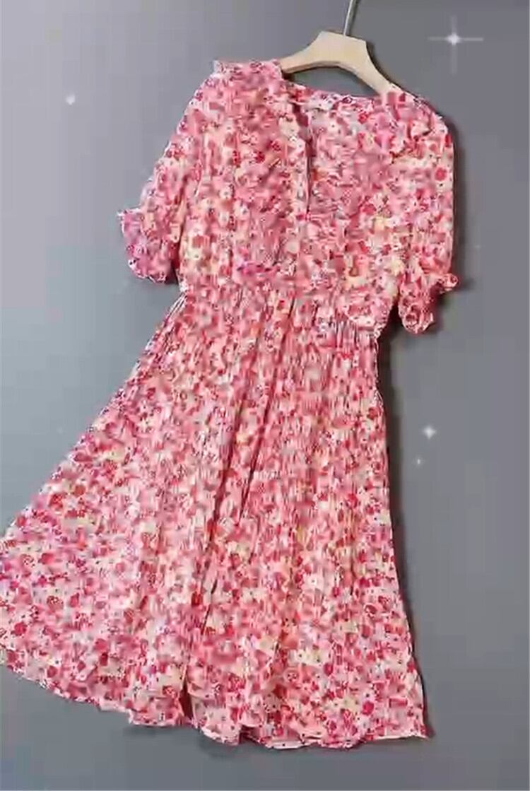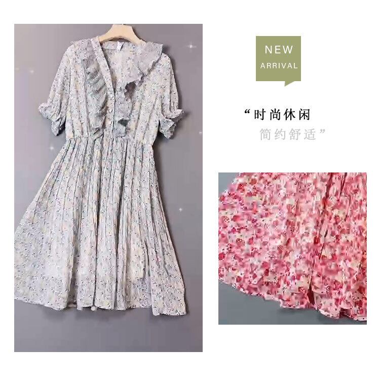 フローラルシフォンドレス サマースタイルウェスト半袖スリーブパターンプリーツスカート ハーフスリーブ 夏物 花柄 ミックスインファッション65189874657