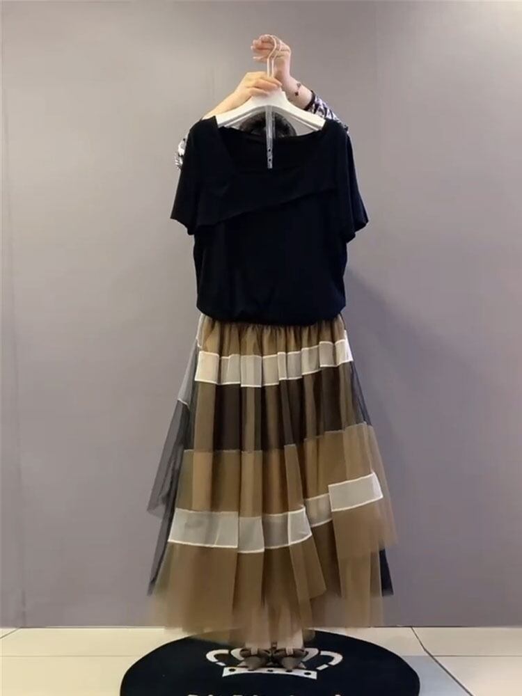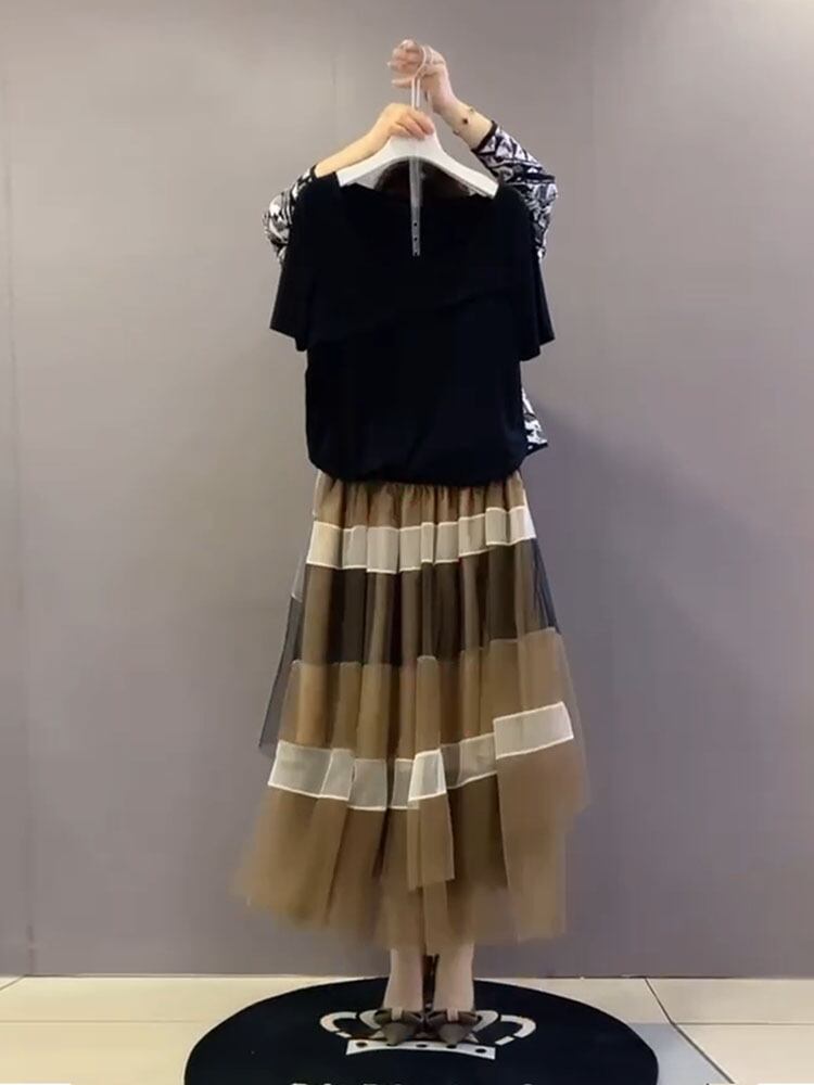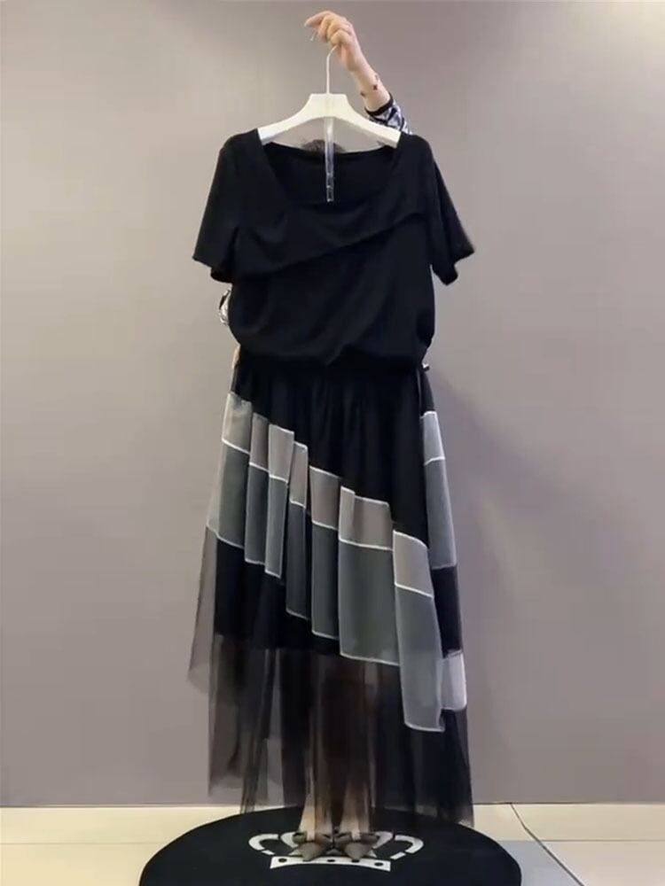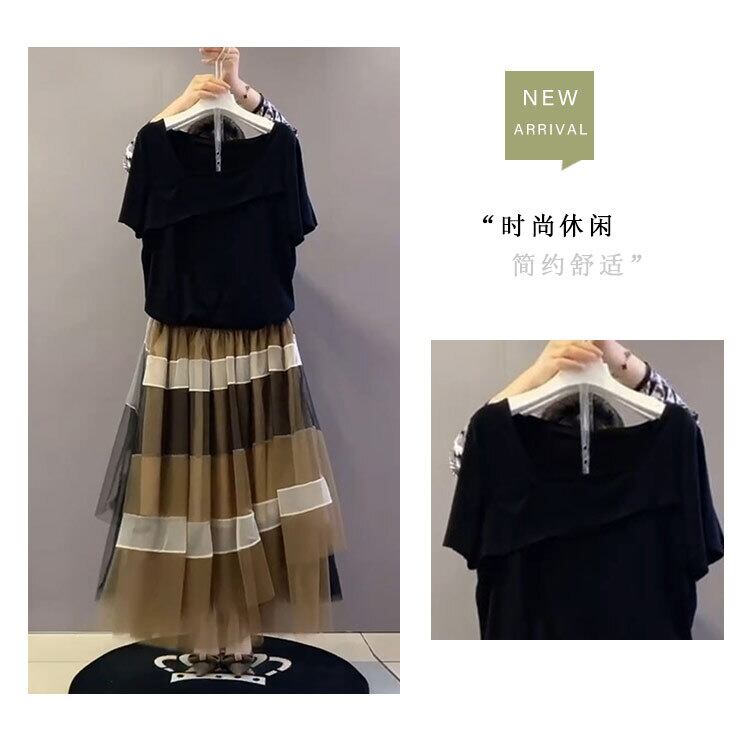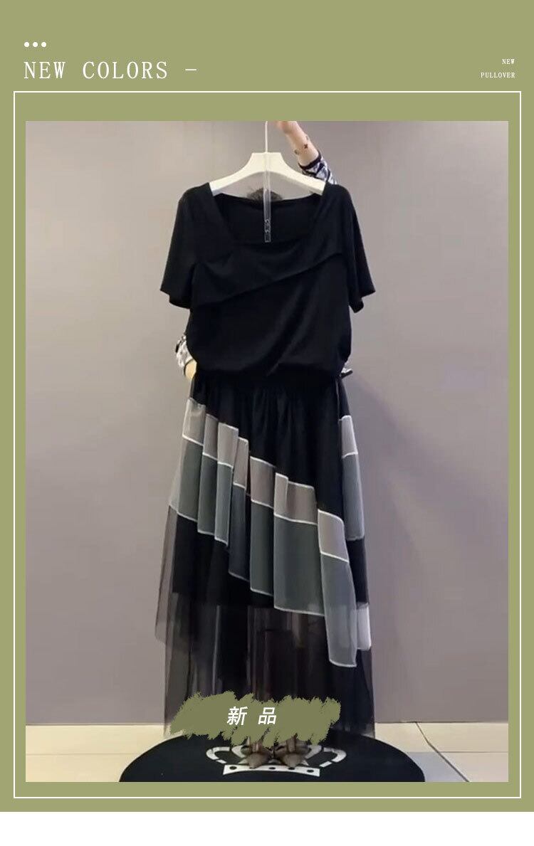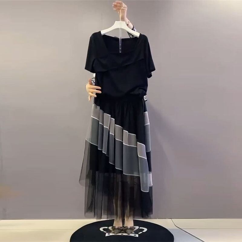 サマースタイル薄手カラー半袖スリーブTシャツ メッシュスカート ハーフスリーブ 大きめサイズ 夏物 スクウェア ミックスインファッション54858193166