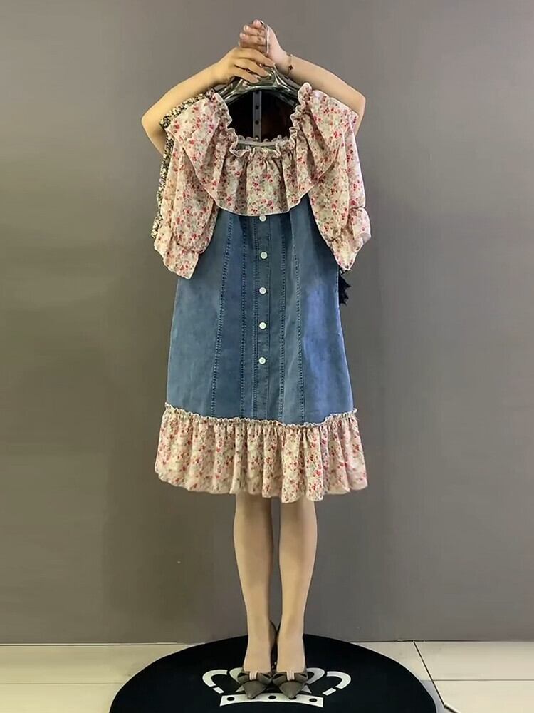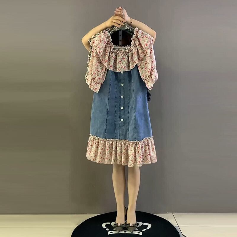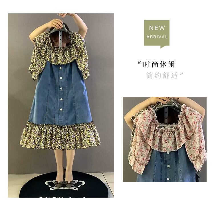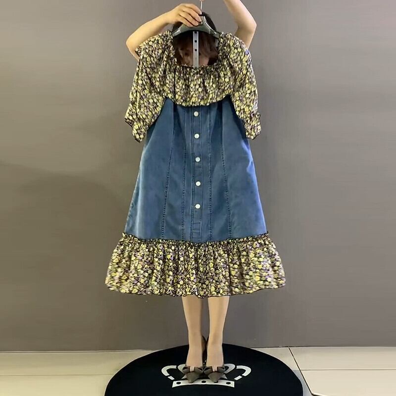 サマーラウンドネックフローラルドレス ウェスト薄手ロングスカート 大きめサイズ 夏物 花柄 Oネック ステッチ ミックスインファッション7022831924