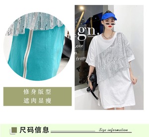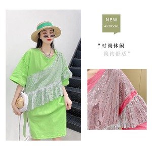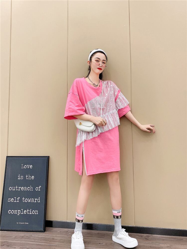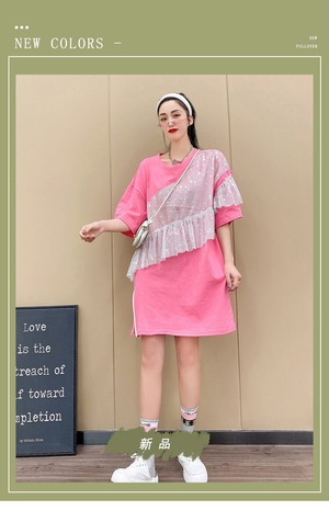 メッシュレーススカート サマーラウンドネックドレス 大きめサイズ 夏物 Oネック ステッチ ミックスインファッション95101397172