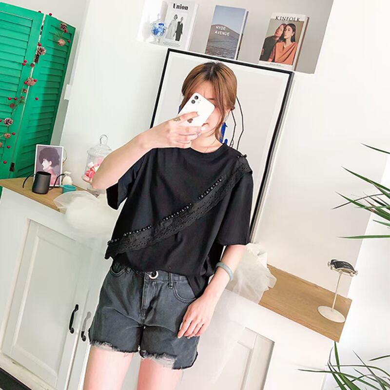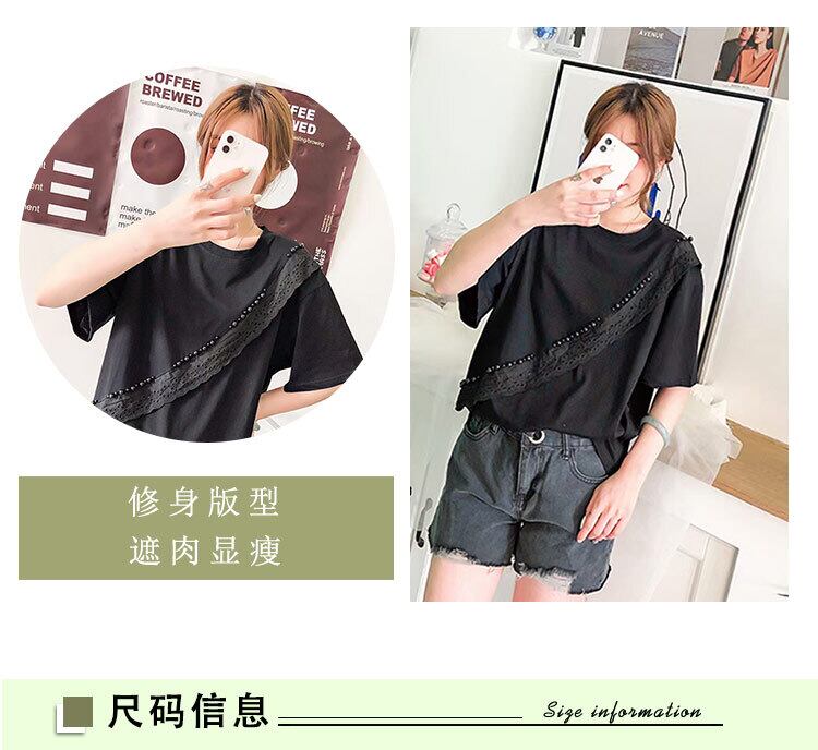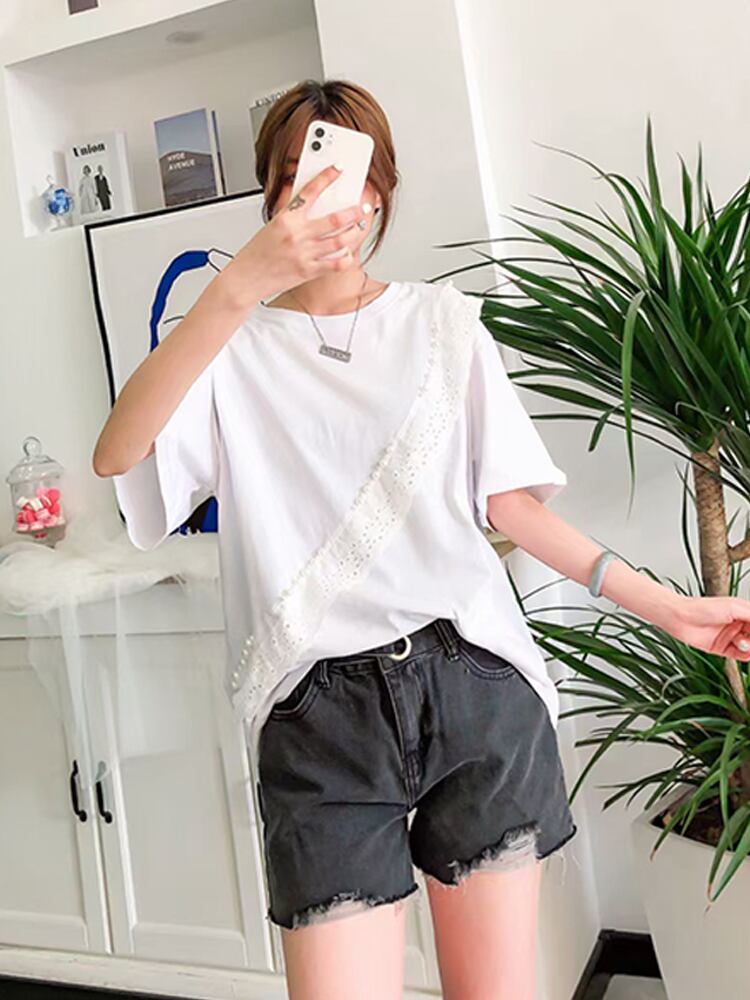 ラウンドネックレースルーズソリッド カラーTシャツ トップス 大きめサイズ Oネック ソリッドカラー ステッチ ミックスインファッション12155201727